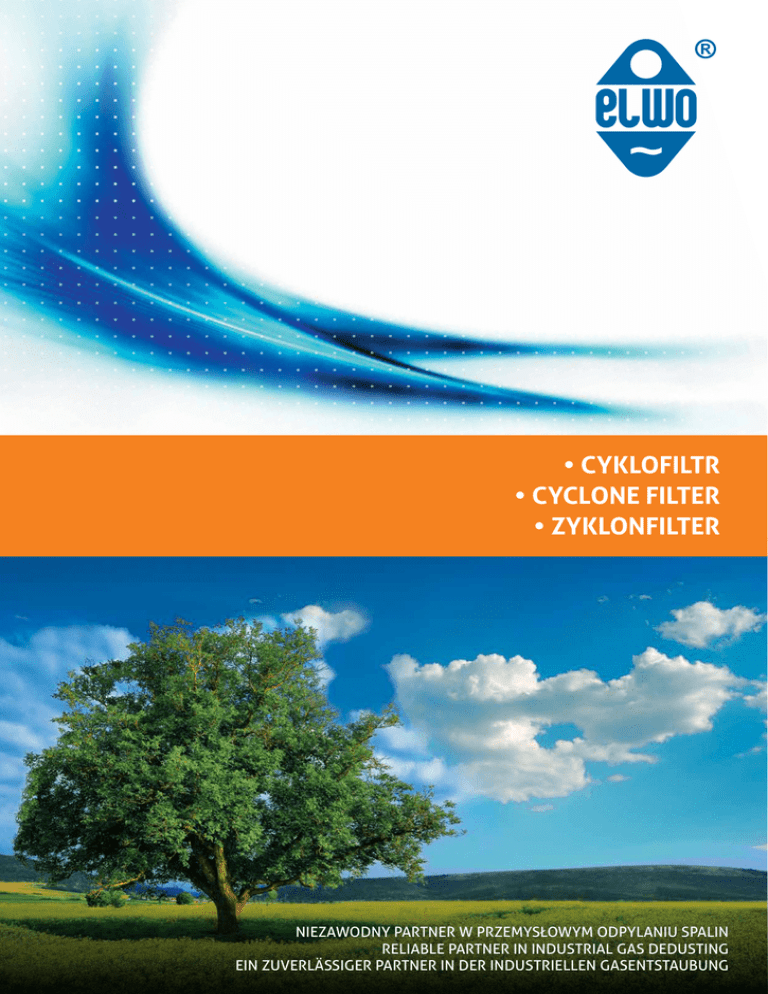 • CYKLOFILTR • CYCLONE FILTER • ZYKLONFILTER NIEZAWODNY PARTNER W PRZEMYSŁOWYM ODPYLANIU SPALIN RELIABLE PARTNER IN INDUSTRIAL GAS DEDUSTING EIN ZUVERLÄSSIGER PARTNER IN DER INDUSTRIELLEN GASENTSTAUBUNG CYKLOFILTR CYCLONE FILTER ZYKLONFILTER PL Cyklofiltr jest w pełni bezobsługowym hybrydowym filtrem składającym się z multicyklonu zbocznikowanego filtrem workowym pracującym w trybie oczyszczania worków ON-LINE. Zestaw ten jest wspomagany wentylatorem ośrodkowym z falownikiem wyrównującym różnicę oporów pomiędzy multicyklonem, a bocznikiem z filtru workowego. Filtr ten charakteryzuje niskie zużycie energii, wysoka niezawodność oraz łatwość obsługi. Cyklofitr zbudowany jest z dwóch ułożonych obok siebie indywidualnych komór, z których jedna jest multicyklonem, a druga filtrem workowym bocznikującym pierwszą. Wytrącony pył wraz z częścią gazu opuszcza cyklony przez lejki do leja zbiorczego, pozostała oczyszczona cześć gazu wychodzi przez rury wylotowe do kanału gazu czystego. Lej zbiorczy odpowietrzany jest poprzez filtr workowy, który zapobiega wtórnemu pyleniu w multicyklonie poprawiając jego skuteczność. Filtr workowy w celu kompensacji różnicy oporów obu części cyklofiltru wspomagany jest wentylatorem z płynną regulacją wydajności dla uzyskania optymalnych proporcji rozdziału gazu w multicyklonie. Filtr workowy podzielony jest na dwie części : cześć brudną (gaz pochodzący z wysypów cyklonów) oraz część czystą (oczyszczony gaz kierowany poprzez wentylator do kanału gazu czystego). Przedział komory gazu brudnego oddzielony jest od przedziału gazu czystego za pomocą płyty sitowej. Posiada ona na swojej powierzchni otwory, w których zawieszone zostaną worki filtracyjne i kosze wsporcze. Gaz brudny dostaje się do sekcji filtracyjnych i następnie przenika przez powierzchnię tkaniny filtracyjnej worków, pozostawiając cząsteczki pyłu na jej zewnętrznej warstwie. Gdy warstwa nagromadzonego w ten sposób pyłu (tzw. placek filtracyjny) ulegnie zwiększeniu, różnica ciśnienia mierzonego pomiędzy wlotem, a wylotem filtra również wzrasta do określonego poziomu ponad wartość nominalną, co wykrywane jest natychmiast przez system sterowania filtrem workowym. W tym momencie sterownik filtra uruchamia proces oczyszczania worków filtracyjnych. Pod komorami znajduje się lej pyłowy, który na jednej ze ścian posiada zabudowany właz kontrolny do celów okresowych rewizji jego wnętrza. Od góry, komory gazu czystego są zamknięte pokrywami włazowymi, dociskanymi do uszczelnienia komory odpowiednim systemem śrub dociskowych. Wielkość pokryw włazowych umożliwia ich zdejmowanie bez udziału wciągników. Pokrywy włazowe zabezpieczone są kasetami izolacyjnymi będącymi równocześnie dachem komory. Dostęp na dach zapewniony jest drabiną z podestu na wysokości łożysk konstrukcji wsporczej. Montaż i wymiana worków odbywa się od strony gazu czystego bez użycia specjalistycznych narzędzi. Cyklofiltr przeznaczony jest głównie do oczyszczania spalin z kotłów o mocy do 35MW. Podczas rozruchu całość spalin może być przepuszczana przez multicyklon z pominięciem worków (nie wymaga by-pasów). Wartość emisji pyłów na wylocie z filtra - poniżej 100mg/Nm3. The cyclone filter is a completely maintenance-free hybrid type filter consisting of a multi-cyclone shunted by a bag filter working in the bags cleaning on-line mode. The set is supported by the centrifugal fan with an inverter equalizing the resistance difference between the multi-cyclone and the bag filter shunt. This filter is characterized by low power consumption, high reliability and ease of use. The cyclone filter is composed of two individual chambers located side by side. One chamber is the multi-cyclone and the other is the bag filter that shunts the first one. The precipitated dust and a part of gas leave the cyclone through the funnels to the collecting hopper and the remaining purified part of the gas exits through the outlet pipes to the clean gas channel. The collecting hopper is vented through the bag filter that prevents secondary dusting in the multi-cyclone, improving its efficiency. In order to compensate the difference in resistance of the two parts of the cyclone filter, the bag filter is supported by a fan with stepless efficiency adjustment for optimum ratio of gas distribution in the multi-cyclone. The bag filter is divided into two parts: raw (gas from the cyclone discharge openings) and clean (purified gas directed through the fan to clean gas channel). A compartment of the raw gas chamber is separated from the clean gas compartment by sieve plate. It has openings on its surface, where the filter bags and supporting hoppers are suspended. Raw gas enters the filter sections and then passes through the surface of the bags fabric, leaving the dust particles on its outer layer. When a layer of the dust accumulated this way (the so-called filter cake) increases, the differential pressure measured between the filter inlet and the outlet also increases to a certain level above the nominal value, which is immediately detected by the bag filter control system. At this point, the filter controller starts the process of cleaning the filter bags. A dust hopper, located below the chambers, has mounted manholes in order to conduct periodic reviews of its interior. From the top, the clean gas chamber is closed with manhole covers, sealing the chamber by means of the appropriate system of set screws. The size of the manhole covers allows their removal without hoists. The manhole covers are secured with insulating cartridges, which at the same time constitute the roof of the chamber. Access to the roof is provided through a ladder from the platform at the height of the bearings of the supporting structure. The bags are installed and exchanged from the clean gas side without the use of special tools. The cyclone filter is desi