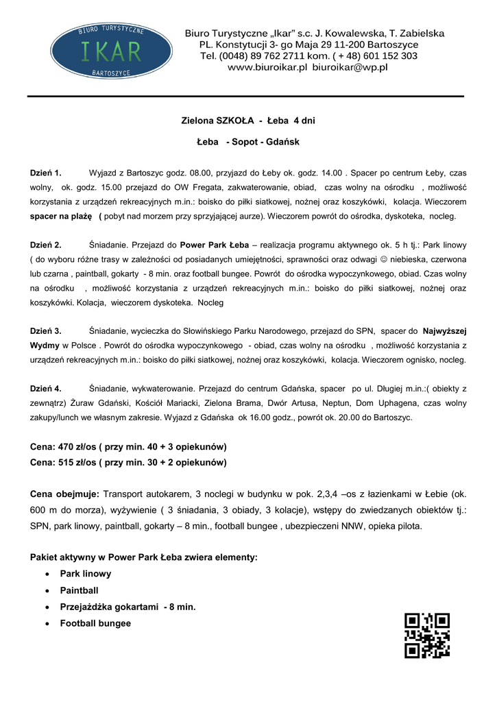 Zielona SZKOŁA - Łeba 4 dni Łeba - Sopot - Gdańsk Dzień 1. Wyjazd z Bartoszyc godz. 08.00, przyjazd do Łeby ok. godz. 14.00 . Spacer po centrum Łeby, czas wolny, ok. godz. 15.00 przejazd do OW Fregata, zakwaterowanie, obiad, czas wolny na ośrodku , możliwość korzystania z urządzeń rekreacyjnych m.in.: boisko do piłki siatkowej, nożnej oraz koszykówki, kolacja. Wieczorem spacer na plażę ( pobyt nad morzem przy sprzyjającej aurze). Wieczorem powrót do ośrodka, dyskoteka, nocleg. Dzień 2. Śniadanie. Przejazd do Power Park Łeba – realizacja programu aktywnego ok. 5 h tj.: Park linowy ( do wyboru różne trasy w zależności od posiadanych umiejętności, sprawności oraz odwagi niebieska, czerwona lub czarna , paintball, gokarty - 8 min. oraz football bungee. Powrót do ośrodka wypoczynkowego, obiad. Czas wolny na ośrodku , możliwość korzystania z urządzeń rekreacyjnych m.in.: boisko do piłki siatkowej, nożnej oraz koszykówki. Kolacja, wieczorem dyskoteka. Nocleg Dzień 3. Śniadanie, wycieczka do Słowińskiego Parku Narodowego, przejazd do SPN, spacer do Najwyższej Wydmy w Polsce . Powrót do ośrodka wypoczynkowego - obiad, czas wolny na ośrodku , możliwość korzystania z urządzeń rekreacyjnych m.in.: boisko do piłki siatkowej, nożnej oraz koszykówki, kolacja. Wieczorem ognisko, nocleg. Dzień 4. Śniadanie, wykwaterowanie. Przejazd do centrum Gdańska, spacer po ul. Długiej m.in.:( obiekty z zewnątrz) Żuraw Gdański, Kościół Mariacki, Zielona Brama, Dwór Artusa, Neptun, Dom Uphagena, czas wolny zakupy/lunch we własnym zakresie. Wyjazd z Gdańska ok 16.00 godz., powrót ok. 20.00 do Bartoszyc. Cena: 470 zł/os ( przy min. 40 + 3 opiekunów) Cena: 515 zł/os ( przy min. 30 + 2 opiekunów) Cena obejmuje: Transport autokarem, 3 noclegi w budynku w pok. 2,3,4 –os z łazienkami w Łebie (ok. 600 m do morza), wyżywienie ( 3 śniadania, 3 obiady, 3 kolacje), wstępy do zwiedzanych obiektów tj.: SPN, park linowy, paintball, gokarty – 8 min., football bungee , ubezpieczeni NNW, opieka pilota. Pakiet aktywny w Power Park Łeba zwiera elementy: Park linowy Paintball Przejażdżka gokartami - 8 min. Football bungee