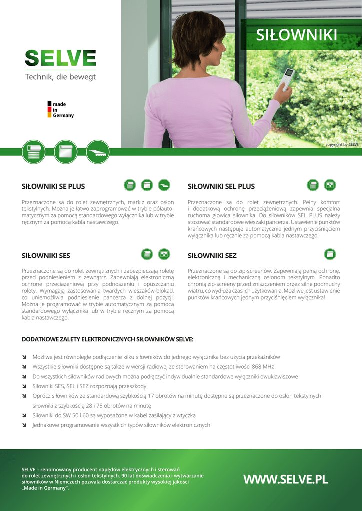 SIŁOWNIKI SIŁOWNIKI SE PLUS SIŁOWNIKI SEL PLUS Przeznaczone są do rolet zewnętrznych, markiz oraz osłon tekstylnych. Można je łatwo zaprogramować w trybie półautomatycznym za pomocą standardowego wyłącznika lub w trybie ręcznym za pomocą kabla nastawczego. Przeznaczone są do rolet zewnętrznych. Pełny komfort i dodatkową ochronę przeciążeniową zapewnia specjalna ruchoma głowica siłownika. Do siłowników SEL PLUS należy stosować standardowe wieszaki pancerza. Ustawienie punktów krańcowych następuje automatycznie jednym przyciśnięciem wyłącznika lub ręcznie za pomocą kabla nastawczego. SIŁOWNIKI SES SIŁOWNIKI SEZ Przeznaczone są do rolet zewnętrznych i zabezpieczają roletę przed podniesieniem z zewnątrz. Zapewniają elektroniczną ochronę przeciążeniową przy podnoszeniu i opuszczaniu rolety. Wymagają zastosowania twardych wieszaków-blokad, co uniemożliwia podniesienie pancerza z dolnej pozycji. Można je programować w trybie automatycznym za pomocą standardowego wyłącznika lub w trybie ręcznym za pomocą kabla nastawczego. Przeznaczone są do zip-screenów. Zapewniają pełną ochronę, elektroniczną i mechaniczną osłonom tekstylnym. Ponadto chronią zip-screeny przed zniszczeniem przez silne podmuchy wiatru, co wydłuża czas ich użytkowania. Możliwe jest ustawienie punktów krańcowych jednym przyciśnięciem wyłącznika! DODATKOWE ZALETY ELEKTRONICZNYCH SIŁOWNIKÓW SELVE: ÔÔ Możliwe jest równoległe podłączenie kilku siłowników do jednego wyłącznika bez użycia przekaźników ÔÔ Wszystkie siłowniki dostępne są także w wersji radiowej ze sterowaniem na częstotliwości 868 MHz ÔÔ Do wszystkich siłowników radiowych można podłączyć indywidualnie standardowe wyłączniki dwuklawiszowe ÔÔ Siłowniki SES, SEL i SEZ rozpoznają przeszkody ÔÔ Oprócz siłowników ze standardową szybkością 17 obrotów na minutę dostępne są przeznaczone do osłon tekstylnych siłowniki z szybkością 28 i 75 obrotów na minutę ÔÔ Siłowniki do SW 50 i 60 są wyposażone w kabel zasilający z wtyczką ÔÔ Jednakowe programowanie wszystkich typów siłowników elektronicznych SELVE – renomowany producent napędów elektrycznych i sterowań do rolet zewnętrznych i osłon tekstylnych. 90 lat doświadczenia i wytwarzanie siłowników w Niemczech pozwala dostarczać produkty wysokiej jakości „Made in Germany”. WWW.SELVE.PL