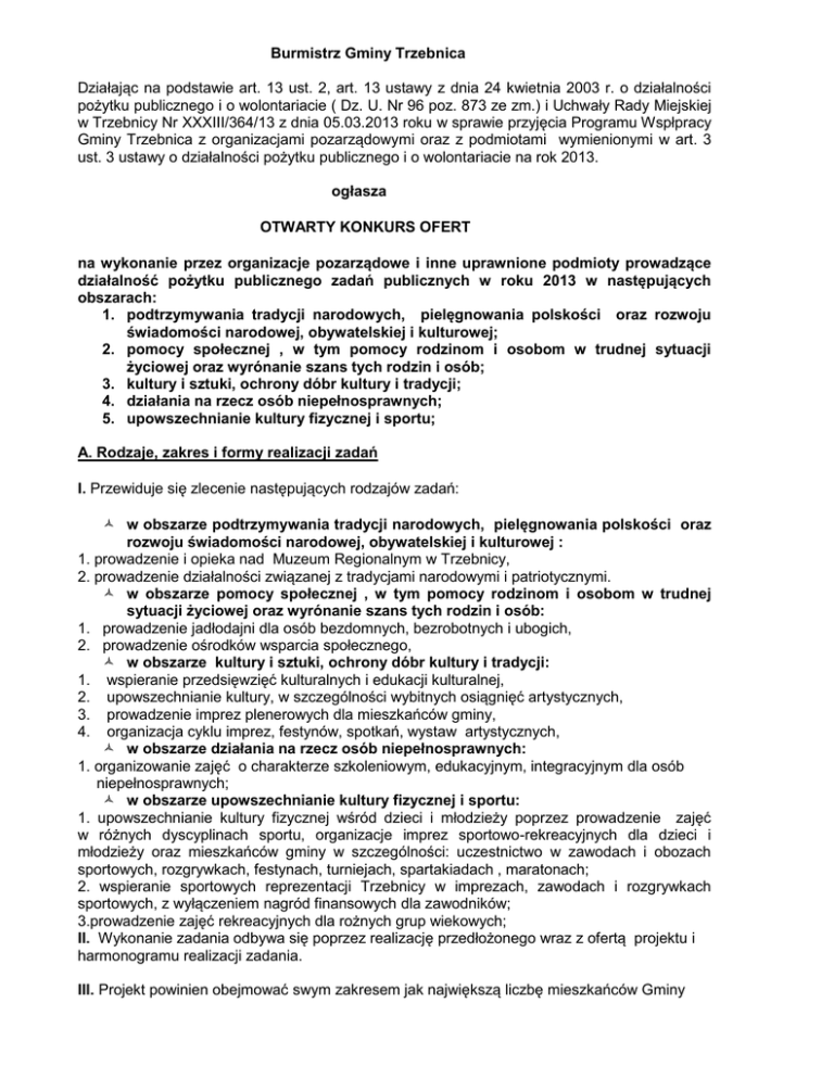 Burmistrz Gminy Trzebnica Działając na podstawie art. 13 ust. 2, art. 13 ustawy z dnia 24 kwietnia 2003 r. o działalności pożytku publicznego i o wolontariacie ( Dz. U. Nr 96 poz. 873 ze zm.) i Uchwały Rady Miejskiej w Trzebnicy Nr XXXIII/364/13 z dnia 05.03.2013 roku w sprawie przyjęcia Programu Wspłpracy Gminy Trzebnica z organizacjami pozarządowymi oraz z podmiotami wymienionymi w art. 3 ust. 3 ustawy o działalności pożytku publicznego i o wolontariacie na rok 2013. ogłasza OTWARTY KONKURS OFERT na wykonanie przez organizacje pozarządowe i inne uprawnione podmioty prowadzące działalność pożytku publicznego zadań publicznych w roku 2013 w następujących obszarach: 1. podtrzymywania tradycji narodowych, pielęgnowania polskości oraz rozwoju świadomości narodowej, obywatelskiej i kulturowej; 2. pomocy społecznej , w tym pomocy rodzinom i osobom w trudnej sytuacji życiowej oraz wyrónanie szans tych rodzin i osób; 3. kultury i sztuki, ochrony dóbr kultury i tradycji; 4. działania na rzecz osób niepełnosprawnych; 5. upowszechnianie kultury fizycznej i sportu; A. Rodzaje, zakres i formy realizacji zadań I. Przewiduje się zlecenie następujących rodzajów zadań: w obszarze podtrzymywania tradycji narodowych, pielęgnowania polskości oraz rozwoju świadomości narodowej, obywatelskiej i kulturowej : 1. prowadzenie i opieka nad Muzeum Regionalnym w Trzebnicy, 2. prowadzenie działalności związanej z tradycjami narodowymi i patriotycznymi. w obszarze pomocy społecznej , w tym pomocy rodzinom i osobom w trudnej sytuacji życiowej oraz wyrónanie szans tych rodzin i osób: 1. prowadzenie jadłodajni dla osób bezdomnych, bezrobotnych i ubogich, 2. prowadzenie ośrodków wsparcia społecznego, w obszarze kultury i sztuki, ochrony dóbr kultury i tradycji: 1. wspieranie przedsięwzięć kulturalnych i edukacji kulturalnej, 2. upowszechnianie kultury, w szczególności wybitnych osiągnięć artystycznych, 3. prowadzenie imprez plenerowych dla mieszkańców gminy, 4. organizacja cyklu imprez, festynów, spotkań, wystaw artystycznych, w obszarze działania na rzecz osób niepełnosprawnych: 1. organizowanie zajęć o charakterze szkoleniowym, edukacyjnym, integracyjnym dla osób niepełnosprawnych; w obszarze upowszechnianie kultury fizycznej i sportu: 1. upowszechnianie kultury fizycznej wśród dzieci i młodzieży poprzez prowadzenie zajęć w różnych dyscyplinach sportu, organizacje imprez sportowo-rekreacyjnych dla dzieci i młodzieży oraz mieszkańców gminy w szczególności: uczestnictwo w zawodach i obozach sportowych, rozgrywkach, festynach, turniejach, spartakiadach , maratonach; 2. wspieranie sportowych reprezentacji Trzebnicy w imprezach, zawodach i rozgrywkach sportowych, z wyłączeniem nagród finansowych dla zawodników; 3.prowadzenie zajęć rekreacyjnych dla rożnych grup wiekowych; II. Wykonanie zadania odbywa się poprzez realizację przedłożonego wraz z ofertą projektu i harmonogramu realizacji zadania. III. Projekt powinien obejmować swym zakresem jak największą liczbę mieszkańców Gminy Trzebnica. IV. Szczegółowe przedsięwzięcia zawarte w projekcie mogą być realizowane w dowolnych formach zapewniających ich najwyższą skuteczność. B. Wysokość środków przeznaczonych na realizację zadań w ramach otwartego konkursu ofert w roku 2013 i w roku poprzednim. Na realizacje zadań w poszczególnych obszarach konkursu przeznacza się: w obszarze podtrzymywania tradycji narodowych, pielęgnowania polskości oraz rozwoju świadomości narodowej, obywatelskiej i kulturowej – 30.000,00 zł, w obszarze pomocy społecznej, w tym pomocy rodzinom i osobom w trudnej sytuacji życiowej oraz wyrównanie szans tych rodzin i osób- 51.500,00 zł, w obszarze kultury i sztuki, ochrony dóbr kultury i tradycji - 30.000,00 zł, w obszarze działania na rzecz osób niepełnosprawnych – 10.000,00 zł, w obszarze upowszechnianie kultury fizycznej i sportu - 510.500,00 zł Podaje się do wiadomości, że suma dotacji przyznanych w ramach otwartych konkursów ofert na realizację zadań przez podmioty uprawnione w roku 2012 wynosiła: w obszarze podtrzymywania tradycji narodowych, pielęgnowania polskości oraz rozwoju świadomości narodowej, obywatelskiej i kulturowej - 20.000,00 zł, w obszarze pomocy społecznej, w tym pomocy rodzinom i osobom w trudnej sytuacji życiowej oraz wyrównanie szans tych rodzin i osób- 51.500,00 zł, w obszarze kultury i sztuki, ochrony dóbr kultury i tradycji - 30.000,00 zł, w obszarze działania na rzecz osób niepełnosprawnych – 10.000,00 zł, w obszarze upowszechnianie kultury fizycznej i sportu - 559.500,00 zł w obszarze nauki, edukacji, oświaty i wychowania – 3.500,00 zł, 3. Kwoty przeznaczone na realizację poszczególnych zadań mogą ulec zmniejszeniu w przypadku stwierdzenia, że zadania te można realizować mniejszym kosztem, złożone oferty nie uzyskają akceptacji Burmistrza Gminy, lub zaistnieje konieczność zmniejszenia budżetu Gminy Trzebnica w części przeznaczonej na realizację zadania z ważnych przyczyn, niemożliwych do przewidzenia w dniu ogłoszenia konkursu. C. Zasady przyznawania dotacji. 1. Rozpatrywane są wyłącznie oferty złożone w terminie określonym w ogłoszeniu. 2.Pierwszeństwo dotacji otrzymają wnioskodawcy, którzy przedstawią i zrealizują projekty obejmujące swoim zasięgiem największą liczbę mieszkańców gminy. W pozostałych przypadkach kwota dotacji może być podzielona pomiędzy wnioskodawców projektów o małym zasięgu oddziaływania. 3. Wysokość przyznanej dotacji może być niższa, niż wnioskowana w ofercie. W takim przypadku wnioskodawca może przyjąć zmniejszenie zakresu rzeczowego i kosztorysu zadania lub wycofać swoja ofertę. Zaktualizowany kosztorys wykonania zadania będzie stanowił załącznik do umowy. D. Termin i warunki realizacji zadania. 1. Zadanie winno być wykonane w roku 2013, przy czym początek realizacji 
