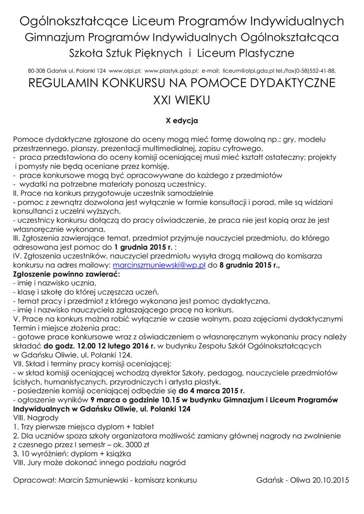 Ogólnokształcące Liceum Programów Indywidualnych Gimnazjum Programów Indywidualnych Ogólnokształcąca Szkoła Sztuk Pięknych i Liceum Plastyczne 80-308 Gdańsk ul. Polanki 124 www.olpi.pl; www.plastyk.gda.pl; e-mail: [email protected] tel./fax(0-58)552-41-88, REGULAMIN KONKURSU NA POMOCE DYDAKTYCZNE XXI WIEKU X edycja Pomoce dydaktyczne zgłoszone do oceny mogą mieć formę dowolną np.: gry, modelu przestrzennego, planszy, prezentacji multimedialnej, zapisu cyfrowego, - praca przedstawiona do oceny komisji oceniającej musi mieć kształt ostateczny; projekty i pomysły nie będą oceniane przez komisję, - prace konkursowe mogą być opracowywane do każdego z przedmiotów - wydatki na potrzebne materiały ponoszą uczestnicy. II. Prace na konkurs przygotowuje uczestnik samodzielnie - pomoc z zewnątrz dozwolona jest wyłącznie w formie konsultacji i porad, mile są widziani konsultanci z uczelni wyższych, - uczestnicy konkursu dołączą do pracy oświadczenie, że praca nie jest kopią oraz że jest własnoręcznie wykonana, III. Zgłoszenia zawierające temat, przedmiot przyjmuje nauczyciel przedmiotu, do którego adresowana jest pomoc do 1 grudnia 2015 r. : IV. Zgłoszenia uczestników, nauczyciel przedmiotu wysyła drogą mailową do komisarza konkursu na adres mailowy: [email protected] do 8 grudnia 2015 r., Zgłoszenie powinno zawierać: - imię i nazwisko ucznia, - klasę i szkołę do której uczęszcza uczeń, - temat pracy i przedmiot z którego wykonana jest pomoc dydaktyczna, - imię i nazwisko nauczyciela zgłaszającego pracę na konkurs. V. Prace na konkurs można robić wyłącznie w czasie wolnym, poza zajęciami dydaktycznymi Termin i miejsce złożenia prac: - gotowe prace konkursowe wraz z oświadczeniem o własnoręcznym wykonaniu pracy należy składać do godz. 12.00 12 lutego 2016 r. w budynku Zespołu Szkół Ogólnokształcących w Gdańsku Oliwie, ul. Polanki 124. VII. Skład i terminy pracy komisji oceniającej: - w skład komisji oceniającej wchodzą dyrektor Szkoły, pedagog, nauczyciele przedmiotów ścisłych, humanistycznych, przyrodniczych i artysta plastyk. - posiedzenie komisji oceniającej odbędzie się do 4 marca 2015 r. - ogłoszenie wyników 9 marca o godzinie 10.15 w budynku Gimnazjum i Liceum Programów Indywidualnych w Gdańsku Oliwie, ul. Polanki 124 VIII. Nagrody 1. Trzy pierwsze miejsca dyplom + tablet 2. Dla uczniów spoza szkoły organizatora możliwość zamiany głównej nagrody na zwolnienie z czesnego przez I semestr – ok. 3000 zł 3. 10 wyróżnień: dyplom + książka VIII. Jury może dokonać innego podziału nagród Opracował: Marcin Szmuniewski - komisarz konkursu Gdańsk - Oliwa 20.10.2015