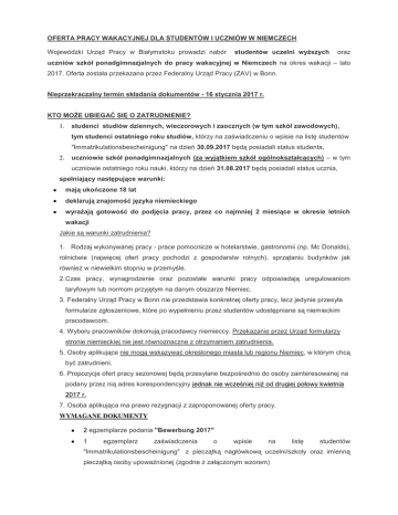 OFERTA PRACY WAKACYJNEJ DLA STUDENTÓW I UCZNIÓW W NIEMCZECH Wojewódzki Urząd Pracy w Białymstoku prowadzi nabór studentów uczelni wyższych oraz uczniów szkół ponadgimnazjalnych do pracy wakacyjnej w Niemczech na okres wakacji – lato 2017. Oferta została przekazana przez Federalny Urząd Pracy (ZAV) w Bonn. Nieprzekraczalny termin składania dokumentów - 16 stycznia 2017 r. KTO MOŻE UBIEGAĆ SIĘ O ZATRUDNIENIE? 1. studenci studiów dziennych, wieczorowych i zaocznych (w tym szkół zawodowych), tym studenci ostatniego roku studiów, którzy na zaświadczeniu o wpisie na listę studentów "Immatrikulationsbescheinigung" na dzień 30.09.2017 będą posiadali status studenta, 2. uczniowie szkół ponadgimnazjalnych (za wyjątkiem szkół ogólnokształcących) – w tym uczniowie ostatniego roku nauki, którzy na dzień 31.08.2017 będą posiadali status ucznia, spełniający następujące warunki: mają ukończone 18 lat deklarują znajomość języka niemieckiego wyrażają gotowość do podjęcia pracy, przez co najmniej 2 miesiące w okresie letnich wakacji Jakie są warunki zatrudnienia? 1. Rodzaj wykonywanej pracy - prace pomocnicze w hotelarstwie, gastronomii (np. Mc Donalds), rolnictwie (najwięcej ofert pracy pochodzi z gospodarstw rolnych), sprzątaniu budynków jak również w niewielkim stopniu w przemyśle. 2. Czas pracy, wynagrodzenie oraz pozostałe warunki pracy odpowiadają uregulowaniom taryfowym lub normom przyjętym na danym obszarze Niemiec. 3. Federalny Urząd Pracy w Bonn nie przedstawia konkretnej oferty pracy, lecz jedynie przesyła formularze zgłoszeniowe, które po wypełnieniu przez studentów udostępniane są niemieckim pracodawcom. 4. Wyboru pracowników dokonują pracodawcy niemieccy. Przekazanie przez Urząd formularzy stronie niemieckiej nie jest równoznaczne z otrzymaniem zatrudnienia. 5. Osoby aplikujące nie mogą wskazywać określonego miasta lub regionu Niemiec, w którym chcą być zatrudnieni. 6. Propozycje ofert pracy sezonowej będą przesyłane bezpośrednio do osoby zainteresowanej na podany przez nią adres korespondencyjny jednak nie wcześniej niż od drugiej połowy kwietnia 2017 r. 7. Osoba aplikująca ma prawo rezygnacji z zaproponowanej oferty pracy. WYMAGANE DOKUMENTY 2 egzemplarze podania "Bewerbung 2017" 1 egzemplarz zaświadczenia o wpisie na listę studentów "Immatrikulationsbescheinigung" z pieczątką nagłówkową uczelni/szkoły oraz imienną pieczątką osoby upoważnionej (zgodne z załączonym wzorem) 1 egzemplarz oświadczenia wyrażającego zgodę na przetwarzanie danych osobowych w związku z ubieganiem się o zatrudnienie za granicą 1 egzemplarz oświadczenia zawierającego informacje o pracy wakacyjnej w Niemczech wraz z oświadczeniem potwierdzającym otrzymanie, zapoznanie się i akceptację warunków zatrudnienia zawartych w informacji dla studentów „Ferienbeschäftigung in Deutschland für ausländische Studenten, Stand: Juni 2016” Studenci/uczniowie, którzy posiadają prawo jazdy winni do kompletu dokumentów dołączyć kopię prawa jazdy. Wymagane dokumenty oraz Informator dla studentów zagranicznych można pobrać na stronie https://wupbialystok.praca.gov.pl (Aktualności WUP) lub w Wojewódzkim Urzędzie Pracy, ul. Pogodna 22, pokój nr 13. DODATKOWE INFORMACJE: Wynagrodzenie płatne jest przeważnie na koniec miesiąca, dlatego w pierwszych tygodniach studenci/uczniowie powinni mieć wystarczającą ilość pieniędzy na utrzymanie. Student/uczeń powinien zabrać drugi egzemplarz zaświadczenia o wpisie na listę studentów dla pracodawcy, gdyż będzie on niezbędny przy zatrudnieniu i naliczeniu wynagrodzenia. Po przyjeździe do Niemiec student/uczeń ma obowiązek zameldowania się w ciągu 8 dni w administracji gminy lub miasta. Ponieważ studenci/uczniowie nie mają w Niemczech ustawowego ubezpieczenia chorobowego, powinni koniecznie zawrzeć umowę ubezpieczeniową w Polsce, w ramach której pokryte zostaną koszty ewentualnej choroby. Koszty dojazdu do miejsca pracy ponosi student/uczeń. Pracodawca nie ma obowiązku zapewnienia studentowi/uczniowi zakwaterowania, ale często pomaga w jego znalezieniu. W branżach takich jak rolnictwo, gastronomia pracodawca z reguły zapewnia zakwaterowanie (odpłatne lub nieodpłatne ). Studenci/uczniowie podejmujący zatrudnienie w gastronomii, przemyśle spożywczym itp. muszą liczyć się z koniecznością poddania się w Niemczech badaniom lekarskim na własny koszt. UWAGA! NIE BĘDĄ AKCEPTOWANE: Dokumenty bez stempla szkoły/uczelni Dokumenty z zeskanowanym/skopiowanym stemplem uczelni/szkoły Dokumenty, w których dokonano poprawek nie potwierdzonych podpisem i stemplem uczelni/szkoły Dokumenty, które zawierają zmiany/poprawki dokonane korektorem Dokumenty bez podpisu osoby uprawnionej oraz bez pieczęci imiennej JAK SKŁADAĆ DOKUMENTY? 1. OSOBIŚCIE – Wojewódzki Urząd Pracy, ul. Pogodna 22, pokój nr 13, w godz. 8.00 – 15.00 – aplikujący będą proszeni o okazanie legitymacji studenckiej/uczniowskiej 2. DROGĄ POCZTOWĄ - Wojewódzki Urząd Pracy, ul. Pogodna 22, 15-354 Białystok Z dopiskiem – praca wakacyjna dla studentów – Niemcy Nieprzekraczalny termin składania dokumentów - 16 stycznia 2017 r. Osoba do kontaktu: Pani Beata Chrościńska, Tel. 85 74 97 235/238 email: beata.chrościń[email protected]