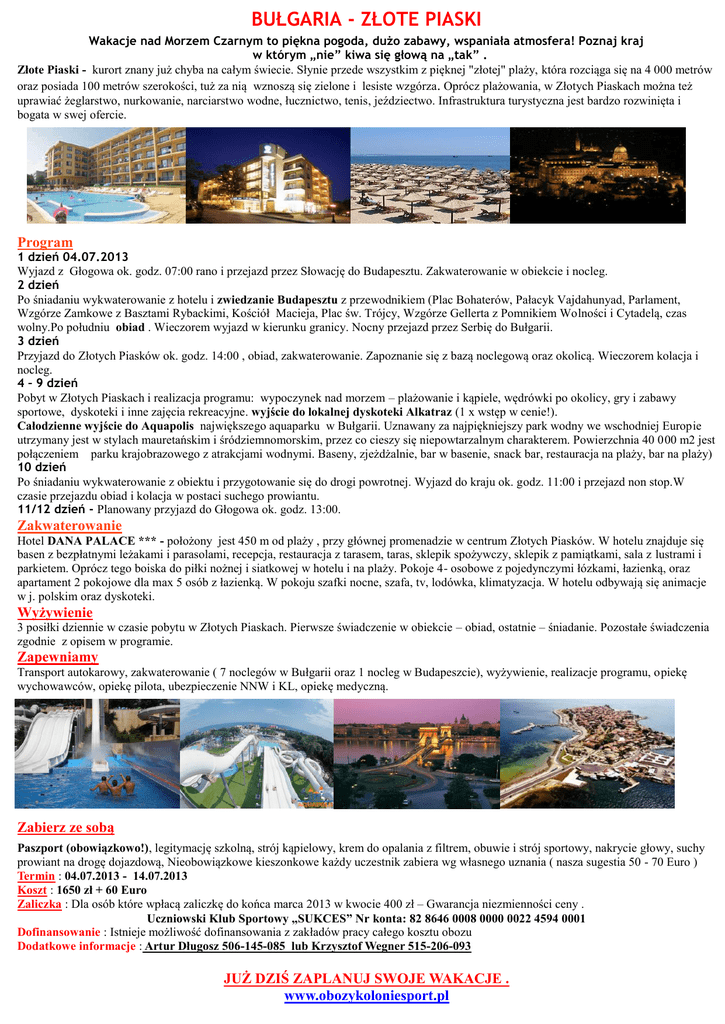 BUŁGARIA - ZŁOTE PIASKI Wakacje nad Morzem Czarnym to piękna pogoda, dużo zabawy, wspaniała atmosfera! Poznaj kraj w którym „nie” kiwa się głową na „tak” . Złote Piaski - kurort znany już chyba na całym świecie. Słynie przede wszystkim z pięknej "złotej" plaży, która rozciąga się na 4 000 metrów oraz posiada 100 metrów szerokości, tuż za nią wznoszą się zielone i lesiste wzgórza. Oprócz plażowania, w Złotych Piaskach można też uprawiać żeglarstwo, nurkowanie, narciarstwo wodne, łucznictwo, tenis, jeździectwo. Infrastruktura turystyczna jest bardzo rozwinięta i bogata w swej ofercie. Program 1 dzień 04.07.2013 Wyjazd z Głogowa ok. godz. 07:00 rano i przejazd przez Słowację do Budapesztu. Zakwaterowanie w obiekcie i nocleg. 2 dzień Po śniadaniu wykwaterowanie z hotelu i zwiedzanie Budapesztu z przewodnikiem (Plac Bohaterów, Pałacyk Vajdahunyad, Parlament, Wzgórze Zamkowe z Basztami Rybackimi, Kościół Macieja, Plac św. Trójcy, Wzgórze Gellerta z Pomnikiem Wolności i Cytadelą, czas wolny.Po południu obiad . Wieczorem wyjazd w kierunku granicy. Nocny przejazd przez Serbię do Bułgarii. 3 dzień Przyjazd do Złotych Piasków ok. godz. 14:00 , obiad, zakwaterowanie. Zapoznanie się z bazą noclegową oraz okolicą. Wieczorem kolacja i nocleg. 4 – 9 dzień Pobyt w Złotych Piaskach i realizacja programu: wypoczynek nad morzem – plażowanie i kąpiele, wędrówki po okolicy, gry i zabawy sportowe, dyskoteki i inne zajęcia rekreacyjne. wyjście do lokalnej dyskoteki Alkatraz (1 x wstęp w cenie!). Całodzienne wyjście do Aquapolis największego aquaparku w Bułgarii. Uznawany za najpiękniejszy park wodny we wschodniej Europie utrzymany jest w stylach mauretańskim i śródziemnomorskim, przez co cieszy się niepowtarzalnym charakterem. Powierzchnia 40 000 m2 jest połączeniem parku krajobrazowego z atrakcjami wodnymi. Baseny, zjeżdżalnie, bar w basenie, snack bar, restauracja na plaży, bar na plaży) 10 dzień Po śniadaniu wykwaterowanie z obiektu i przygotowanie się do drogi powrotnej. Wyjazd do kraju ok. godz. 11:00 i przejazd non stop.W czasie przejazdu obiad i kolacja w postaci suchego prowiantu. 11/12 dzień - Planowany przyjazd do Głogowa ok. godz. 13:00. Zakwaterowanie Hotel DANA PALACE *** - położony jest 450 m od plaży , przy głównej promenadzie w centrum Złotych Piasków. W hotelu znajduje się basen z bezpłatnymi leżakami i parasolami, recepcja, restauracja z tarasem, taras, sklepik spożywczy, sklepik z pamiątkami, sala z lustrami i parkietem. Oprócz tego boiska do piłki nożnej i siatkowej w hotelu i na plaży. Pokoje 4- osobowe z pojedynczymi łózkami, łazienką, oraz apartament 2 pokojowe dla max 5 osób z łazienką. W pokoju szafki nocne, szafa, tv, lodówka, klimatyzacja. W hotelu odbywają się animacje w j. polskim oraz dyskoteki. Wyżywienie 3 posiłki dziennie w czasie pobytu w Złotych Piaskach. Pierwsze świadczenie w obiekcie – obiad, ostatnie – śniadanie. Pozostałe świadczenia zgodnie z opisem w programie. Zapewniamy Transport autokarowy, zakwaterowanie ( 7 noclegów w Bułgarii oraz 1 nocleg w Budapeszcie), wyżywienie, realizacje programu, opiekę wychowawców, opiekę pilota, ubezpieczenie NNW i KL, opiekę medyczną. Zabierz ze sobą Paszport (obowiązkowo!), legitymację szkolną, strój kąpielowy, krem do opalania z filtrem, obuwie i strój sportowy, nakrycie głowy, suchy prowiant na drogę dojazdową, Nieobowiązkowe kieszonkowe każdy uczestnik zabiera wg własnego uznania ( nasza sugestia 50 - 70 Euro ) Termin : 04.07.2013 - 14.07.2013 Koszt : 1650 zł + 60 Euro Zaliczka : Dla osób które wpłacą zaliczkę do końca marca 2013 w kwocie 400 zł – Gwarancja niezmienności ceny . Uczniowski Klub Sportowy „SUKCES” Nr konta: 82 8646 0008 0000 0022 4594 0001 Dofinansowanie : Istnieje możliwość dofinansowania z zakładów pracy całego kosztu obozu Dodatkowe informacje : Artur Długosz 506-145-085 lub Krzysztof Wegner 515-206-093 JUŻ DZIŚ ZAPLANUJ SWOJE WAKACJE . www.obozykoloniesport.pl