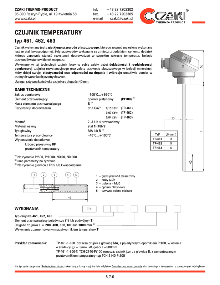CZAKI THERMO-PRODUCT 05-090 Raszyn-Rybie, ul. 19 Kwietnia 58 www.czaki.pl tel. +48 22 7202302 fax. +48 22 7202305 e-mail [email protected] CZUJNIK TEMPERATURY typ 461, 462, 463 55 Czujnik wykonany jest z giętkiego przewodu płaszczowego, którego zewnętrzna osłona wykonana jest ze stali kwasoodpornej. Żyły przewodów wykonane są z miedzi z dodatkiem cyrkonu, dodatek którego zapewnia stałość rezystancji doprowadzeń w szerokim zakresie temperatur. Izolację przewodów stanowi tlenek magnezu. Wykonany w tej technologii czujnik łączy w sobie zalety dużej dokładności i rozdzielczości pomiarowej czujnika rezystancyjnego oraz zalety przewodu płaszczowego w izolacji mineralnej, który dzięki swojej elastyczności oraz odporności na drgania i wibracje umożliwia pomiar w trudnych warunkach przemysłowych. Uwaga: sztywna końcówka czujnika o długości 40 mm. DANE TECHNICZNE –100°C...+550°C opornik platynowy (Pt100) (1) B (2) drut CuZr 0,15 W/m (TP-461) 0,07 W/m (TP-462) 0,04 W/m (TP-463) 2 ,3 lub 4 przewodowy stal 1H18N9T MA lub B (3) –40°C...+100°C Montaż Materiał osłony Typ głowicy Temperatura pracy głowicy Wyposażenie dodatkowe króciec przesuwny KP przetwornik temperatury Æ L Zakres pomiarowy Element przetwarzający Klasa elementu przetwarzającego Rezystancja doprowadzeń TYP Æ (mm) TP-461 TP-462 TP-463 3 5 6 (1) Na życzenie Pt500, Pt1000, Ni100, Ni1000 Inne parametry na życzenie (3) Na życzenie głowica z IP65 lub kwasoodporna 1 2 3 4 40 (2) 5 1 2 3 4 5 – giętki przewód płaszczowy – druty CuZr – izolacja – MgO – opornik platynowy – sztywna osłona stalowa 40 WYKONANIA TP Typ czujnika 461, 462, 463 Element przetwarzający pojedynczy (1) lub podwójny (2) Długość czujnika L = 200, 400, 600, 800 lub 1000 mm (2) Wykonanie z zamontowanym przetwornikiem temperatury T Przykład zamawiania: TP-461-1-800 oznacza czujnik z głowicą MA, z pojedynczym opornikiem Pt100, w osłonie o średnicy Æ = 3mm i długości L=800mm TP-461-1-800-T; TCH-2140-Pt100 oznacza: czujnik j.w. , z głowicą B, z zamontowanym przetwornikiem temperatury typ TCH-2140-Pt100 Na życzenie bezpłatne Świadectwo jakości określające klasę czujnika lub odpłatne Świadectwo wzorcowania dla dowolnych temperatur z oznaczonymi odchyłkami 5.7.0