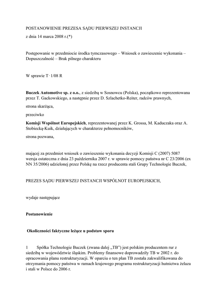 POSTANOWIENIE PREZESA SĄDU PIERWSZEJ INSTANCJI z dnia 14 marca 2008 r.(*) Postępowanie w przedmiocie środka tymczasowego – Wniosek o zawieszenie wykonania – Dopuszczalność – Brak pilnego charakteru W sprawie T‑1/08 R Buczek Automotive sp. z o.o., z siedzibą w Sosnowcu (Polska), początkowo reprezentowana przez T. Gackowskiego, a następnie przez D. Szlachetko-Reiter, radców prawnych, strona skarżąca, przeciwko Komisji Wspólnot Europejskich, reprezentowanej przez K. Grossa, M. Kaduczaka oraz A. Stobiecką-Kuik, działających w charakterze pełnomocników, strona pozwana, mającej za przedmiot wniosek o zawieszenie wykonania decyzji Komisji C (2007) 5087 wersja ostateczna z dnia 23 października 2007 r. w sprawie pomocy państwa nr C 23/2006 (ex NN 35/2006) udzielonej przez Polskę na rzecz producenta stali Grupy Technologie Buczek, PREZES SĄDU PIERWSZEJ INSTANCJI WSPÓLNOT EUROPEJSKICH, wydaje następujące Postanowienie Okoliczności faktyczne leżące u podstaw sporu 1 Spółka Technologie Buczek (zwana dalej „TB”) jest polskim producentem rur z siedzibą w województwie śląskim. Problemy finansowe doprowadziły TB w 2002 r. do opracowania planu restrukturyzacji. W oparciu o ten plan TB została zakwalifikowana do otrzymania pomocy państwa w ramach krajowego programu restrukturyzacji hutnictwa żelaza i stali w Polsce do 2006 r. 2 Wchodząca w skład grupy przedsiębiorstw TB była spółką dominującą kilku przedsiębiorstw zależnych, w tym Huty Buczek i skarżącej. W sierpniu 2006 r. została ogłoszona upadłość TB, ale spółce umożliwiono dalsze prowadzenie działalności gospodarczej. 3 Akt dotyczący warunków przystąpienia Republiki Czeskiej, Republiki Estońskiej, Republiki Cypryjskiej, Republiki Łotewskiej, Republiki Litewskiej, Republiki Węgierskiej, Republiki Malty, Rzeczypospolitej Polskiej, Republiki Słowenii i Republiki Słowackiej oraz dostosowań w Traktatach stanowiących podstawę Unii Europejskiej (Dz.U. 2003, L 236, s. 33) zawiera protokoły, które na mocy art. 60 tego Aktu stanowią jego integralną część i wśród których znajduje się protokół nr 8 w sprawie restrukturyzacji polskiego hutnictwa żelaza i stali (Dz.U. 2003, L 236, s. 948, zwany dalej „protokołem nr 8”). 4 Punkt 1 protokołu nr 8 wymienia warunki, w jakich pomoc państwa przyznawaną przez Polskę na restrukturyzację poszczególnych sektorów polskiego hutnictwa żelaza i stali uznaje się za zgodną ze wspólnym rynkiem. Protokół ten dopuszczał przyznawanie do 2003 r. pomocy państwa między innymi na rzecz grupy TB, dokonywane w oparciu o prawidłowe wprowadzenie w życie planu restrukturyzacji mającego na celu przywrócenie rentowności przedsiębiorstwa. Oprócz tego protokół nr 8 wyraźnie zakazuje przyznawania jakiejkolwiek pomocy na restrukturyzację od końca 2003 r. do końca 2006 r. Zgodnie z pkt 18 protokołu nr 8 Komisja podejmuje odpowiednie środki w celu zmuszenia przedsiębiorstw, których to dotyczy, do zwrotu wszelkiej pomocy przyznanej z naruszeniem warunków ustanowionych w tym protokole. 5 Po zakończeniu formalnego postępowania wyjaśniającego wszczętego na mocy art. 88 ust. 2 WE Komisja w dniu 23 października 2007 r. wydała decyzję C (2007) 5087 wersja ostateczna w sprawie pomocy państwa nr C 23/2006 (ex NN 35/2006) udzielonej przez Polskę na rzecz producenta stali Grupy Technologie Buczek (zwaną dalej „zaskarżoną decyzją”). 6 W decyzji tej Komisja stwierdziła, że TB uzyskała pomoc państwa polegającą na tym, iż pewne polskie organy publicznoprawne nie ściągały od niej swoich wierzytelności (składek na ubezpieczenie społeczne i podatków). Komisja stwierdziła, że pomoc ta została przyznana na warunkach, których prywatny wierzyciel działający w warunkach rynkowych nie zaakceptowałby, ponieważ, mimo trudnej sytuacji TB, wierzyciele publiczni odroczyli spłatę wierzytelności w wysokości 20 761 643 złotych polskich (PLN), czyli około 5,8 mln EUR. Komisja twierdzi, iż w związku z tym, że wierzyciele ci posiadali zabezpieczenia na majątku TB, z których mogli skorzystać, oraz że poprzednio podejmowane próby restrukturyzacji nie powiodły się, a perspektywy poprawy sytuacji TB były ograniczone, wierzyciel prywatny w podobnej sytuacji zażądałby zwrotu długu. 7 Przypominając, że przed ogłoszeniem upadłości TB przekazała całą rentowną działalność swoim przedsiębiorstwom zależnym, Komisja nakazała w szczególności tym ostatnim zwrot odpowiedniej części spornej pomocy z powodu tego, iż uzyskały z niej korzyści. Komisja twierdzi, że TB mogła w znacznym stopniu dokapitalizować skarżącą, ponieważ, co najmniej od początku 2005 r., nie odzyskano skutecznie od TB żadnych wierzytelności publicznych, chociaż to odzyskiwanie doprowadziło wcześniej do ogłoszenia jej upadłości. 8 Komisja dodała, że skarżąca przejęła od TB działalność w sektorze rur aluminiowych i chromowanych. W tym celu pracownicy TB zostali przeniesieni do przedsiębiorstwa skarżącej, a przedsiębiorstwo zostało dokapitalizowane kwotą 1,55 mln PLN. Ponadto skarżąca dzierżawi od TB, na podstawie umowy zawartej na czas nieokreślony, aktywa produkcyjne wykorzystywane do produkcji układów wydechowych na potrzeby przemysłu motoryzacyjnego. Na tej podstawie Komisja uznała, że skarżąca w oczywisty sposób korzysta z inwestycji zrealizowanych przez TB dzięki pomocy państwa przyznanej w odniesieniu do tych aktywów. 9 W art. 1 zaskarżonej decyzji Komisja stwierdza, że pomoc państwa w wysokości 20 761 643 PLN, przyznana bezprawnie przez Polskę na rzecz grupy TB, jest niezgodna ze wspólnym rynkiem. 10 W art. 3 ust. 1 i 3 zaskarżonej decyzji Komisja nakazuje Polsce odzyskanie tej kwoty, powiększonej o odsetki za zwłokę, i wyjaśnia, że należy ją odzyskać w szczególności od spółek zależnych, proporcjonalnie do faktycznie otrzymanej przez nie pomocy, czy