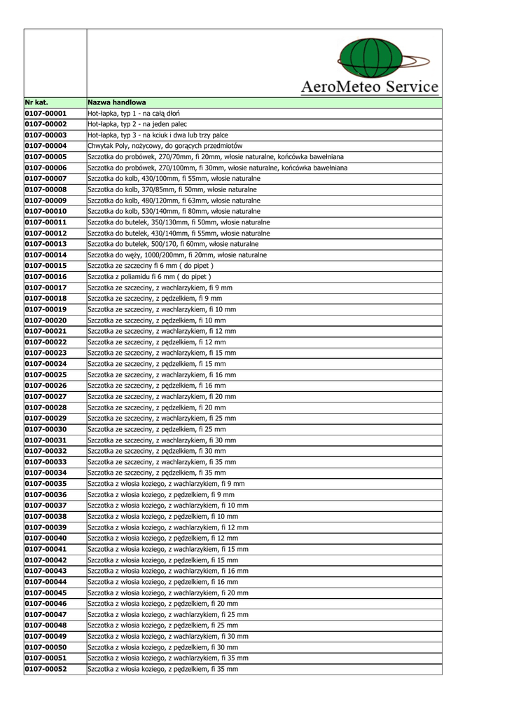 Nr kat. Nazwa handlowa 0107-00001 Hot-łapka, typ 1 - na całą dłoń 0107-00002 Hot-łapka, typ 2 - na jeden palec 0107-00003 Hot-łapka, typ 3 - na kciuk i dwa lub trzy palce 0107-00004 Chwytak Poly, nożycowy, do gorących przedmiotów 0107-00005 Szczotka do probówek, 270/70mm, fi 20mm, włosie naturalne, końcówka bawełniana 0107-00006 Szczotka do probówek, 270/100mm, fi 30mm, włosie naturalne, końcówka bawełniana 0107-00007 Szczotka do kolb, 430/100mm, fi 55mm, włosie naturalne 0107-00008 Szczotka do kolb, 370/85mm, fi 50mm, włosie naturalne 0107-00009 Szczotka do kolb, 480/120mm, fi 63mm, włosie naturalne 0107-00010 Szczotka do kolb, 530/140mm, fi 80mm, włosie naturalne 0107-00011 Szczotka do butelek, 350/130mm, fi 50mm, włosie naturalne 0107-00012 Szczotka do butelek, 430/140mm, fi 55mm, włosie naturalne 0107-00013 Szczotka do butelek, 500/170, fi 60mm, włosie naturalne 0107-00014 Szczotka do węży, 1000/200mm, fi 20mm, włosie naturalne 0107-00015 Szczotka ze szczeciny fi 6 mm ( do pipet ) 0107-00016 Szczotka z poliamidu fi 6 mm ( do pipet ) 0107-00017 Szczotka ze szczeciny, z wachlarzykiem, fi 9 mm 0107-00018 Szczotka ze szczeciny, z pędzelkiem, fi 9 mm 0107-00019 Szczotka ze szczeciny, z wachlarzykiem, fi 10 mm 0107-00020 Szczotka ze szczeciny, z pędzelkiem, fi 10 mm 0107-00021 Szczotka ze szczeciny, z wachlarzykiem, fi 12 mm 0107-00022 Szczotka ze szczeciny, z pędzelkiem, fi 12 mm 0107-00023 Szczotka ze szczeciny, z wachlarzykiem, fi 15 mm 0107-00024 Szczotka ze szczeciny, z pędzelkiem, fi 15 mm 0107-00025 Szczotka ze szczeciny, z wachlarzykiem, fi 16 mm 0107-00026 Szczotka ze szczeciny, z pędzelkiem, fi 16 mm 0107-00027 Szczotka ze szczeciny, z wachlarzykiem, fi 20 mm 0107-00028 Szczotka ze szczeciny, z pędzelkiem, fi 20 mm 0107-00029 Szczotka ze szczeciny, z wachlarzykiem, fi 25 mm 0107-00030 Szczotka ze szczeciny, z pędzelkiem, fi 25 mm 0107-00031 Szczotka ze szczeciny, z wachlarzykiem, fi 30 mm 0107-00032 Szczotka ze szczeciny, z pędzelkiem, fi 30 mm 0107-00033 Szczotka ze szczeciny, z wachlarzykiem, fi 35 mm 0107-00034 Szczotka ze szczeciny, z pędzelkiem, fi 35 mm 0107-00035 Szczotka z włosia koziego, z wachlarzykiem, fi 9 mm 0107-00036 Szczotka z włosia koziego, z pędzelkiem, fi 9 mm 0107-00037 Szczotka z włosia koziego, z wachlarzykiem, fi 10 mm 0107-00038 Szczotka z włosia koziego, z pędzelkiem, fi 10 mm 0107-00039 Szczotka z włosia koziego, z wachlarzykiem, fi 12 mm 0107-00040 Szczotka z włosia koziego, z pędzelkiem, fi 12 mm 0107-00041 Szczotka z włosia koziego, z wachlarzykiem, fi 15 mm 0107-00042 Szczotka z włosia koziego, z pędzelkiem, fi 15 mm 0107-00043 Szczotka z włosia koziego, z wachlarzykiem, fi 16 mm 0107-00044 Szczotka z włosia koziego, z pędzelkiem, fi 16 mm 0107-00045 Szczotka z włosia koziego, z wachlarzykiem, fi 20 mm 0107-00046 Szczotka z włosia koziego, z pędzelkiem, fi 20 mm 0107-00047 Szczotka z włosia koziego, z wachlarzykiem, fi 25 mm 0107-00048 Szczotka z włosia koziego, z pędzelkiem, fi 25 mm 0107-00049 Szczotka z włosia koziego, z wachlarzykiem, fi 30 mm 0107-00050 Szczotka z włosia koziego, z pędzelkiem, fi 30 mm 0107-00051 Szczotka z włosia koziego, z wachlarzykiem, fi 35 mm 0107-00052 Szczotka z włosia koziego, z pędzelkiem, fi 35 mm 0107-00053 Szczotka z poliamidu, z wachlarzykiem, fi 9 mm 0107-00054 Szczotka z poliamidu, z pędzelkiem, fi 9 mm 0107-00055 Szczotka z poliamidu, z wachlarzykiem, fi 10 mm 0107-00056 Szczotka z poliamidu, z pędzelkiem, fi 10 mm 0107-00057 Szczotka z poliamidu, z wachlarzykiem, fi 12 mm 0107-00058 Szczotka z poliamidu, z pędzelkiem, fi 12 mm 0107-00059 Szczotka z poliamidu, z wachlarzykiem, fi 15 mm 0107-00060 Szczotka z poliamidu, z pędzelkiem, fi 15 mm 0107-00061 Szczotka z poliamidu, z wachlarzykiem, fi 16 mm 0107-00062 Szczotka z poliamidu, z pędzelkiem, fi 16 mm 0107-00063 Szczotka z poliamidu, z wachlarzykiem, fi 20 mm 0107-00064 Szczotka z poliamidu, z pędzelkiem, fi 20 mm 0107-00065 Szczotka z poliamidu, z wachlarzykiem, fi 25 mm 0107-00066 Szczotka z poliamidu, z pędzelkiem, fi 25 mm 0107-00067 Szczotka z poliamidu, z wachlarzykiem, fi 30 mm 0107-00068 Szczotka z poliamidu, z pędzelkiem, fi 30 mm 0107-00069 Szczotka z poliamidu, z wachlarzykiem, fi 35 mm 0107-00070 Szczotka z poliamidu, z pędzelkiem, fi 35 mm 0107-00071 Szczotka ze szczeciny, z pędzelkiem, fi 40 mm 0107-00072 Szczotka ze szczeciny, z pędzelkiem, fi 45 mm 0107-00073 Szczotka ze szczeciny, z pędzelkiem, fi 50 mm 0107-00074 Szczotka ze szczeciny, z pędzelkiem, fi 60 mm 0107-00075 Szczotka ze szczeciny, z pędzelkiem, fi 70 mm 0107-00076 Szczotka ze szczeciny, z pędzelkiem, fi 80 mm 0107-00077 Szczotka z włosia koziego, z pędzelkiem, fi 40 mm 0107-00078 Szczotka z włosia koziego, z pędzelkiem, fi 45 mm 0107-00079 Szczotka z włosia koziego, z pędzelkiem, fi 50 mm 0107-00080 Szczotka z poliamidu, z pędzelkiem, fi 40 mm 0107-00081 Szczotka z poliamidu, z pędzelkiem, fi 45 mm 0107-00082 Szczotka z poliamidu, z pędzelkiem, fi 50 mm 0107-00083 Szczotka z poliamidu, z pędzelkiem, fi 60 mm 0107-00084 Szczotka z poliamidu, z pędzelkiem, fi 70 mm 0107-00085 Szczotka z poliamidu, z pędzelkiem, fi 80 mm 0141-00001 Płyta ociekowa, PS, z rynienką, 450 x 630, 72 kołki 15x 100 mm 0141-00002 Kołki 15 x 100 mm do płyty ociekowej PS, opak. 11 szt. 0141-00003 Płyta ociekowa, PVC, z rynienką, 450 x 630 mm, 75 kołków metal. pokrytych PE 0141-00004 Płyta ociekowa metalowa, 420 x 610 x 160 mm, 65 stanowisk 0141-00005 Płyta ociekowa metalowa, 420 x 610 x 160 mm, 44 stanowiska 0141-00006 Płyta ociekowa, PVC, z rynienką, 600 x 600 mm, kołki: 15szt.x 60 mm, 56szt. x 100 mm, 6szt.x 150 mm 0141-00007 Płyta ociekowa, PVC, z rynienką, 500 x 500 mm, kołki: 10szt.x 60 mm, 39szt. x 100 mm, 4szt.x 150 mm 0141-00008 Płyta ociekowa, PVC, z rynienką, 400 x 400 mm, kołki: 5szt.x 60 mm, 26szt. x 100 mm, 2szt.x 150 mm 0141-00009 Woreczki SteriBag 60 ml, 76 x 127 mm, opak. 500 szt. 014