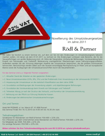 Novellierung des Umsatzsteuergesetzes im Jahre 2011 Wir laden Sie herzlich zu einem Seminar ein, auf dem wir Sie mit den Änderungen im Umsatzsteuergesetz bekannt machen wollen, mit denen ab dem 01.01.2011 zu rechnen ist. Die Änderungen umfassen viele Bereiche, die für die Steuerpflichtigen von großer Bedeutung sind, z.B. Höhe der Steuersätze, Umfang der Befreiungen, Vorsteuerabzug beim Erwerb von Fahrzeugen und Treibstoff, Besteuerung unentgeltlicher Überlassungen sowie Fakturierungsgrundsätze. Außerdem werden bei der Schulung diejenigen Aspekte der Umsatzsteuer besprochen, die die größten Kontroversen hervorrufen. Berücksichtigt werden dabei auch die neueste einschlägige Rechtsprechung (in Polen und auf europäischer Ebene) sowie die Auslegungen der Umsatzsteuervorschriften durch die Steuerbehörden. Für das Seminar sind u.a. folgende Themen vorgesehen: > 1. Aktueller Stand der Arbeiten an den geplanten Änderungen. > 2. Neue Umsatzsteuersätze (23%, 8%, 5%) und die Problematik ihrer Anwendung an der Jahreswende 2010/2011. > 3. Anpassung der Umsatzsteuer an die statistisch Klassifikation aus dem Jahre 2008. > 4. Grundsätze und Bedingungen der Anwendung subjekt- und objektbezogener Befreiungen. > 5. Grundsätze des Vorsteuerabzugs beim Erwerb von Fahrzeugen und Treibstoff. > 6. Teilweiser Abzug, je nach der Struktur des Verkaufs, und Korrektur der Umsatzsteuererklärung. > 7. Befreiung von der Pflicht zur Führung fiskalischer Kassen. > 8. Änderungen bei elektronischen Umsatzsteuerrechnungen. Ort und Termin Hotel NH POZNAÑ, ul. œw. Marcin 67, 61-806 Poznañ Das Seminar Finder Am 16.12.2010 von 9.00 Uhr bis 16.30 Uhr statt. Teilnahmegebühren Sonderpreis für Mandanten von Rödl & Partner: PLN 400 + 22% USt. Für 2 Personen aus dem Unternehmen eines Mandanten von Rödl & Partner: PLN 600 + 22% USt. Für Mitglieder der DWK: PLN 400 + 22% USt. Für sonstige Personen: PLN 500 + 22% USt. Bitten schicken Sie Ihre Teilnahmebestätigung bis zum 09.12.2010 an: [email protected]. Rödl & Partner | ul. Górki 7 | 60-204 Poznań | +48 (61) 62 44 900 www.roedl.pl Nowelizacja podatku VAT na 2011 rok Zgłoszenie uczestnictwa w seminarium: Nowelizacja podatku VAT na 2011 rok Hotel NH POZNAŃ, ul. św. Marcin 67, 61-806 Poznań, 16.12.2010 Dane uczestników: 1) ............................................................. .................................... ...................................................... imię i nazwisko tel. e-mail 2) ............................................................. .................................... ...................................................... imię i nazwisko tel. e-mail Nazwa firmy: ............................................................................................................................................ Adres: ..................................................................................................................................................... NIP: ............................................ Tel.: .......................................... Fax: ................................................... Warunki uczestnictwa: 1. Koszt udziału w seminarium wynosi: >Cena specjalna dla Klientów Rödl & Partner 400 PLN + 22% VAT >Dla 2 osób z firmy Klienta Rödl & Partner 600 PLN + 22% VAT >Dla członków DWK 400 PLN + 22% VAT >Dla pozostałych osób 500 PLN + 22% VAT Cena obejmuje: uczestnictwo, materiały szkoleniowe, obiad oraz przerwy kawowe w trakcie trwania seminarium. 2. 3. 4. Podstawą wzięcia udziału w seminarium jest przesłanie formularza zgłoszenia e-mailem na adres [email protected] lub na numer faksu: (61) 86 44 901 najpóźniej do dnia 09.12.2010. Za uczestnictwo w szkoleniu otrzymają Państwo fakturę. W ciągu 7 dni po otrzymaniu faktury należy dokonać wpłaty należności na konto: Roedl, Majchrowicz-Bączyk Kancelaria Prawna sp. k. BRE Bank S.A. O/Poznań 86114011240000210209002001 Roedl, Majchrowicz-Bączyk Kancelaria Prawna sp. k zastrzega sobie prawo do zmian w programie seminarium lub zmiany terminu. Akceptuję warunki uczestnictwa w seminarium. Wyrażam zgodę na przetwarzanie moich danych osobowych przez Roedl, Majchrowicz-Bączyk Kancelaria Prawna sp. k. BRE Bank S.A. O/Poznań w zakresie prowadzonej przez nią działalności gospodarczej (zgodnie z ustawą z dnia 29.08.1997„O ochronie danych osobowych”). Oświadczamy, że jesteśmy upoważnieni do otrzymywania faktury VAT i upoważniamy Państwa do wystawienia faktury VAT bez naszego podpisu ......................... Data ............................................................ Podpis osoby upoważnionej Rödl & Partner | ul. Górki 7 | 60-204 Poznań | +48 (61) 62 44 900 www.roedl.pl