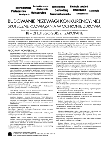 Informatyzacja Partnerstwo Akredytacja Restrukturyzacja Benchmarking Oddłużenie Outsourcing Kontrola zakażeń Controlling Farmakoekonomika Inwestycje Strategia Konsolidacja BUDOWANIE PRZEWAGI KONKURENCYJNEJ SKUTECZNE ROZWIĄZANIA W OCHRONIE ZDROWIA konferencja dla kadry kierowniczej podmiotów leczniczych i przedstawicieli podmiotów tworzących 18 – 21 LUTEGO 2015 r., ZAKOPANE Konferencja prezentuje przegląd aktualnych zagadnień zarządczych w ochronie zdrowia w optyce kadry kierowniczej podmiotów leczniczych jak i przedstawicieli podmiotów tworzących (w szczególności jednostek samorządu terytorialnego). Uczestnicy będą mieli możliwość zapoznania się z praktycznymi rozwiązaniami w zarządzaniu ochroną zdrowia w oparciu o doświadczenia wybranych jednostek i studium przypadków. Pozwoli to na określenie priorytetów strategii i skutecznych narzędzi ich wdrażania oraz adaptację przedstawionych rozwiązań we własnych jednostkach. Szczególną wartością konferencji jest możliwość zapoznania się z bardzo szerokim zakresem zagadnień prezentowanych przez bardzo doświadczonych i odnoszących sukcesy menedżerów ochrony zdrowia. Serdecznie zapraszamy. PROGRAM KONFERENCJI Dariusz Madera – dyrektor Departamentu Zdrowia i Polityki Społecznej Małopolskiego Urzędu Marszałkowskiego, menedżer ochrony zdrowia z doświadczeniem prezesa zarządu szpitala oraz wicewojewody, specjalista w zakresie finansowania ochrony zdrowia oraz nadzoru nad podmiotami leczniczymi. Piotr Pobrotyn – lekarz medycyny i ekonomista, MBA, dyrektor Uniwersyteckiego Szpitala Klinicznego we Wrocławiu, doświadczony menedżer ochrony zdrowia wyróżniony w wielu prestiżowych plebiscytach i rankingach, od 2006 r. skutecznie restrukturyzuje i redukuje zadłużenie kierowanego przez siebie szpitala. Wprowadzenie – rola podmiotów tworzących w monitorowaniu finansów podmiotów leczniczych oraz zasady współpracy samorządu z kierownictwem jednostki w poprawie pozycji konkurencyjnej Rola i znaczenie otoczenia zewnętrznego w kształtowaniu celów i strategii finansowej podmiotów leczniczych Efektywność finansowa w programie restrukturyzacji szpitala Controlling finansowy w zarządzaniu podmiotami leczniczymi Roman Kolek – wicemarszałek województwa opolskiego, lekarz medycyny, doświadczony samorządowiec, specjalista w zakresie zdrowia publicznego i systemu finansowania świadczeń zdrowotnych, wieloletni zca dyrektora oddziału wojewódzkiego NFZ, wykładowca i prelegent wielu konferencji w kraju i za granicą, aktywnie działa na rzecz profilaktyki zakażeń i racjonalizacji antybiotykoterapii. Rafał Staszewski – doktor nauk medycznych, z-ca dyrektora Szpitala Klinicznego Przemienienia Pańskiego w Poznaniu, pracę naukową łączy z codzienną praktyką menedżerską, specjalizuje się w zarządzaniu operacyjnym, marketingu medycznym, PR, ceniony dydaktyk i doświadczony wykładowca. Aktualne uwarunkowania makroekonomiczne ochrony zdrowia i ich wpływ na konkurencyjność w sektorze Finansowanie ochrony zdrowia wobec celów regionalnej polityki zdrowotnej i potrzeb zdrowotnych Ochrona zdrowia po zmianach „pakietowych” – dostosowanie jednostek i praktyczne efekty nowych regulacji Jerzy Hennig – dyrektor Centrum Monitorowania Jakości w ochronie zdrowia, koordynuje program akredytacji szpitali. Akredytacja szpitali w umacnianiu ich pozycji konkurencyjnej Jarosław Maroszek – dyrektor Departamentu Polityki Zdrowotnej Urzędu Marszałkowskiego Województwa Dolnośląskiego, doświadczony menedżer ochrony zdrowia i praktyk w zakresie realizacji regionalnej polityki zdrowotnej i finansowania podmiotów leczniczych, członek MENSA Polska. Kompleksowość i dostępność do świadczeń w określaniu priorytetów polityki Zdrowotnej w regionie Stan obecny i potrzeby podmiotów leczniczych wobec wymagań prawnych i potrzeb zdrowotnych Przygotowanie do absorpcji środków finansowych z funduszy Unii Europejskiej w latach 2015 – 2020 Zbigniew Orzeł – lekarz medycyny, MBA, dyrektor Departamentu Zdrowia Urzędu Marszałkowskiego Województwa Lubelskiego, członek zespołu akceptacyjnego wdrażającego system JGP w Centrali NFZ, b. dyrektor szpitala, specjalista w zakresie finansowania ochrony zdrowia, kontraktowania świadczeń zdrowotnych. Konkurencyjność i metody analizy porównawczej – benchmarking w sektorze ochrony zdrowia Centrum Edukacji Menedżerskiej Promotor 61-512 Poznań, ul. Pamiątkowa 2/8, tel. +48 61 855 23 14, fax +48 61 224 51 63 e-mail [email protected], www.promotor.poznan.pl Ochrona zdrowia jako konkurencyjny rynek w Polsce i na świecie Narzędzia budowania przewagi konkurencyjnej i nowoczesny marketing medyczny Ucieczka do przodu – planowanie rozwoju i programy inwestycyjne Studium przypadków • Restrukturyzacja i oddłużenie Wojewódzkiego Szpitala Specjalistycznego w Gorzowie Wielkopolskim • Partnerstwo publiczno-prywatne w realizowaniu inwestycji w ochronie zdrowia na przykładzie SPZOZ w Żywcu • Farmakoekonomika - skuteczne rozwiązania oszczędnościowe w zakresie gospodarki lekiem w szpitalu Ludmiła Prentkowska – kierownik Oddziału Kontroli Podmiotów Leczniczych Śląskiego Urzędu Wojewódzkiego Współpraca podmiotów leczniczych z podmiotem rejestrowym i zakres kontroli wojewody w jednostce Kody resortowe – najnowsze zmiany Marzenna Bartoszewicz – doktor nauk medycznych, mikrobiolog, pracownik naukowy Uniwersytetu Medycznego we Wrocławiu, Zapobieganie zakażeniom szpitalnym jako kryterium oceny jakościowej świadczeniodawcy Racjonalizacja stosowania antybiotykoterapii jako jedno z kluczowych wyzwań współczesnej medycyny Elzbieta Rabsztyn – doktor nauk medycznych, specjalista diagnostyki laboratoryjnej i zdrowia publicznego, kierownik laboratorium Outsourcing w szpitalu na przykładzie laboratorium diagnostycznego – korzyści i zagrożenia w korzystaniu z usług zewnętrznych BUDOWANIE PRZEWAGI KONKURENCYJNEJ 
