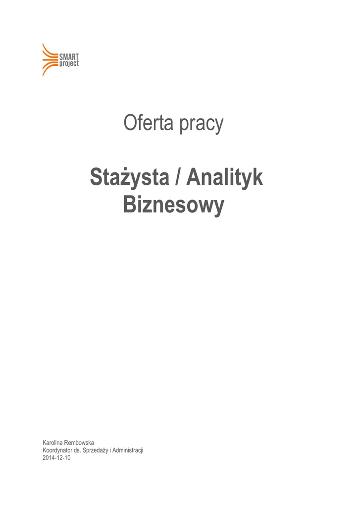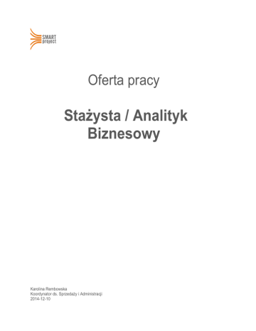 Oferta pracy Stażysta / Analityk Biznesowy Karolina Rembowska Koordynator ds. Sprzedaży i Administracji 2014-12-10 Szanowni Państwo, oferuję Państwu możliwość zdobycia szerokiego doświadczenia biznesowego w trakcie kilkumiesięcznego stażu zawodowego w firmie doradczej SMART Project. Staż będzie miał wymiar wybitnie praktyczny – będzie polegał na aktywnym uczestnictwie w projektach z zakresu transportu, logistyki, magazynowania oraz zarządzania zapasami, jakie nasza firma prowadzi dla klientów. Dla osoby, która się sprawdzi, istnieje możliwość stałego zatrudnienia i dołączenia do grona konsultantów SMART Project. Zainteresowanych proszę o przesłanie CV wraz z listem motywacyjnym do dnia 31.12.2014 r., na adres: [email protected] w tytule wiadomości proszę wpisać „Analityk Piła”. Z poważaniem, Karolina Rembowska Koordynator ds. Sprzedaży i Administracji SMART Project www.smartproject.pl 2. Nazwa stanowiska Stażysta / Analityk Biznesowy Start stażu Natychmiast Czas stażu 6 miesięcy Forma zatrudnienia Umowa zlecenie Miejsce Piła i okolice (siedziby firm Klientów), również praca zdalna Wymiar pracy Wynagrodzenie Główne zadania Wymagania Do kogo skierowane www.smartproject.pl 3. Elastyczny czas pracy; możliwość dostosowania godzin pracy do dostępności stażysty Zakładane obciążenie: 2-3 dni w tygodniu, możliwe większe Możliwość pracy w weekendy Płatny cały zarejestrowany czas pracy Wynagrodzenie 100 zł brutto za dzień pracy (8h) Świadczenie bieżącego wsparcia operacyjnego dla klientów Realizacja innych zadań zleconych przez Kierownika Projektu Wsparcie procesu sprzedażowego SMART Project Umiejętności analityczne Dobra znajomość Excel, w tym tabel przestawnych i pracy z wieloma arkuszami Komunikatywny angielski Udokumentowane doświadczenie biznesowe (praktyki, praca dorywcza) Czynne prawo jazdy kat.B Oferta skierowana jest do studentów studiów II stopnia oraz absolwentów. O SMART Project Jesteśmy firmą doradczą działającą na styku obszarów logistyki, zarządzania projektami, Lean Management i analityki biznesowej. Aktualnie wspieramy m.in.: Unilever, BASF, VW, Skodę, Good Food Products, PEPCO, Thule oraz York, dla których prowadzimy projekty mające na celu: redukcję poziomu zapasów wyrobów i surowców, poprawę jakości prognozowania i planowania produkcji, redukcję kosztów przez usprawnienie procesu zakupowego, usprawnienie procesu produkcyjnego przez eliminację marnotrawstwa, podniesienie poziomu obsługi klienta, oszczędności w obszarze transportu własnego i zewnętrznego, zwiększenie efektywności przedsiębiorstwa przez budowanie kultury Lean. W prowadzonych przez nas projektach usprawniających stosujemy najlepsze praktyki zaczerpnięte z filozofii Lean i metodyki projektowej DMAIC. Uważamy, że problem dobrze zdefiniowany, to problem w połowie rozwiązany. Dlatego usprawniając procesy koncentrujemy się najpierw na identyfikacji przyczyn źródłowych problemu. Po wnikliwej analizie wpływu poszczególnych przyczyn na niepożądane efekty procesu, definiujemy rozwiązania, które eliminują źródła marnotrawstw i pozwalają na trwałe usprawnienie procesu. We wdrażaniu rozwiązań posługujemy się metodyką Prince 2 oraz najlepszymi praktykami rekomendowanymi przez Project Management Institute. Uważamy, że usprawnienie przyniesie trwały efekty wyłącznie wtedy, gdy zostanie w pełni zaakceptowane przez pracowników biorących udział w realizacji procesu. Dlatego naszym priorytetem jest angażowanie interesariuszy usprawnianego procesu w definiowanie i wdrażanie zmian. Takie podejście zapewnia nie tylko trwałość wypracowanych rozwiązań, ale i budowanie w pracownikach przedsiębiorczości i zaangażowania. Więcej informacji znajdą Państwo na stronie www.smartproject.pl www.smartproject.pl 4. Nasi Klienci: www.smartproject.pl 5.