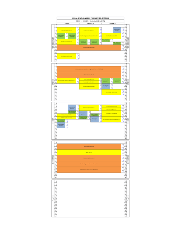 STUDIA STACJONARNE PIERWSZEGO STOPNIA ROK III - SEMESTR 5 ( rok akad. 2016/2017 ) GRUPA - 1 GRUPA - 2 GRUPA - 3 715 715 800 815 D-4 900 1015 1200 7 D-1 Mechanika budowli II 13 00 13 15 1000 D-1 D-10 D-4 1015 8 44 57 1100 D-4 1115 57 1200 43 D-3 1400 Technologia robót budowlanych I Mechanika budowli II D-10 44 D-1 Mechanika budowli II 43 7 D-1 Mechanika budowli II 7 D-1 Org. produkcji 8 budowlanej 1215 D-10 1300 44 D-1 Org. produkcji budowlanej 8 1415 1500 Konstrukcje metalowe 1515 16 00 16 15 915 42 D-3 Konstrukcje metalowe 900 LG 26 8 1215 D-1 815 42 57 D-1 7 Mechanika gruntów D-10 1315 44 1400 A-28 1415 43 1500 A-28 1515 43 1600 1615 1700 1700 1715 D-4 1715 1800 46 1800 D-4 1815 46 1900 1815 Konstrukcje betonowe 19 00 19 15 1915 2000 2000 715 715 800 8 800 15 900 Instalacje budowlane (co drugi tydzień od 04.10.2016r.) 915 1000 1015 WTOREK 1100 11 15 12 00 Mechanika budowli II 1215 S-27 1300 48 1315 14 00 14 15 Technologia robót budowlanych I S-27 48 Mechanika gruntów Instalacje budowlane 1500 Konstrukcje betonowe 1515 1600 LFB 24 LFB D-1 Mechanika budowli II 7 D-1 Mechanika budowli II 18 00 900 A-0 915 39 1000 A-0 1015 7 1100 A-0 1115 7 1200 D-1 1215 8 1300 D-1 1315 8 1400 7 D-2 LG 1415 42 1500 LG 1515 46 D-2 Mechanika gruntów 46 1600 42 1700 17 815 39 39 1615 15 A-0 Konstrukcje betonowe D-2 1615 46 1700 D-2 1715 46 1800 1815 1815 1900 1900 x 1915 1915 2000 2000 715 715 800 8 15 9 00 800 Mechanika gruntów 915 1000 Org. produkcji budowlanej 1100 ŚRODA 1115 12 12 15 1300 1315 1400 Mechanika gruntów Instalacje budowlane Org. produkcji budowlanej 1415 15 00 15 15 1600 LG D-1 42 43 LG Konstrukcje metalowe 42 1015 00 Mechanika gruntów D-10 44 D-3 24 LFB Org. produkcji 29 budowlanej D-10 44 Mechanika gruntów 44 900 915 1000 D-1 1015 43 1100 D-1 1115 44 43 1200 LG D-1 1215 42 54 1300 D-1 1315 54 1400 42 LG Org. produkcji 42 budowlanej 815 29 24 Mechanika gruntów LG Mechanika gruntów LFB D-10 D-1 43 D-10 Instalacje budowlane D-10 LG 42 Konstrukcje metalowe Technologia robót budowlanych I LG 1415 45 1500 LG 1515 47 1600 1615 1615 1700 1700 1715 1715 1800 1800 18 15 1815 19 00 1900 1915 1915 2000 2000 15 715 7 800 800 815 900 915 10 00 10 15 Mechanika gruntów A-28 815 42 900 A-28 915 42 1000 SJO 1015 1100 1115 1100 Język obcy III SJO CZWARTEK 1200 A-0 1215 32 1300 A-0 1315 1400 32 1400 1415 A-0 1415 1500 53 1500 A-0 1515 53 1600 A-0 1615 53 1700 A-0 1715 53 1800 13 13 15 1515 Konstrukcje betonowe Technologia robót budowlanych I 1600 16 15 17 00 1715 1800 Organizacja produkcji budowlanej 1815 1815 1900 1900 19 15 1915 20 00 2000 715 715 800 800 8 15 815 9 00 900 915 915 1000 1000 1015 1015 1100 1100 15 1115 1200 1200 1215 1215 1300 1300 1315 1315 14 00 1400 14 15 1415 1500 1500 1515 1515 1600 1600 1615 1615 1700 1700 17 15 1715 18 00 1800 1815 1815 1900 1900 1915 1915 2000 2000 11 PIĄTEK 1115 1200 1215 00 WTOREK PONIEDZIAŁEK 1115 D-1 Mechanika budowli II 26 ŚRODA 1100 D-4 Mechanika budowli II CZWARTEK 10 00 57 Mechanika budowli II LG PIĄTEK 9 15 D-1 PONIEDZIAŁEK 800