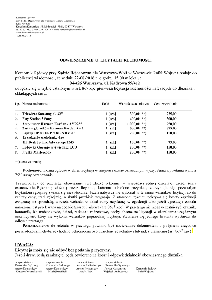 Komornik Sądowy przy Sądzie Rejonowym dla Warszawy-Woli w Warszawie Rafał Wojtyna Kancelaria Komornicza Al.Solidarności 155/11, 00-877 Warszawa tel. 22 6310833,35 fax 22 6310834 e-mail: [email protected] www.komornikwarszawa.pl Km 34734/14 OBWIESZCZENIE O LICYTACJI RUCHOMOŚCI Komornik Sądowy przy Sądzie Rejonowym dla Warszawy-Woli w Warszawie Rafał Wojtyna podaje do publicznej wiadomości, że w dniu 22-08-2016 r. o godz. 15:00 w lokalu: 04-426 Warszawa, ul. Kadrowa 99/412 odbędzie się w trybie ustalonym w art. 867 kpc pierwsza licytacja ruchomości należących do dłużnika i składających się z: _______________________________________________________________________________________________________________________ Lp. Nazwa ruchomości Ilość Wartość szacunkowa Cena wywołania _________________________________________________________________________________________________________________________ 1. 2. 3. 4. 5. 6. 7. 8. Telewizor Samsung ok 32" Play Station 3 Sony Amplituner Harman Kardon - AVR255 Zestaw głośników Harman Kardon 5 + 1 Laptop HP Nr FRP7C812N3IY305 Urządzenie wielofunkcyjne HP Desk Jet Ink Adwantage 2545 Lodówka Gorenje wyświetlacz LCD Pralka Mastercook 1 [szt.] 1 [szt.] 1 [szt.] 1 [szt.] 1 [szt.] 300,00 400,00 1 000,00 500,00 200,00 1 [szt.] 1 [szt.] 1 [szt.] **) **) **) **) **) 225,00 300,00 750,00 375,00 150,00 100,00 **) 200,00 **) 200,00 **) 75,00 150,00 150,00 _______________________________________________________________________________________________________________________ **) cena za sztukę Ruchomości można oglądać w dzień licytacji w miejscu i czasie oznaczonym wyżej. Suma wywołania wynosi 75% sumy oszacowania. Przystępujący do przetargu obowiązany jest złożyć rękojmię w wysokości jednej dziesiątej części sumy oszacowania. Rękojmię złożoną przez licytanta, któremu udzielono przybicia, zatrzymuje się; pozostałym licytantom rękojmię zwraca się niezwłocznie. Jeżeli nabywca nie wykonał w terminie warunków licytacji co do zapłaty ceny, traci rękojmię, a skutki przybicia wygasają. Z utraconej rękojmi pokrywa się koszty egzekucji związanej ze sprzedażą, a reszta wchodzi w skład sumy uzyskanej w egzekucji albo jeżeli egzekucja została umorzona jest przelewana na dochód Skarbu Państwa (art. 8671 kpc). W przetargu nie mogą uczestniczyć: dłużnik, komornik, ich małżonkowie, dzieci, rodzice i rodzeństwo, osoby obecne na licytacji w charakterze urzędowym oraz licytant, który nie wykonał warunków poprzedniej licytacji. Stawienie się jednego licytanta wystarcza do odbycia przetargu. Pełnomocnictwo do udziału w przetargu powinno być stwierdzone dokumentem z podpisem urzędowo poświadczonym, chyba że chodzi o pełnomocnictwo udzielone adwokatowi lub radcy prawnemu (art. 8672 kpc) UWAGA: Licytacja może się nie odbyć bez podania przyczyny. Jeżeli drzwi będą zamknięte, będą otwierane na koszt i odpowiedzialność obowiązanego dłużnika. z upoważnienia Komornika Sądowego Asesor Komorniczy Krzysztof Mazuchowski z upoważnienia Komornika Sądowego Asesor Komorniczy Maciej Parafiński z upoważnienia z upoważnienia Komornika Sądowego Komornika Sądowego Asesor Komorniczy Asesor Komorniczy Jakub Siadul Wojciech Andryszczyk 1 Komornik Sądowy Rafał Wojtyna