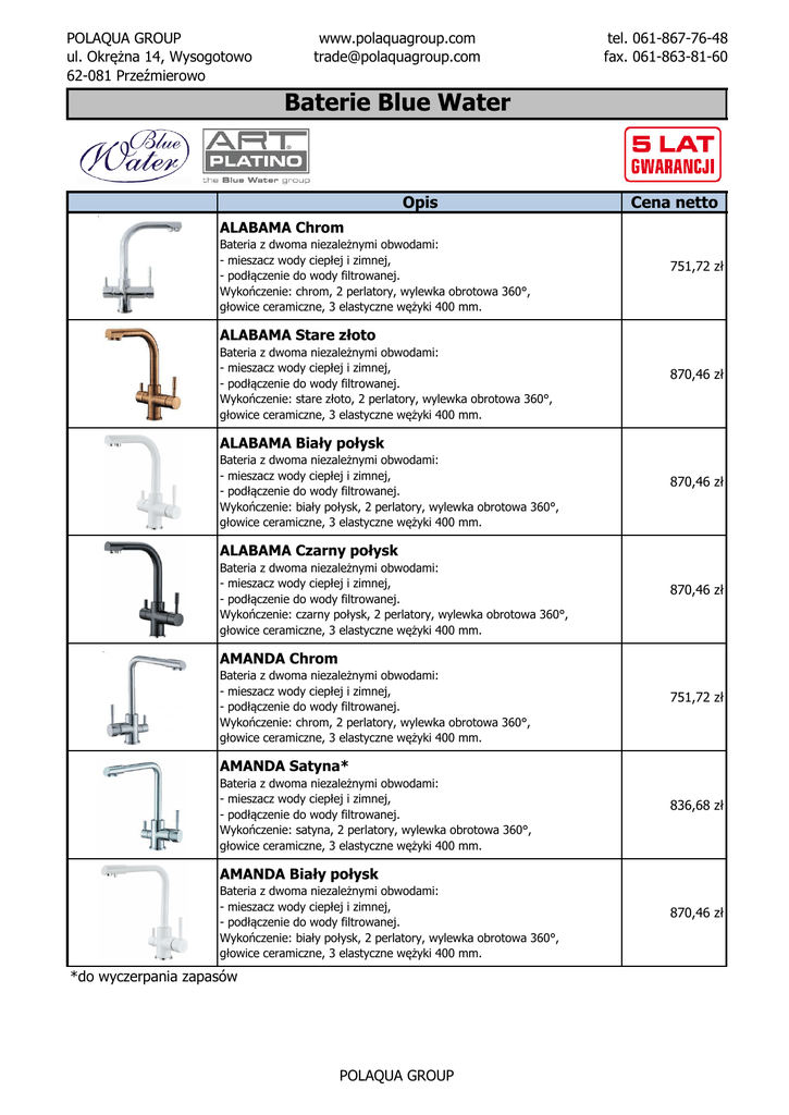 POLAQUA GROUP ul. Okrężna 14, Wysogotowo 62-081 Przeźmierowo www.polaquagroup.com [email protected] tel. 061-867-76-48 fax. 061-863-81-60 Baterie Blue Water Opis Cena netto ALABAMA Chrom Bateria z dwoma niezależnymi obwodami: - mieszacz wody ciepłej i zimnej, - podłączenie do wody filtrowanej. Wykończenie: chrom, 2 perlatory, wylewka obrotowa 360°, głowice ceramiczne, 3 elastyczne wężyki 400 mm. 751,72 zł ALABAMA Stare złoto Bateria z dwoma niezależnymi obwodami: - mieszacz wody ciepłej i zimnej, - podłączenie do wody filtrowanej. Wykończenie: stare złoto, 2 perlatory, wylewka obrotowa 360°, głowice ceramiczne, 3 elastyczne wężyki 400 mm. 870,46 zł ALABAMA Biały połysk Bateria z dwoma niezależnymi obwodami: - mieszacz wody ciepłej i zimnej, - podłączenie do wody filtrowanej. Wykończenie: biały połysk, 2 perlatory, wylewka obrotowa 360°, głowice ceramiczne, 3 elastyczne wężyki 400 mm. 870,46 zł ALABAMA Czarny połysk Bateria z dwoma niezależnymi obwodami: - mieszacz wody ciepłej i zimnej, - podłączenie do wody filtrowanej. Wykończenie: czarny połysk, 2 perlatory, wylewka obrotowa 360°, głowice ceramiczne, 3 elastyczne wężyki 400 mm. 870,46 zł AMANDA Chrom Bateria z dwoma niezależnymi obwodami: - mieszacz wody ciepłej i zimnej, - podłączenie do wody filtrowanej. Wykończenie: chrom, 2 perlatory, wylewka obrotowa 360°, głowice ceramiczne, 3 elastyczne wężyki 400 mm. 751,72 zł AMANDA Satyna* Bateria z dwoma niezależnymi obwodami: - mieszacz wody ciepłej i zimnej, - podłączenie do wody filtrowanej. Wykończenie: satyna, 2 perlatory, wylewka obrotowa 360°, głowice ceramiczne, 3 elastyczne wężyki 400 mm. 836,68 zł AMANDA Biały połysk Bateria z dwoma niezależnymi obwodami: - mieszacz wody ciepłej i zimnej, - podłączenie do wody filtrowanej. Wykończenie: biały połysk, 2 perlatory, wylewka obrotowa 360°, głowice ceramiczne, 3 elastyczne wężyki 400 mm. *do wyczerpania zapasów POLAQUA GROUP 870,46 zł POLAQUA GROUP ul. Okrężna 14, Wysogotowo 62-081 Przeźmierowo www.polaquagroup.com [email protected] Opis tel. 061-867-76-48 fax. 061-863-81-60 Cena netto AMANDA Czarny połysk Bateria z dwoma niezależnymi obwodami: - mieszacz wody ciepłej i zimnej, - podłączenie do wody filtrowanej. Wykończenie: czarny połysk, 2 perlatory, wylewka obrotowa 360°, głowice ceramiczne, 3 elastyczne wężyki 400 mm. 870,46 zł AMANDA 44 Czarny metalic Bateria z dwoma niezależnymi obwodami: - mieszacz wody ciepłej i zimnej, - podłączenie do wody filtrowanej. Wykończenie: czarny metalic, 2 perlatory, wylewka obrotowa 360°, głowice ceramiczne, 3 elastyczne wężyki 400 mm. 979,40 zł ARIMA chrom Bateria z dwoma niezależnymi obwodami: - mieszacz wody ciepłej i zimnej, - podłączenie do wody filtrowanej. Wykończenie: chrom, 2 perlatory, wylewka obrotowa 360°, głowice ceramiczne, 3 elastyczne wężyki 400 mm. 751,72 zł IBIZA Chrom Bateria jendoobwodowa do wody filtrowanej. Wykończenie: chrom, wylewka obrotowa 360°, głowica ceramiczna, gwint zasilania 1/2", 1 elastyczny wężyk 400 mm. 240,76 zł IBIZA Satyna Bateria jendoobwodowa do wody filtrowanej. Wykończenie: satyna, wylewka obrotowa 360°, głowica ceramiczna, gwint zasilania 1/2", 1 elastyczny wężyk 400 mm. 269,08 zł PALMIRA Inox Bateria z dwoma niezależnymi obwodami: - mieszacz wody ciepłej i zimnej, - podłączenie do wody filtrowanej. Stal nierdzewna, wykończenie: stal szczotkowana, 2 perlatory, wylewka obrotowa 360°, głowice ceramiczne, 3 elastyczne wężyki 450 mm. 968,00 zł PLATINA Inox Bateria z dwoma niezależnymi obwodami: - mieszacz wody ciepłej i zimnej, - podłączenie do wody filtrowanej. Stal nierdzewna, wykończenie: stal szczotkowana, 2 perlatory, wylewka obrotowa 360°, głowice ceramiczne, 3 elastyczne wężyki 450 mm. 1 197,28 zł RICANATI Stare złoto Bateria z dwoma niezależnymi obwodami: - mieszacz wody ciepłej i zimnej, - podłączenie do wody filtrowanej. Wykończenie: stare złoto, białe wstawki wykonane z porcelany, 2 perlatory, wylewka obrotowa 360°, głowice ceramiczne, 3 elastyczne wężyki 400 mm. POLAQUA GROUP 1 306,24 zł POLAQUA GROUP ul. Okrężna 14, Wysogotowo 62-081 Przeźmierowo www.polaquagroup.com [email protected] Opis tel. 061-867-76-48 fax. 061-863-81-60 Cena netto TARON Chrom Bateria z dwoma niezależnymi obwodami: - mieszacz wody ciepłej i zimnej, - podłączenie do wody filtrowanej. Wykończenie: chrom, 2 perlatory, wylewka obrotowa 360°, głowice ceramiczne, 3 elastyczne wężyki 400 mm. 860,66 zł TAUPO Chrom Bateria z dwoma niezależnymi obwodami: - mieszacz wody ciepłej i zimnej, - podłączenie do wody filtrowanej. Wykończenie: chrom, 2 perlatory, wylewka obrotowa 360°, głowice ceramiczne, 3 elastyczne wężyki 400 mm. 1 133,02 zł TAUPO Satyna Bateria z dwoma niezależnymi obwodami: - mieszacz wody ciepłej i zimnej, - podłączenie do wody filtrowanej. Wykończenie: satyna, 2 perlatory, wylewka obrotowa 360°, głowice ceramiczne, 3 elastyczne wężyki 400 mm. 1 272,46 zł TORINO Inox Bateria z dwoma niezależnymi obwodami: - mieszacz wody ciepłej i zimnej, - podłączenie do wody filtrowanej. Stal nierdzewna, wykończenie: stal szczotkowana, 2 perlatory, wylewka obrotowa 360°, głowice ceramiczne, 3 elastyczne wężyki 450 mm. 1 197,30 zł ZARA Inox Bateria z dwoma niezależnymi obwodami: - mieszacz wody ciepłej i zimnej, - podłączenie do wody filtrowanej. Stal nierdzewna, wykończenie: stal szczotkowana, 2 perlatory, wylewka obrotowa 360°, głowice ceramiczne, 3 elastyczne wężyki 450 mm. POLAQUA GROUP 1 197,30 zł