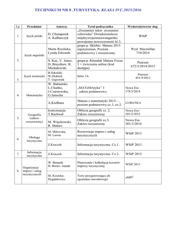 TECHNIKUM NR 8 .TURYSTYKA. KLASA IVC.2015/2016 Lp. 1. Przedmiot Język polski Język angielski 2. 3. 4. 5. 6. 7. 8. Autorzy Marta Rosińska, Lynda Edwards „Zrozumieć tekst- zrozumieć człowieka” Dwudziestolecie międzywojenne(awangarda) powojenna nowoczesność kl.3. grupa p. Sklebic: Matura 2015 repetytorium. Poziom podstawowy i rozszerzony. S. Kay, V. Jones, D. Brayshaw, B. Michałowski grupa p. Kłunduk Matura Focus 3 + ćwiczenia online (kod dostępu) D. Chemperek A. Kalbarczyk B.Sekulski Język niemiecki W.Drabich T. Gajownik Matematyka Geografia (zakres rozszerzony) Obsługa turystyczna Informacja turystyczna Organizacja imprez i usług turystycznych Tytuł podręcznika Wydawnictwo/nr dop. WSiP Wyd. Macmillan 710/2014 Pearson 672/3/2014/2015 Pearson 451/5/2012 Infos 3A W. Babiański, L.Chańko, J.Czarnowska, G.Janocha „MATeMAtyka” 3 zakres podstawowy Nowa Era 378/3/2014 A.Kiełbasa Matura z matematyki 2015-… poziom podstawowy.cz.1, cz.2. LUBATKA kontynuacja: T.Rachwał Oblicza geografii cz. 2. Zakres rozszerzony Nowa Era / 501/2/2012 M. Więckowski, R. Malarz Oblicza geografii cz.3. Zakres rozszerzony Nowa Era 501/3/2014 M. Milewska, M. Lawin Rezerwacja imprez i usług turystycznych WSiP 2013 Z.Kruczek Informacja turystyczna. Cz.1. WSiP 2013 Z.Kruczek Informacja turystyczna. Cz.2. WSiP 2013 W. Banasik H. Borne- Januła Planowanie i kalkulacja kosztów imprezy turystycznej WSiP 2013 M. KozickaDygdałowicz Testy przygotowujące do egzaminu zawodowego eMPi2