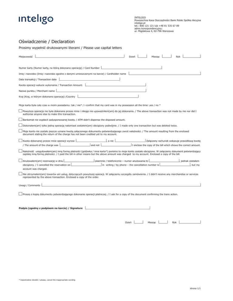 INTELIGO Powszechna Kasa Oszczędności Bank Polski Spółka Akcyjna inteligo.pl tel.: 800 121 121 lub +48 81 535 67 89 adres korespondencyjny: ul. Migdałowa 4, 02-796 Warszawa Oświadczenie / Declaration Prosimy wypełnić drukowanymi literami / Please use capital letters Miejscowość Dzień Miesiąc Rok Numer karty (Numer karty, na którą dokonano operację) / Card Number Imię i nazwisko (Imię i nazwisko zgodne z danymi umieszczonymi na karcie) / Cardholder name Data transakcji / Transaction date Kwota operacji walucie wykonania / Transaction Amount: Nazwa punktu / Merchant name Kraj (Kraj, w którym dokonano operację) /Country Moja karta była cały czas w moim posiadaniu: tak / nie* / i confirm that my card was in my possession all the time: yes / no * owyższa operacja nie była dokonana przeze mnie i nikogo nie upoważniłem(am) do jej dokonania. / The above transaction was not made by me nor did I P authorise anyone else to make this transaction. ankomat nie wypłacił zadysponowanej kwoty. / ATM didn’t dispense the disposed amount. B okonałem(am) tylko jedną operację natomiast zostałem(am) obciążony podwójnie. / I made only one transaction but was debited twice. D oje konto nie zostało jeszcze uznane kwotą załączonego dokumentu potwierdzającego zwrot należności. / The amount resulting from the enclosed M document stating the return of the charge has not been credited yet to my account. Kwota dokonanej przeze mnie operacji wynosi / The amount of the charge was , a nie Załączony rachunek wskazuje prawidłową kwotę and not I enclose the copy of the bill which shows the correct amount. ależność uregulowałem(am) inną formą płatności (gotówka / inna karta*) pomimo to moje konto zostało obciążone. W załączeniu dokument potwierdzający N zapłatę inną formą płatności. / I paid the bill in other means but the above amount was charged to my account. Enclosed a copy of the bill. nulowałem(am) rezerwację w dniu A obciążony. / I cancelled the reservation on pisemnie / telefonicznie – numer anulowania to , jednak zostałem in writing / by phone – the cancellation number is , but my account was charged. ie otrzymałem(am) towarów ani usług, dotyczących powyższej operacji. W załączeniu szczegóły zamówienia. / I didn’t receive any merchandise or services N represented by the above transaction. Enclosed a copy of the order. Uwagi / Comments roszę o kopię dokumentu potwierdzającego dokonanie operacji płatniczej. / I ask for a copy of the document confirming the trans action. P Podpis (zgodny z podpisem na karcie) / Signature Dzień Miesiąc Rok * niepotrzebne skreślić / please, cancel the inappropriate wording strona 1/1