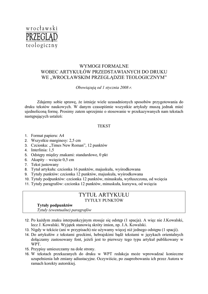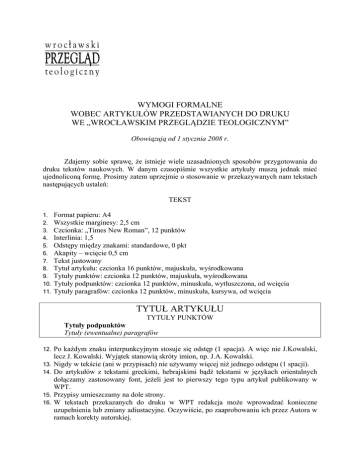 WYMOGI FORMALNE WOBEC ARTYKUŁÓW PRZEDSTAWIANYCH DO DRUKU WE „WROCŁAWSKIM PRZEGLĄDZIE TEOLOGICZNYM” Obowiązują od 1 stycznia 2008 r. Zdajemy sobie sprawę, że istnieje wiele uzasadnionych sposobów przygotowania do druku tekstów naukowych. W danym czasopiśmie wszystkie artykuły muszą jednak mieć ujednoliconą formę. Prosimy zatem uprzejmie o stosowanie w przekazywanych nam tekstach następujących ustaleń: TEKST 1. 2. 3. 4. 5. 6. 7. 8. 9. 10. 11. Format papieru: A4 Wszystkie marginesy: 2,5 cm Czcionka: „Times New Roman”, 12 punktów Interlinia: 1,5 Odstępy między znakami: standardowe, 0 pkt Akapity – wcięcie 0,5 cm Tekst justowany Tytuł artykułu: czcionka 16 punktów, majuskuła, wyśrodkowana Tytuły punktów: czcionka 12 punktów, majuskuła, wyśrodkowana Tytuły podpunktów: czcionka 12 punktów, minuskuła, wytłuszczona, od wcięcia Tytuły paragrafów: czcionka 12 punktów, minuskuła, kursywa, od wcięcia TYTUŁ ARTYKUŁU TYTUŁY PUNKTÓW Tytuły podpunktów Tytuły (ewentualne) paragrafów 12. Po każdym znaku interpunkcyjnym stosuje się odstęp (1 spacja). A więc nie J.Kowalski, lecz J. Kowalski. Wyjątek stanowią skróty imion, np. J.A. Kowalski. 13. Nigdy w tekście (ani w przypisach) nie używamy więcej niż jednego odstępu (1 spacji). 14. Do artykułów z tekstami greckimi, hebrajskimi bądź tekstami w językach orientalnych dołączamy zastosowany font, jeżeli jest to pierwszy tego typu artykuł publikowany w WPT. 15. Przypisy umieszczamy na dole strony. 16. W tekstach przekazanych do druku w WPT redakcja może wprowadzać konieczne uzupełnienia lub zmiany adiustacyjne. Oczywiście, po zaaprobowaniu ich przez Autora w ramach korekty autorskiej. 17. Korektę autorską należy wykonać w nieprzekraczalnym terminie 7 dni. Inaczej domniemuje się, że Autor zgodził się na zaproponowane przez naszą redakcję zmiany. PRZYPISY: 1. Przypisy zawsze muszą być kompletne. 2. Przypisy sporządzamy czcionką „Times New Roman”, 10 punktów, interlinia pojedyncza. 3. W przypisach umieszczamy zawsze nazwisko autora przed tytułem cytowanej pozycji, nawet wówczas, gdy było ono wymieniane w tekście. 4. Po numerze przypisu nie stawiamy żadnego dodatkowego znaku 5. Cytując książkę, podajemy: inicjał imienia (kapitaliki) nazwisko autora (kapitaliki) tytuł dzieła lub artykułu (kursywa) ewentualnie tom (normalny) miejsce i rok wydania (normalny) cytowane strony (normalny) Po inicjale imienia (ew. inicjałach imion) stawiamy kropkę Poszczególne części oddzielamy przecinkiem Na końcu przypisu stawiamy kropkę Jeżeli cytowanych pozycji w jednym przypisie jest więcej, oddzielamy je średnikiem. Gdy nazwisko autora się powtarza, piszemy: Tenże Gdy tytuł dzieła się powtarza, piszemy: Tamże Inicjał imienia i nazwisko Redaktora pracy zbiorowej również umieszczamy przed tytułem tegoż opracowania, zaznaczając w nawiasie: (red.) - K. WOJTYŁA, Miłość i odpowiedzialność, Lublin 2000, s. 123-125. - TENŻE, Świętego Jana od Krzyża nauka o wierze, Lublin 2000, s. 15. - W. IREK, Krytyka liberalizmu w encyklice „Centesimus annus” Jana Pawła II, w: I. DEC (red.), Służcie Panu z weselem, t. 1, Wrocław 2000, s. 311-312. - JAN PAWEŁ II, Redemptor hominis [dalej: RH], 10. - RH 32. - ŚW. TERESA Z AVILA, Twierdza wewnętrzna [Twierdza] albo [dalej: TW], Kraków 1986, V,1,2. - TW VII,3,2. - Twierdza, VII,3,2. - J. KRÓLIKOWSKI (red), Od wiary do teologii. Dokumenty Międzynarodowej Komisji Teologicznej 1969-1996, Kraków 2000. - A. MUSZALA (red.), Encyklopedia bioetyki, Radom 2005. - E. ANCILLI (red.), Dizionario Enciclopedico di Spiritualità, t. I, Roma 1990. 6. Cytując artykuł, za pierwszym razem podajemy po Autorze i tytule: pełną nazwę czasopisma (bez cudzysłowiu) w kwadratowym nawiasie piszemy „dalej:” i podajemy jego skrót rocznik przed nawiasem w nawiasie rok gdy rocznik czasopisma nie ma paginacji ciągłej, po roku zaznaczamy numer zeszytu następnie podajemy strony artykułu 7. Cytując ten artykuł następnym razem, zamiast pełnego tytułu czasopisma podajemy zapowiedziany skrót. 8. Jeżeli dany przypis przytacza kilka prac, ich opisy bibliograficzne oddzielamy średnikiem. 9. Powołując się na pracę cytowaną w przypisie bezpośrednio poprzedzającym, stosujemy formułę: Tamże, s. J. KRUCINA, Rola stowarzyszeń chrześcijańskich w kształtowaniu moralności publicznej, Wrocławski Przegląd Teologiczny [dalej: WPT] 15(2007)1, s. 53-55. STRESZCZENIE 10. Artykuły napisane w języku polskim (poza sprawozdaniami, recenzjami i komunikatami) muszą mieć streszczenie w jednym z języków kongresowych: (angielski, francuski, hiszpański, niemiecki, włoski) Streszczenie rozpoczynamy od nowej strony pierwszy wiersz, na środku, zawiera przetłumaczony tytuł artykułu tekst streszczenia nie powinien przekraczać 20 linijek pod tekstem streszczenia umieszczamy inicjał imienia i nazwisko Tłumacza tekstu SŁOWA KLUCZOWE Na końcu artykułu proszę podać w języku polskim i angielskim trzy do pięciu słów kluczowych dla swego artykułu. NOTATKA O AUTORZE Autorzy, którzy pierwszy raz składają swój artykuł do druku we WPT, proszeni są o dołączenie bardzo krótkiej notatki biograficznej o sobie. (Maksymalnie – 500 znaków, ze spacjami) imię i nazwisko rocznik urodzenia stopień naukowy pełnione funkcje (ew. zaangażowania i zainteresowania) główne (i najnowsze) publikacje UWAGI KOŃCOWE 1. Materiały przekazywane do Redakcji muszą być kompletne: wersja elektroniczna artykułu obcojęzyczne streszczenie słowa kluczowe notatka o Autorze 2. Tekstów niezamówionych, redakcja nie zwraca. 3. Teksty publikujemy nieodpłatnie.