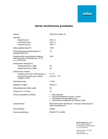Karta techniczna produktu Nazwa SILKA E12 klasy 15 Wymiary długość [mm] szerokość [mm] wysokość [mm] 333 ± 2 120 ± 2 199 ± 1 Klasa gęstości [kg/m3] 1400 Znormalizowana wytrzymałość na ściskanie [N/mm2] 15 Współczynnik przewodzenia ciepła w stanie suchym i temperaturze +10 ºC, λ10,dry [W/(m·K)] 0,46 Izolacyjność akustyczna współczynnik RA1R [dB] współczynnik RA2R [dB] 45 42 Dyfuzja pary wodnej współczynnik oporu dyfuzyjnego, µ przepuszczalność pary wodnej, δ [kg/(m·s·Pa)] 5 / 10 0,2÷0,4 · 10-10 Absorpcja wody ≤ 16% Reakcja na ogień Klasa A1 Mrozoodporność [ilość cykli] 50 Zużycie na 1 m2 [szt.] 15 Cechy szczególne produktu Zastosowanie Murowanie ścian działowych i nośnych wewnętrznych, ścian zewnętrznych Kraj produkcji Polska Normy produktowe PN-EN 771-2:2006 bloki drążone bloczki profilowane na pióro i wpust wewnętrzne kanały elektryczne murowanie na zaprawie do cienkich spoin Xella Polska Sp. z o. o. Biuro Obsługi Klienta Ul. Bohaterów Westerplatte 1 07-410 Ostrołęka Infolinia 0 801 122 224 www.xella.pl www.budowane.pl