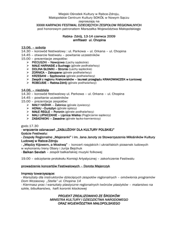 Miejski Ośrodek Kultury w Rabce-Zdroju, Małopolskie Centrum Kultury SOKÓŁ w Nowym Sączu zapraszają na XXXIII KARPACKI FESTIWAL DZIECIĘCYCH ZESPOŁOW REGIONALNYCH pod honorowym patronatem Marszałka Województwa Małopolskiego RabkaRabka- Zdrój, 1313-14 czerwca 2009 2009 amfiteatr ul. Chopina 13.06. – sobota 14.30 – korowód festiwalowy : ul. Parkowa – ul. Orkana – ul. Chopina 14.45 – otwarcie festiwalu – powitanie uczestników 15.00 – prezentacje zespołów: PIECUSZKI – Nawojowa (Lachy sądeckie) MAŁE HARNASIE z Suchego (górale podhalańscy) DOLINA SŁOMKI – Stronie (Lachy sądeckie) ZORNICA – Zakopane (górale podhalańscy) KRZESANI – Spytkowice (górale podhalańscy) Zespół z regionu regionu Krakowiaków – laureat przeglądu KRAKOWIACZEK w Łoniowej ROBCUSIE – RabkaRabka-Zdrój (górale podhalańscy) 14.06. – niedziela 14.30 – korowód festiwalowy ul. Parkowa – ul. Orkana – ul. Chopina 14.45 – powitanie uczestników 15.00 – prezentacje zespołów: MAŁY HAŚNIK – Żabnica (górale żywieccy) HONAJ –Dursztyn (górale spiscy) MAŁE REGLE – Poronin (górale podhalańscy) MALI LIPNICZANIE – Lipnica Wielka (Pogórzanie sądeccy) ZASADNIOKI – Zasadne (górale łącko-kamieniccy) godz.17.30 - wręczenie odznaczeń „ZASŁUŻONY „ZASŁUŻONY DLA KULTURY POLSKIEJ” Goście Festiwalu: - Zespoły Regionalne „Majeranki” „Majeranki” i im. Jana Janoty ze ze Stowarzyszenia Miłośników Kultury Ludowej w RabceRabce-Zdroju - „Między Kijowem, a Moskwą” – koncert rosyjskich i ukraińskich piosenek ludowych w wykonaniu Ireny Obary i Jurija Bejchuk - Balkan Sevdah – zespół bałkańskiej muzyki folkowej 19.00 – odczytanie protokołu Komisji Artystycznej – zakończenie Festiwalu prowadzenie koncertów Festiwalowych – Dorota Majerczyk Imprezy towarzyszące: - Warsztaty dla instruktorów dziecięcych zespołów regionalnych – omówienia programów Dom Wczasowy „Stella” ul. Chopina 14 - Kiermasz prac i warsztaty plastyczne regionalnych twórców plastyków – malarstwo na szkle, bibułkarstwo, haft koronki klockowej PROJEKT ZREALIZOWANO ZE ŚRODKÓW MINISTRA MINISTRA KULTURY I DZIEDZICTWA NARODOWEGO ORAZ WOJEWÓDZTWA MAŁOPOLSKIEGO