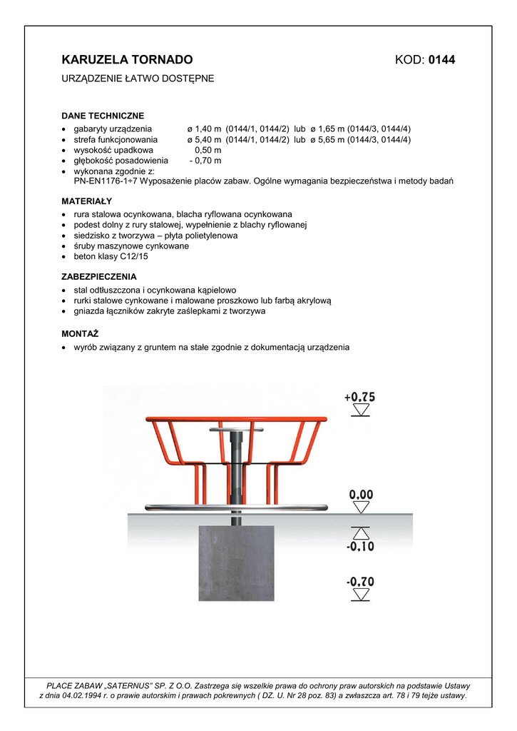 KARUZELA TORNADO KOD: 0144 URZĄDZENIE ŁATWO DOSTĘPNE DANE TECHNICZNE gabaryty urządzenia ø 1,40 m (0144/1, 0144/2) lub ø 1,65 m (0144/3, 0144/4) strefa funkcjonowania ø 5,40 m (0144/1, 0144/2) lub ø 5,65 m (0144/3, 0144/4) wysokość upadkowa 0,50 m głębokość posadowienia - 0,70 m wykonana zgodnie z: PN-EN1176-1÷7 Wyposażenie placów zabaw. Ogólne wymagania bezpieczeństwa i metody badań MATERIAŁY rura stalowa ocynkowana, blacha ryflowana ocynkowana podest dolny z rury stalowej, wypełnienie z blachy ryflowanej siedzisko z tworzywa – płyta polietylenowa śruby maszynowe cynkowane beton klasy C12/15 ZABEZPIECZENIA stal odtłuszczona i ocynkowana kąpielowo rurki stalowe cynkowane i malowane proszkowo lub farbą akrylową gniazda łączników zakryte zaślepkami z tworzywa MONTAŻ wyrób związany z gruntem na stałe zgodnie z dokumentacją urządzenia PLACE ZABAW „SATERNUS” SP. Z O.O. Zastrzega się wszelkie prawa do ochrony praw autorskich na podstawie Ustawy z dnia 04.02.1994 r. o prawie autorskim i prawach pokrewnych ( DZ. U. Nr 28 poz. 83) a zwłaszcza art. 78 i 79 tejże ustawy .