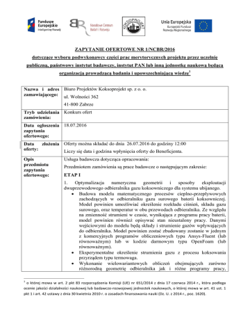 ZAPYTANIE OFERTOWE NR 1/NCBR/2016 dotyczące wyboru podwykonawcy części prac merytorycznych projektu przez uczelnię publiczną, państwowy instytut badawczy, instytut PAN lub inną jednostkę naukową będącą organizacją prowadzącą badania i upowszechniającą wiedzę1 Nazwa i adres Biuro Projektów Koksoprojekt sp. z o. o. zamawiającego: ul. Wolności 362 41-800 Zabrze Tryb udzielania Konkurs ofert zamówienia: Data ogłoszenia 18.07.2016 zapytania ofertowego: Data złożenia Oferty można składać do dnia 26.07.2016 do godziny 12:00 oferty: Liczy się data i godzina wpłynięcia oferty do Beneficjenta. Opis przedmiotu zapytania ofertowego: Usługa badawcza dotycząca opracowania: Przedmiotem zamówienia są prace badawcze o następującym zakresie: ETAP I 1. Optymalizacja numeryczna geometrii i sposoby eksploatacji dwuprzewodowego odbieralnika gazu koksowniczego dla systemu ubijanego. Budowa modelu matematycznego procesów cieplno-przepływowych zachodzących w odbieralniku gazu surowego baterii koksowniczej. Model powinien umożliwiać określenie rozkładu ciśnień, składu gazu surowego, oraz temperatur w obu przewodach odbieralnika. Ze względu na zmienność strumieni w czasie, wynikająca z programu pracy baterii, model powinien również opisywać stan nieustalony pracy. Danymi wejściowymi do modelu będą składy i strumienie gazów wpływających do odbieralnika. Model powinien zostać zbudowany zostanie w jednym z komercyjnych programów obliczeniowych typu Ansys-Fluent (lub równoważnym) lub w kodzie darmowym typu OpenFoam (lub równoważnym). Eksperymentalne określenie strumienia gazu z procesu koksowania przyrządem typu termowaga. Wykonanie wielowariantowych obliczeń obejmujących zarówno różnorodną geometrię odbieralnika jak i różne programy pracy, 1 o której mowa w art. 2 pkt 83 rozporządzenia Komisji (UE) nr 651/2014 z dnia 17 czerwca 2014 r., która podlega ocenie jakości działalności naukowej lub badawczo-rozwojowej jednostek naukowych, o której mowa w art. 41 ust. 1 pkt 1 i art. 42 ustawy z dnia 30 kwietnia 2010 r. o zasadach finansowania nauki (Dz. U. z 2014 r., poz. 1620). zakładające różne momenty przełączania połączeń między komorami koksowymi a przewodami odbieralnika. ETAP II Warunki udziału w postępowaniu 2. Pomiary kontrolne prototypowego odbieralnika dwuprzewodowego Przeprowadzenie pomiarów kontrolnych prototypowego odbieralnika dwuprzewodowego gazu koksowniczego, zabudowanego na jednej z działających baterii koksowniczych. Odbieralnik wyposażony zostanie w szereg przyrządów pomiarowych umożliwiających określenie składu, temperatur i ciśnień gazu w wybranych punktach odbieralnika. Pomiary zbierane będą w sposób ciągły, przy czym okresowo zmieniany zostanie program pracy odbieralnika, tak by przełączenia pomiędzy przewodami odbieralnika poszczególnych komór koksowniczych następowały w różnych momentach cyklu koksowniczego. Określenie optymalnego programu pracy odbieralnika, a dodatkowo udokumentują efekty działania odbieralnika w porównaniu z tradycyjnym odbieralnikiem jednoprzewodowym. Zakup jest planowany w ramach projektu, który ubiega się o dofinansowanie w ramach I osi priorytetowej Programu Operacyjnego Inteligentny Rozwój 20142020 „Wsparcie prowadzenia prac B+R”, Działania 1.1 „Projekty B+R przedsiębiorstw”, Podziałania 1.1.1 „Badania przemysłowe i prace rozwojowe realizowane przez przedsiębiorstwa” w roku 2015. Zgodnie z dokumentacją konkursową dla ww. podziałania ogłoszoną w dniu 2 kwietnia br. przez Narodowe Centrum Badań i Rozwoju (http://www.ncbr.gov.pl/funduszeeuropejskie/poir/konkursy/konkurs11112015/) w szczególności zgodnie z Katalogiem kosztów kwalifikowanych w ramach badań przemysłowych i prac rozwojowych w ramach projektu podwykonawstwo części merytorycznych można zlecać wyłącznie uczelni publicznej, państwowemu instytutowi badawczemu, instytutowi PAN lub innej jednostce naukowej będącej organizacją prowadzącą badania i upowszechniającą wiedzę, o której mowa w art. 2 pkt 83 rozporządzenia Komisji (UE) nr 651/2014 z dnia 17 czerwca 2014 r., która podlega ocenie jakości działalności naukowej lub badawczo-rozwojowej jednostek naukowych, o której mowa w art. 41 ust. 1 pkt 1 i art. 42 ustawy z dnia 30 kwietnia 2010 r. o zasadach finansowania nauki (Dz. U. z 2014 r., poz. 1620). Warunkiem udziału w postępowaniu będzie również udokumentowane minimum pięcioletnie doświadczenie w użytkowaniu oprogramowania typu Ansys-Fluent lub równoważne oraz posiadanie odpowiedniego sprzętu i urządzeń do przeprowadzenia badań. Tym samym do udziału w postępowaniu zaproszone są podmioty spełniające powyższe kryteria. Z udziału w postępowaniu wykluczone są podmioty powiązane osobowo i kapitałowo z zamawiającym. Przez powiązania kapitałowe lub osobowe rozumie się wzajemne powiązania między zamawiającym lub osobami upoważnionymi do zaciągania zobowiązań -2- Kod zamówienia w imieniu zamawiającego lub osobami wykonującymi w imieniu zamawiającego czynności związane z przygotowaniem i przeprowadzaniem procedury wyboru wykonawcy, a wykonawcą, polegające w szczególności na: 1) uczestniczeniu w spółce, jako wspólnik spółki cywilnej lub spółki osobowej, 2) posiadaniu co najmniej 10 % udziałów lub akcji, 3) pełnieniu funkcji członka organu nadzorczego lub zarządzającego, prokurenta, pełnomocnika, 4) pozostawaniu w związku małżeńskim, w stosunku pokrewieństwa lub powinowactwa w linii prostej, pokrewieństwa drugiego stopnia lub powinowactwa drugiego stopnia w linii bocznej lub w stosunku przysposobienia, opieki lub kurateli. Kod zamówienia zgodny ze Wspólnym Słownikiem Zamówień: 73110000-6 Usługi badawcze Termin realizacji przedmiotu oferty: I etap w zakresie geometrii odbieralnika dwuprzewodowego do 7 miesięcy od podpisania umowy Kryteria wyboru oferty Wybór najkorzystniejszej oferty 