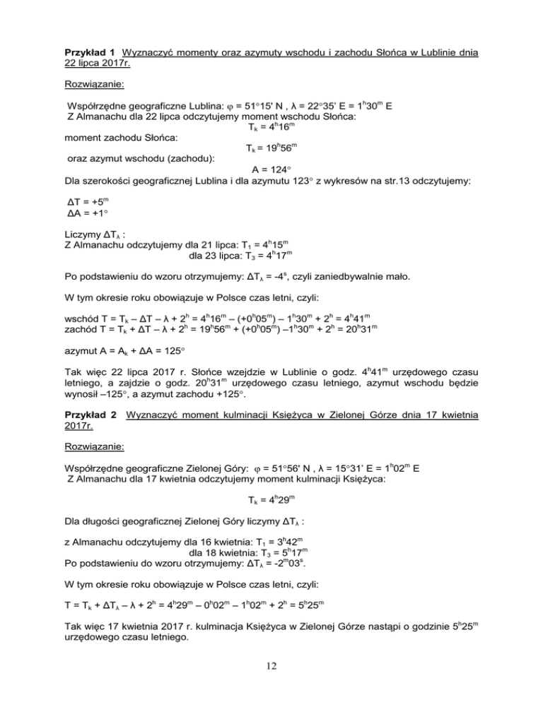 Przykład 1 Wyznaczyć momenty oraz azymuty wschodu i zachodu Słońca w Lublinie dnia 22 lipca 2017r. Rozwiązanie: Współrzędne geograficzne Lublina: ϕ = 51°15' N , λ = 22°35’ E = 1h30m E Z Almanachu dla 22 lipca odczytujemy moment wschodu Słońca: Tk = 4h16m moment zachodu Słońca: Tk = 19h56m oraz azymut wschodu (zachodu): A = 124° Dla szerokości geograficznej Lublina i dla azymutu 123° z wykresów na str.13 odczytujemy: ∆T = +5m ∆A = +1° Liczymy ∆Tλ : Z Almanachu odczytujemy dla 21 lipca: T1 = 4h15m dla 23 lipca: T3 = 4h17m Po podstawieniu do wzoru otrzymujemy: ∆Tλ = -4s, czyli zaniedbywalnie mało. W tym okresie roku obowiązuje w Polsce czas letni, czyli: wschód T = Tk – ∆T – λ + 2h = 4h16m – (+0h05m) – 1h30m + 2h = 4h41m zachód T = Tk + ∆T – λ + 2h = 19h56m + (+0h05m) –1h30m + 2h = 20h31m azymut A = Ak + ∆A = 125° Tak więc 22 lipca 2017 r. Słońce wzejdzie w Lublinie o godz. 4h41m urzędowego czasu letniego, a zajdzie o godz. 20h31m urzędowego czasu letniego, azymut wschodu będzie wynosił –125°, a azymut zachodu +125°. Przykład 2 Wyznaczyć moment kulminacji Księżyca w Zielonej Górze dnia 17 kwietnia 2017r. Rozwiązanie: Współrzędne geograficzne Zielonej Góry: ϕ = 51°56' N , λ = 15°31’ E = 1h02m E Z Almanachu dla 17 kwietnia odczytujemy moment kulminacji Księżyca: Tk = 4h29m Dla długości geograficznej Zielonej Góry liczymy ∆Tλ : z Almanachu odczytujemy dla 16 kwietnia: T1 = 3h42m dla 18 kwietnia: T3 = 5h17m Po podstawieniu do wzoru otrzymujemy: ∆Tλ = -2m03s. W tym okresie roku obowiązuje w Polsce czas letni, czyli: T = Tk + ∆Tλ – λ + 2h = 4h29m – 0h02m – 1h02m + 2h = 5h25m Tak więc 17 kwietnia 2017 r. kulminacja Księżyca w Zielonej Górze nastąpi o godzinie 5h25m urzędowego czasu letniego. 12