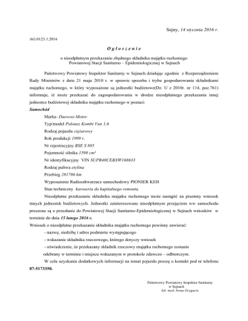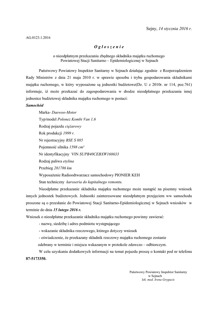 Sejny, 14 stycznia 2016 r. AG.0123.1.2016 Ogłoszenie o nieodpłatnym przekazaniu zbędnego składnika majątku ruchomego Powiatowej Stacji Sanitarno – Epidemiologicznej w Sejnach Państwowy Powiatowy Inspektor Sanitarny w Sejnach działając zgodnie z Rozporządzeniem Rady Ministrów z dnia 21 maja 2010 r. w sprawie sposobu i trybu gospodarowania składnikami majątku ruchomego, w który wyposażone są jednostki budżetowe(Dz. U z 2010r. nr 114, poz.761) informuje, iż może przekazać do zagospodarowania w drodze nieodpłatnego przekazania innej jednostce budżetowej składnika majątku ruchomego w postaci: Samochód Marka- Daewoo-Motor Typ/model Polonez Kombi Van 1,6 Rodzaj pojazdu ciężarowy Rok produkcji 1999 r. Nr rejestracyjny BSE S 885 Pojemność silnika 1598 cm3 Nr identyfikacyjny VIN SUPB40CEBXW168633 Rodzaj paliwa etylina Przebieg 281786 km Wyposażenie Radioodtwarzacz samochodowy PIONIER KEH Stan techniczny karoseria do kapitalnego remontu. Nieodpłatne przekazanie składnika majątku ruchomego może nastąpić na pisemny wniosek innych jednostek budżetowych. Jednostki zainteresowane nieodpłatnym przejęciem ww samochodu proszone są o przesłanie do Powiatowej Stacji Sanitarno-Epidemiologicznej w Sejnach wniosków w terminie do dnia 15 lutego 2016 r. Wniosek o nieodpłatne przekazanie składnika majątku ruchomego powinny zawierać: - nazwę, siedzibę i adres podmiotu występującego - wskazanie składnika rzeczowego, którego dotyczy wniosek - oświadczenie, że przekazany składnik rzeczowy majątku ruchomego zostanie odebrany w terminie i miejscu wskazanym w protokole zdawczo – odbiorczym. W celu uzyskania dodatkowych informacji na temat pojazdu proszę o kontakt pod nr telefonu 87-5173350. Państwowy Powiatowy Inspektor Sanitarny w Sejnach lek. med. Irena Grygucis