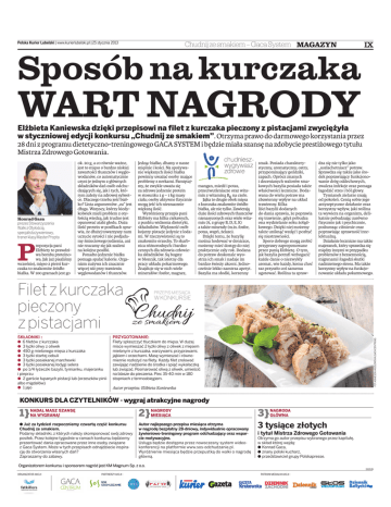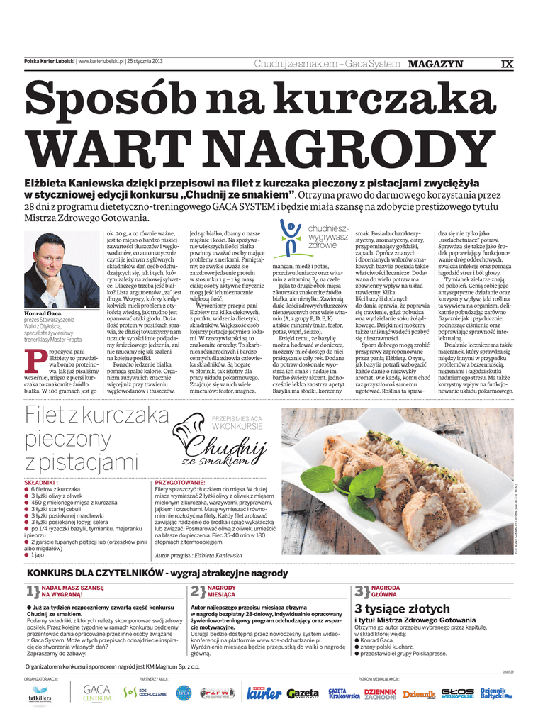 Polska Kurier Lubelski | www.kurierlubelski.pl | 25 stycznia 2013 Chudnij ze smakiem – Gaca System MAGAZYN IX Sposób na kurczaka WART NAGRODY Elżbieta Kaniewska dzięki przepisowi na filet z kurczaka pieczony z pistacjami zwyciężyła w styczniowej edycji konkursu „Chudnij ze smakiem”. Otrzyma prawo do darmowego korzystania przez 28 dni z programu dietetyczno-treningowego GACA SYSTEM i będzie miała szansę na zdobycie prestiżowego tytułu Mistrza Zdrowego Gotowania. ropozycja pani Elżbiety to prawdziwa bomba proteinowa. Jak już pisaliśmy wcześniej, mięso z piersi kurczaka to znakomite źródło białka. W 100 gramach jest go P Jedząc białko, dbamy o nasze mięśnie i kości. Na spożywanie większych ilości białka powinny uważać osoby mające problemy z nerkami. Pamiętajmy, że zwykle uważa się za zdrowe jedzenie protein w stosunku 1 g – 1 kg masy ciała; osoby aktywne fizycznie mogą jeść ich nieznacznie większą ilość. Wyróżniony przepis pani Elżbiety ma kilka ciekawych, z punktu widzenia dietetyki, składników. Większość osób kojarzy pistacje jedynie z lodami. W rzeczywistości są to znakomite orzechy. To skarbnica różnorodnych i bardzo cennych dla zdrowia człowieka składników. Są bogate w błonnik, tak istotny dla pracy układu pokarmowego. Znajduje się w nich wiele minerałów: fosfor, magnez, Filet z kurczaka pieczony z pistacjami SKŁADNIKI : a 6 filetów z kurczaka a 3 łyżki oliwy z oliwek a 450 g mielonego mięsa z kurczaka a 3 łyżki startej cebuli a 3 łyżki posiekanej marchewki a 3 łyżki posiekanej łodygi selera a po 1/4 łyżeczki bazylii, tymianku, majeranku i pieprzu a 2 garście łupanych pistacji lub (orzeszków pinii albo migdałów) a 1 jajo mangan, miedź i potas, przeciwutleniacze oraz witamin z witaminą B6 na czele. Jajka to drugie obok mięsa z kurczaka znakomite źródło białka, ale nie tylko. Zawierają duże ilości zdrowych tłuszczów nienasyconych oraz wiele witamin (A, z grupy B, D, E, K) a także minerały (m.in. fosfor, potas, wapń, żelazo). Dzięki temu, że bazylię można hodować w doniczce, możemy mieć dostęp do niej praktycznie cały rok. Dodana do potraw doskonale wyostrza ich smak i nadaje im bardzo świeży akcent. Jednocześnie lekko zaostrza apetyt. Bazylia ma słodki, korzenny smak. Posiada charakterystyczny, aromatyczny, ostry, przypominający goździki, zapach. Oprócz znanych i docenianych walorów smakowych bazylia posiada także właściwości lecznicze. Dodawana do wielu potraw ma zbawienny wpływ na układ trawienny. Kilka liści bazylii dodanych do dania sprawia, że poprawia się trawienie, gdyż pobudza ona wydzielanie soku żołądkowego. Dzięki niej możemy także uniknąć wzdęć i pozbyć się niestrawności. Sporo dobrego mogą zrobić przyprawy zaproponowane przez panią Elżbietę. O tym, jak bazylia potrafi wzbogacić każde danie o niezwykły aromat, wie każdy, komu choć raz przyszło coś samemu ugotować. Roślina ta spraw- dza się nie tylko jako „uszlachetniacz” potraw. Sprawdza się także jako środek poprawiający funkcjonowanie dróg oddechowych, zwalcza infekcje oraz pomaga łagodzić stres i ból głowy. Tymianek zielarze znają od pokoleń. Cenią sobie jego antyseptyczne działanie oraz korzystny wpływ, jaki roślina ta wywiera na organizm, delikatnie pobudzając zarówno fizycznie jak i psychicznie, podnosząc ciśnienie oraz poprawiając sprawność intelektualną. Działanie lecznicze ma także majeranek, który sprawdza się między innymi w przypadku problemów z bezsennością, migrenami i łagodzi skutki nadmiernego stresu. Ma także korzystny wpływ na funkcjonowanie układu pokarmowego. PRZEPIS MIESIĄCA W KONKURSIE PRZYGOTOWANIE: Filety spłaszczyć tłuczkiem do mięsa. W dużej misce wymieszać 2 łyżki oliwy z oliwek z mięsem mielonym z kurczaka, warzywami, przyprawami, jajkiem i orzechami. Masę wymieszać i równomiernie rozłożyć na filety. Każdy filet zrolować zawijając nadzienie do środka i spiąć wykałaczką lub związać. Posmarować oliwą z oliwek, umieścić na blasze do pieczenia. Piec 35-40 min w 180 stopniach z termoobiegiem. FOT.AGNIESZKAKOZŁOWSKA(GACACENTRUM) Konrad Gaca prezesStowarzyszenia WalkizOtyłością, specjalistażywieniowy, trenerklasyMasterPropta ok. 20 g, a co równie ważne, jest to mięso o bardzo niskiej zawartości tłuszczów i węglowodanów, co automatycznie czyni je jednym z głównych składników dań osób odchudzających się, jak i tych, którym zależy na zdrowej sylwetce. Dlaczego trzeba jeść białko? Lista argumentów „za” jest długa. Wszyscy, którzy kiedykolwiek mieli problem z otyłością wiedzą, jak trudno jest opanować ataki głodu. Duża ilość protein w posiłkach sprawia, że dłużej towarzyszy nam uczucie sytości i nie podjadamy śmieciowego jedzenia, ani nie rzucamy się jak szaleni na kolejne posiłki. Ponadto jedzenie białka pomaga spalać kalorie. Organizm zużywa ich znacznie więcej niż przy trawieniu węglowodanów i tłuszczów. Autor przepisu: Elżbieta Kaniewska KONKURS DLA CZYTELNIKÓW - wygraj atrakcyjne nagrody MASZ SZANSĘ 1} NADAL NA WYGRANĄ! 2} NAGRODY MIESIĄCA 3} NAGRODA GŁÓWNA a Już za tydzień rozpoczniemy czwartą część konkursu Chudnij ze smakiem. Podamy składniki, z których należy skomponować swój zdrowy posiłek. Przez kolejne tygodnie w ramach konkursu będziemy prezentować dania opracowane przez inne osoby związane z Gaca System. Może w tych przepisach odnajdziecie inspirację do stworzenia własnych dań? Zapraszamy do zabawy. Autor najlepszego przepisu miesiąca otrzyma w nagrodę bezpłatny 28-dniowy, indywidualnie opracowany żywieniowo-treningowy program odchudzający oraz wsparcie motywacyjne. Usługa będzie dostępna przez nowoczesny system wideokonferencji na platformie www.sos-odchudzanie.pl. Wyróżnienie miesiąca będzie przepustką do walki o nagrodę główną. 3 tysiące złotych i tytuł Mistrza