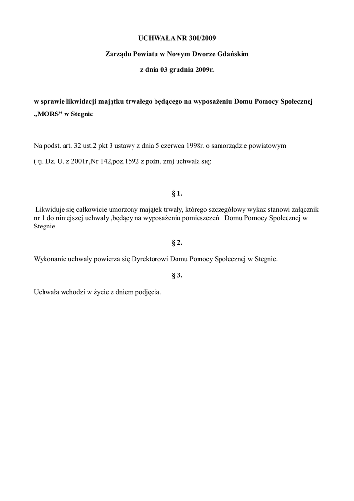 UCHWAŁA NR 300/2009 Zarządu Powiatu w Nowym Dworze Gdańskim z dnia 03 grudnia 2009r. w sprawie likwidacji majątku trwałego będącego na wyposażeniu Domu Pomocy Społecznej „MORS” w Stegnie Na podst. art. 32 ust.2 pkt 3 ustawy z dnia 5 czerwca 1998r. o samorządzie powiatowym ( tj. Dz. U. z 2001r.,Nr 142,poz.1592 z późn. zm) uchwala się: § 1. Likwiduje się całkowicie umorzony majątek trwały, którego szczegółowy wykaz stanowi załącznik nr 1 do niniejszej uchwały ,będący na wyposażeniu pomieszczeń Domu Pomocy Społecznej w Stegnie. § 2. Wykonanie uchwały powierza się Dyrektorowi Domu Pomocy Społecznej w Stegnie. § 3. Uchwała wchodzi w życie z dniem podjęcia. Uzasadnienie Wymieniony w załączniku majątek trwały wykazuje wysoki stopień zużycia jest przestarzały, a jego naprawy lub wymiany podzespołów znacznie przekroczyłby wartość zakupu nowego. Wykazane ruchome środki trwałe- komputery wyprodukowane zostały w latach 1996-2000r. i nie mogą być dalej wykorzystywane, ponieważ ich zły stan techniczny zagrażałby bezpieczeństwu użytkowników. Wycofany z eksploatacji sprzęt został poddany ocenie technicznej przez zakład naprawczy sprzętu elektronicznego, uzyskując negatywną opinię o dalszej przydatności i eksploatacji w jednostce . Załącznik nr 1 do Uchwały Nr 300/2009 Wykaz sprzętu i wyposażenia przeznaczonego do likwidacji w formie poddania utylizacji poprzez wywiezienie ich na składowisko odpadów niebezpiecznych. l.p. Nazwa sprzętu Nr ewid. Ilość Wartość początkowa 1. Zestaw komputerowy Celeron 400 PPGA- ( komputer, monitor 15 cal., ups, drukarka, klawiatura ), Nr ewid. 1- 4- 1 8 Umorzenie 100% 2. Zestaw komputerowy Procesor Pentium- (komputer, monitor 14 cal., drukarka HP 690, skaner, klawiatura, mysz) Nr ew.1-4/6 1 Umorzenie 100% 3. Zestaw komputerowy Celeron 400 PPGA (komputer, monitor optiv 15 cal., ups, klawiatura) Nr ew.1-4/9 1 Umorzenie 100%