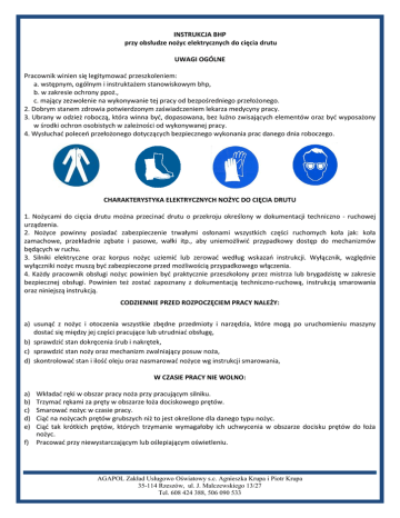 INSTRUKCJA BHP przy obsłudze nożyc elektrycznych do cięcia drutu UWAGI OGÓLNE Pracownik winien się legitymować przeszkoleniem: a. wstępnym, ogólnym i instruktażem stanowiskowym bhp, b. w zakresie ochrony ppoż., c. mający zezwolenie na wykonywanie tej pracy od bezpośredniego przełożonego. 2. Dobrym stanem zdrowia potwierdzonym zaświadczeniem lekarza medycyny pracy. 3. Ubrany w odzież roboczą, która winna być, dopasowana, bez luźno zwisających elementów oraz być wyposażony w środki ochron osobistych w zależności od wykonywanej pracy. 4. Wysłuchać poleceń przełożonego dotyczących bezpiecznego wykonania prac danego dnia roboczego. CHARAKTERYSTYKA ELEKTRYCZNYCH NOŻYC DO CIĘCIA DRUTU 1. Nożycami do cięcia drutu można przecinać drutu o przekroju określony w dokumentacji techniczno - ruchowej urządzenia. 2. Nożyce powinny posiadać zabezpieczenie trwałymi osłonami wszystkich części ruchomych koła jak: koła zamachowe, przekładnie zębate i pasowe, wałki itp., aby uniemożliwić przypadkowy dostęp do mechanizmów będących w ruchu. 3. Silniki elektryczne oraz korpus nożyc uziemić lub zerować według wskazań instrukcji. Wyłącznik, względnie wyłączniki nożyc muszą być zabezpieczone przed możliwością przypadkowego włączenia. 4. Każdy pracownik obsługi nożyc powinien być praktycznie przeszkolony przez mistrza lub brygadzistę w zakresie bezpiecznej obsługi. Powinien też zostać zapoznany z dokumentacją techniczno-ruchową, instrukcją smarowania oraz niniejszą instrukcją. CODZIENNIE PRZED ROZPOCZĘCIEM PRACY NALEŻY: a) usunąć z nożyc i otoczenia wszystkie zbędne przedmioty i narzędzia, które mogą po uruchomieniu maszyny dostać się między jej części pracujące lub utrudniać obsługę, b) sprawdzić stan dokręcenia śrub i nakrętek, c) sprawdzić stan noży oraz mechanizm zwalniający posuw noża, d) skontrolować stan i ilość oleju oraz nasmarować nożyce wg instrukcji smarowania, W CZASIE PRACY NIE WOLNO: a) b) c) d) e) f) Wkładać ręki w obszar pracy noża przy pracującym silniku. Trzymać rękami za pręty w obszarze łoża dociskowego prętów. Smarować nożyc w czasie pracy. Ciąć na nożycach prętów grubszych niż to jest określone dla danego typu nożyc. Ciąć tak krótkich prętów, których trzymanie wymagałoby ich uchwycenia w obszarze docisku prętów do łoża nożyc. Pracować przy niewystarczającym lub oślepiającym oświetleniu. AGAPOL Zakład Usługowo Oświatowy s.c. Agnieszka Krupa i Piotr Krupa 35-114 Rzeszów, ul. J. Malczewskiego 13/27 Tel. 608 424 388, 506 090 533 NALEŻY PAMIĘTAĆ, ŻE: a) W przypadku awarii nożyc należy je zatrzymać, wyłączyć spod napięcia, wypadek zgłosić swojemu bezpośredniemu przełożonemu (brygadziście lub mistrzowi). b) W przypadku przerwy w dopływie prądu lub spadku napięcia w sieci należy ustawić wyłącznik (lub wyłączniki) nożyc w położeniu zerowym. c) Po awarii zasilania włączyć nożyce można dopiero po stwierdzeniu, że napięcie prądu w sieci osiągnęło wymaganą wielkość. d) Pracownik obsługujący nożyce powinien być ubrany w odzież nie utrudniającą ruchów, jednak bez odstających i zwisających części, które grożą pochwyceniem przez znajdujące się w ruchu części maszyny oraz nosić nakrycie głowy uniemożliwiające rozsypywanie się włosów. e) Ręce powinny być odziane w rękawice. PO ZAKOŃCZENIU PRACY NALEŻY: a) b) c) d) e) unieruchomić nożyce, wyłączyć silnik spod napięcia, uporządkować narzędzia, materiały i gotowe wyroby, nożyce oczyścić i nasmarować, przygotować nożyce do przekazania następnej zmianie względnie do rozpoczęcia pracy w dniu następnym. POSTĘPOWANIE W SYTUACJACH AWARYJNYCH W razie zauważenia usterek lub jakichkolwiek zagrożeń na stanowisku należy je natychmiast zgłosić bezpośredniemu przełożonemu by zostały natychmiast usunięte. Do pracy można przystąpić ponownie dopiero po ich usunięciu i ponownym sprawdzeniu pracy urządzenia. W PRZYPADKU POWSTANIA POŻARU NALEŻY - ostrzec osoby znajdujące się w obrębie zagrożenia, - wyłączyć zasilanie budynku w energię elektryczną i odciąć dopływ gazu, - zaalarmować straż pożarną, - powiadomić przełożonych o pożarze, - podjąć decyzję o ewakuacji ludzi, - przystąpić do prowadzenia akcji gaśniczej za pomocą podręcznego sprzętu gaśniczego. W PRZYPADKU ZAISTNIENIA WYPADKU - zabezpieczyć miejsce wypadku, - udzielić poszkodowanemu pierwszej pomocy, - w razie potrzeby wezwać pomoc lekarską, - powiadomić przełożonych. UWAGA 1. W razie wątpliwości co do zachowania warunków bezpieczeństwa pracy pracownik ma prawo przerwać pracę i zwrócić się do przełożonego o wyjaśnienie sytuacji. 2. W przypadku znalezienia się wobec bezpośredniego niebezpieczeństwa ma prawo powstrzymać się od wykonywania pracy. Pracownik w omawianej sytuacji zachowuje prawo do wynagrodzenia, nie może jednak odmówić podjęcia innej, równorzędnej pracy, gdy usunięcie zagrożenia przy poprzednio wykonywanej pracy nie jest możliwe. Zatwierdził ……………………..………. AGAPOL Zakład Usługowo Oświatowy s.c. Agnieszka Krupa i Piotr Krupa 35-114 Rzeszów, ul. J. Malczewskiego 13/27 Tel. 608 424 388, 506 090 533