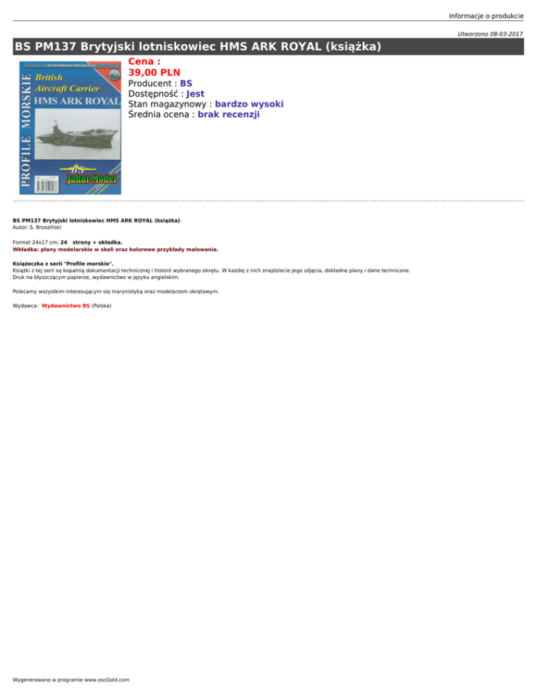 Informacje o produkcie Utworzono 08-03-2017 BS PM137 Brytyjski lotniskowiec HMS ARK ROYAL (książka) Cena : 39,00 PLN Producent : BS Dostępność : Jest Stan magazynowy : bardzo wysoki Średnia ocena : brak recenzji BS PM137 Brytyjski lotniskowiec HMS ARK ROYAL (książka) Autor: S. Brzeziński Format 24x17 cm; 24 strony + okładka. Wkładka: plany modelarskie w skali oraz kolorowe przykłady malowania. Książeczka z serii "Profile morskie". Książki z tej serii są kopalnią dokumentacji technicznej i historii wybranego okrętu. W każdej z nich znajdziecie jego zdjęcia, dokładne plany i dane techniczne. Druk na błyszczącym papierze, wydawnictwo w języku angielskim. Polecamy wszystkim interesującym się marynistyką oraz modelarzom okrętowym. Wydawca: Wydawnictwo BS (Polska) Wygenerowano w programie www.oscGold.com Informacje o produkcie Wygenerowano w programie www.oscGold.com Informacje o produkcie Ważne informacje: Prosimy o dokładne zapoznanie się z zasadami działania naszego sklepu. To bardzo ważne i pozwoli na uniknięcie nieporozumień związanych z koniecznością oczekiwania na przesyłkę. Wszystkie zamówienia realizujemy w kolejności zgłoszeń. Wybranie "przesyłka priorytetowa" jako sposobu wysyłki nie oznacza, że paczka zostanie wysłana na drugi dzień. To tylko rodzaj usługi pocztowej. Firma Jadar-Model jest właścicielem dwóch sklepów. Jeden z nich to sklep internetowy, drugi zaś jest prawdziwy i mieści się w Warszawie, stolicy Polski. Te same modele i akcesoria oferowane w sklepie internetowym sprzedawane są w jednocześnie w obu sklepach. Ponieważ nasza oferta jest bardzo duża nie mamy magazynu z wielką ilością tych samych przedmiotów. Może zdarzyć się, że model, który chcesz kupić został sprzedany w drugim sklepie. Wtedy zostaniesz powiadomiony emailem, że realizacja Twojego zamówienia będzie dłuższa, ponieważ musimy uzupełnić magazyn i czekamy na dostawę od producenta. Prosimy o cierpliwość i wyrozumiałość. Nie ponosimy odpowiedzialności za różnicę w zawartości pudełka w stosunku do prezentowanego zdjęcia. Zdjęcia są zazwyczaj reklamówkami i mogą zawierać również inne części, które nie wchodzą w skład danego produktu. Wygenerowano w programie www.oscGold.com Salon Modelarski Jadar-Model Ul. Jagiellońska 58, 03-468 Warszawa (przy Pl.Hallera) tel.(22) 403-34-30 (w sprawie zamówień prosimy dzwonić: (22) 620-05-39) Tutaj jesteśmy - kliknij poniższy link: Warszawa, Jagiellońska 58 sklep jest czynny w godz.: pon.-pt. 11.oo 19.oo sobota 10.oo 14.oo