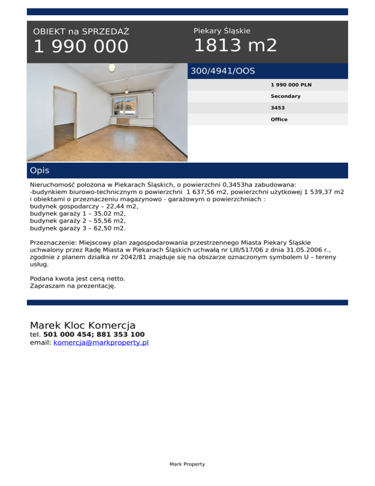 OBIEKT na SPRZEDAŻ 1 990 000 Piekary Śląskie 1813 m2 300/4941/OOS 1 990 000 PLN Secondary 3453 Office Opis Nieruchomość położona w Piekarach Śląskich, o powierzchni 0,3453ha zabudowana: -budynkiem biurowo-technicznym o powierzchni 1 637,56 m2, powierzchni użytkowej 1 539,37 m2 i obiektami o przeznaczeniu magazynowo - garażowym o powierzchniach : budynek gospodarczy – 22,44 m2, budynek garaży 1 – 35,02 m2, budynek garaży 2 – 55,56 m2, budynek garaży 3 – 62,50 m2. Przeznaczenie: Miejscowy plan zagospodarowania przestrzennego Miasta Piekary Śląskie uchwalony przez Radę Miasta w Piekarach Śląskich uchwałą nr LIII/517/06 z dnia 31.05.2006 r., zgodnie z planem działka nr 2042/81 znajduje się na obszarze oznaczonym symbolem U – tereny usług. Podana kwota jest ceną netto. Zapraszam na prezentację. Marek Kloc Komercja tel. 501 000 454; 881 353 100 email: [email protected] Mark Property Powered by TCPDF (www.tcpdf.org)