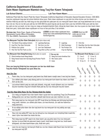 California Department of Education Daim Ntawv Sojntsuam Niamtxiv txog Txoj Kev Kawm Tshwjxeeb Lub School District:_________________________ Lub Tsev Kawm Ntawv:__________________________ Kalifonias Phab Saib Kev Kawm Phab Kev Kawm Tshwjxeeb (California Department of Education Special Education Division, CDE-SED) muaj kev sojntsuam txog qee lub school districts txhua xyoo. Daim ntawv sojntsuam no yog tsim los nrhiav tej kev xav los ntawm cov niamtxiv thiab tej uas lawv tau ntsib txog cov kev qhia thiab kev pabcuam rau cov menyuam kawm ntawv uas muaj teebmeem kev tu-ncua hauv lub cev. Koj cov lus teb yuav pab tau lub CDE-SED los paub txog tej uas tej zaum lawv yuav tau txhimkho thiab yuav pab tau lawv kev saib cov kev ua (xwsli, cov kev nrog cov neeg ua haujlwm/niamtxiv tham, tshuaj tej ntaub ntawv, kev mus xyuas cov tsev kawm ntawv thiab lwm yam). Ua/xa daim ntawv sojntsuam rov mus no tsis pub dhau 2 lub simtiam. Xa mus rau: Robin Ryan, Seeds of Partnership, Sacramento County Office of Education, P.O. Box 269003, Sacramento, CA 95826 LOSSIS Ua daim ntawv sojntsuam hauv LOSSIS Scan tus QR online hauv www.seedsofpartnership.org/ code uas siv ib lub monitoringsurvey xovtooj/tablet Tus Menyuam Txoj Kev Xiam Oob-qhab (khij ib qhov nkaus xwb) O Tsis Myiam Nrog Leejtwg (Autism) O Lagntseg-Digmuag O O Kuaj Pom Tias Xiam Oob-qhab O Tsis Hnov Lus Zoo O O Pobtxha Tsis Lojhlob O Lwm Yam Teebmeem O O Hias Tais Tau/Tsis Puab Lus Zoo O Raug Mob Loj Rau Lub Hlwb Tus Menyuam Hom Neeg/Haivneeg (khij ib qhov rov saum) O Qhab Amelikas lossis Neeg Alaska O Neeg Hawaii lossis lwm haivneeg Koog Povtxwv Pacifiv O Dawb O Chim Sai O Muaj Ntau Yam Kev Xiam Oob-qhab O Kawm Tsis Tau Ntawv Lagntseg Hlwb Ruamqauj Tsis Pomkev Zoo nrog rau Digmuag O Tsis xav teb O Neeg Dub lossis Amelikas Dub O Mev lossis Latino O Axias Tus Menyuam Hnub Nyoog (ua xyoo) O 3 rau 5 O 13 rau 15 O 6 rau 9 O 16 rau 17 O 10 rau 12 O 18 rau 22 s Tsi s Tsi Yog Yog gL O O O O O O O O O O O O O O O O O O O O O O O O O O O O O i ais Kia ub Pa ais Li H s Tsi Txoj Kev Npaj Qhia Raws Tej Tus Tibneeg thiab Kev Sablaj Cov neeg ua haujlwm hauv tsev kawm ntawv xyuas kom kuv paubtxog Txog Cai (Procedural 4. Safeguards) (cov cai hauv tsoomfwv qibsaib tsab kevcai uas ceev niamtxiv cov cai). Li H 3. Cov xibfwb qhia ntawv yeej sibzog pab kuv tus menyuam kom kawm tau ntawv zoo thiab kom ua tau zoo. Lub school district yeej rau siab pab (txhawb, nrog pab, muab sijhawm rau) cov niamtxiv txoj kev koomtes nrog kom txhawb thiab pab tau kuv tus menyuam txoj kev kawm. O Li 2. ev He Hais Dav Dav 1. Feem ntau, kuv tus menyuam yeej kawm tau thiab kawm nceqib raws li nws txoj kev kawm. Yog Yog Thov xav txog koj thiab koj tus menyuam cov kev tau ntsib hauv Txoj Kev Kawm Tshwjxeeb rau xyoo dhau los. 6. Pab neeg npaj kuv tus menyuam txoj IEP muaj txhua tus tibneeg uas tsimnyog tuaj koom nrog (xwsli, naimtxiv, cov xibfwb qhia ntawv, cov kws khomob, cov saib kev kawm/cov neeg sawvcev). Ib tus xibfwb qhia ntawv dav dav tuaj koom kuv tus menyuam lub rooj sablaj uas npaj nws txoj IEP. 7. Hauv lub rooj sablaj IEP, lawv tau los tshuaj kuv tus menyuam cov homphiaj thiab muab kho raws li qhov nws kawm tau lossis tsis tau. O O O O O 8. Pab neeg npaj txoj IEP npaj ib lub chaw kawm uas yog qhia raws li kuv tus menyuam txoj kev tu-ncua thiab lub peevxwm kawm (xwsli, hoob kawm nrog lwm tus, hoob kawm tshwjxeeb, lub xhaw kawm/ntawv qhia, thiab lwm yam). O O O O O 9. Lawv los xav txog kuv lub tswvyim thiab kuv cov kev ntsawv-siab thaum lawv los tsim kuv tus menyuam txoj IEP. O O O O O 5. CR HMONG 6/30/15 O O O O O O O O O O O O O O O O O O O O O O O O O O O O O O O O O O O O O O O O O O O O O O O O O O O O O O O O O O O O O O O O O O O O O O O O O O gL i Pab neeg npaj txoj IEP tau los sib tham txog tias kuv tus menyuam yuav los xeem lub xeev thiab lub district cov kev xeem licasg, nrog rau cov kev pab thiab kho kom nws yuav nrog luag xeem tau. Kia 18. ais Li H Luag siv tej uas sojntsuam pom ntawm kuv tus menyuam los npaj cov homphiaj hauv nws txoj IEP. og sY Tsi 17. aub Cov Kev Npaj Sojntsuam thiab Kev Ua Txoj kev sojntsuam tshwjxeeb uas kuv tus menyuam tau txais qhia txog nws txoj kev 16. tu-ncua thiab ua tau hauv kev kawm. og sY Tsi 15. sP Tsi 14. Kuv tau txais cov reports uas qhia txog kuv tus menyuam txoj kev kawm nceqib zujzus mus rau cov homphiaj hauv nws txoj IEP li lub sijhawm uas luag xa cov report card mus rau lwm tus niamtxiv (xwsli, quarterly, trimester, thiab lwm yam). Kuv tus menyuam muaj sijhawm mus koom cov kev ua hauv lub tsev kawm ntawv thiab sab nraud (xwsli, assemblies, field trips, thiab lwm yam kev ua uas lub tsev kawm ntawv muaj). ais Li H 13. Cov xibfwb qhia ntawv thiab cov neeg khomob paub txog lawv tes haujlwm thiab ua lawv li tej uas hais hauv kuv tus menyuam txoj IEP (xwsli, muab kev pab thiab kho kom nws kawm tau ntawv). Cov xibfwb qhia ntawv nrhiav sijhawm los tsim kom muaj kev sib txuas lus nruab nrab ntawm lub tsev kawm ntawv thiab tom tsev ua ntu zus. O Li 12. Cov xibfwb hauv lub tsev kawm ntawv pab kom kuv tus menyuam kawm tau lawv li cov homphiaj uas teev hauv nws Txoj Kev Npaj Qhia Raws Tej Tus Tibneeg (IEP). ev He 11. Yog Yog Tus Menyuam Txoj Kev Kawm Nceqib Kuv tus menyuam tau txais cov kev kawm uas teev rau hauv nws txoj IEP. (xwsli, kev 10. pab qhia hais lus, xyaum lub cev, pab tawm tswvyim, pab thauj mus los thiab lwm yam). Kev Npaj Mus Rau Theem Ob (Rau cov menyuam yuav muaj 16 xyoo uantej lub rooj sablaj IEP tomntej) 19. 20. 21. Pab neeg npaj txoj IEP tham txog cov kev pab rau kuv tus menyuam rau theem ob (xwsli, kev ua haujlwm, nyob ibleej/muaj lwm tus tuaj pab, cov hoob uas yuavtsum tau kawm). Cov homphiaj thiab kev pab uas muaj nyob rau hauv kuv tus menyuam txoj kev npaj rau theem ob yuav zoo thiab pab tau nws ncav cov homphiaj rau yav tomntej. Pab neeg npaj txoj IEP thiab cov xibfwb qhia ntawv ua raws li cov kev npaj rau theem ob rau kuv tus menyuam. Cov Menyuam Uas Yog Cov Tabtom Kawm Lus Askiv (Yog tsis hais txog nws, tsis txhob twb) Cov xibfw