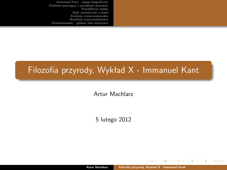 Immanuel Kant - uwagi biograficzne Podmiot poznający a przedmiot poznania Klasyfikacja sądów Sądy syntetyczne a priori Estetyka transcendentalna Analityka transcendentalna Podsumowanie - główne idee kantyzmu Filozofia przyrody, Wykład X - Immanuel Kant Artur Machlarz 5 lutego 2012 Artur Machlarz Filozofia przyrody, Wykład X - Immanuel Kant Immanuel Kant - uwagi biograficzne Podmiot poznający a przedmiot poznania Klasyfikacja sądów Sądy syntetyczne a priori Estetyka transcendentalna Analityka transcendentalna Podsumowanie - główne idee kantyzmu Plan wykładu 1 Immanuel Kant - uwagi biograficzne 2 Podmiot poznający a przedmiot poznania 3 Klasyfikacja sądów 4 Sądy syntetyczne a priori 5 Estetyka transcendentalna 6 Analityka transcendentalna 7 Podsumowanie - główne idee kantyzmu Artur Machlarz Filozofia przyrody, Wykład X - Immanuel Kant Immanuel Kant - uwagi biograficzne Podmiot poznający a przedmiot poznania Klasyfikacja sądów Sądy syntetyczne a priori Estetyka transcendentalna Analityka transcendentalna Podsumowanie - główne idee kantyzmu Immanuel Kant (1724-1804) Rysunek: Immanuel Kant - niemiecki filozof, całe życie spędził w prowincjonalnym Koenigsbergu. Filozof znany przede wszystkim z trzech krytyk: Krytyki czystego rozumu, Krytyki praktycznego rozumu i Krytyki władzy sądzenia i bardzo zdyscyplinowanego, schematycznego, monotonnego trybu życia. Artur Machlarz Filozofia przyrody, Wykład X - Immanuel Kant Immanuel Kant - uwagi biograficzne Podmiot poznający a przedmiot poznania Klasyfikacja sądów Sądy syntetyczne a priori Estetyka transcendentalna Analityka transcendentalna Podsumowanie - główne idee kantyzmu Podmiot poznający a przedmiot poznania W dotychczas omawianych koncepcjach filozoficznych problem relacji między podmiotem poznającym i przedmiotem poznania ujmowany był w następujący sposób: Zadaniem podmiotu poznającego jest odkrycie prawdziwych własności przedmiotu poznania. Przedmiot poznania jest niezależny od podmiotu. Artur Machlarz Filozofia przyrody, Wykład X - Immanuel Kant Immanuel Kant - uwagi biograficzne Podmiot poznający a przedmiot poznania Klasyfikacja sądów Sądy syntetyczne a priori Estetyka transcendentalna Analityka transcendentalna Podsumowanie - główne idee kantyzmu Podmiot poznający a przedmiot poznania W dotychczas omawianych koncepcjach filozoficznych problem relacji między podmiotem poznającym i przedmiotem poznania ujmowany był w następujący sposób: Zadaniem podmiotu poznającego jest odkrycie prawdziwych własności przedmiotu poznania. Przedmiot poznania jest niezależny od podmiotu. Jeśli jakiegokolwiek rodzaju predyspozycje podmiotu poznającego mają wpływ na poznanie przedmiotu, to możemy wtedy mieć do czynienia wyłącznie z błędem poznawczym. Artur Machlarz Filozofia przyrody, Wykład X - Immanuel Kant Immanuel Kant - uwagi biograficzne Podmiot poznający a przedmiot poznania Klasyfikacja sądów Sądy syntetyczne a priori Estetyka transcendentalna Analityka transcendentalna Podsumowanie - główne idee kantyzmu Podmiot poznający a przedmiot poznania W dotychczas omawianych koncepcjach filozoficznych problem relacji między podmiotem poznającym i przedmiotem poznania ujmowany był w następujący sposób: Zadaniem podmiotu poznającego jest odkrycie prawdziwych własności przedmiotu poznania. Przedmiot poznania jest niezależny od podmiotu. Jeśli jakiegokolwiek rodzaju predyspozycje podmiotu poznającego mają wpływ na poznanie przedmiotu, to możemy wtedy mieć do czynienia wyłącznie z błędem poznawczym. W filozofii Kanta to ujęcie zostaje odrzucone. Kant uznaje, że nie możemy wyeliminować czynnika podmiotowego, ale jednocześnie nie staje na stanowisku sceptycyzmu. Artur Machlarz Filozofia przyrody, Wykład X - Immanuel Kant Immanuel Kant - uwagi biograficzne Podmiot poznający a przedmiot poznania Klasyfikacja sądów Sądy syntetyczne a priori Estetyka transcendentalna Analityka transcendentalna Podsumowanie - główne idee kantyzmu Co oznacza “transcendentalny”? Filozofia Kanta to filozofia transcendentalna - jej zadaniem jest analiza warunków możliwości wszelkiego poznania (w szczególności jednak poznania naukowego): warunków poszerzania naszej wiedzy; Artur Machlarz Filozofia przyrody, Wykład X - Immanuel Kant Immanuel Kant - uwagi biograficzne Podmiot poznający a przedmiot poznania Klasyfikacja sądów Sądy syntetyczne a priori Estetyka transcendentalna Analityka transcendentalna Podsumowanie - główne idee kantyzmu Co oznacza “transcendentalny”? Filozofia Kanta to filozofia transcendentalna - jej zadaniem jest analiza warunków możliwości wszelkiego poznania (w szczególności jednak poznania naukowego): warunków poszerzania naszej wiedzy; ale przede wszystkim poszerzania prowadzącego do wiedzy pewnej i niezmiennej; Artur Machlarz Filozofia przyrody, Wykład X - Immanuel Kant Immanuel Kant - uwagi biograficzne Podmiot poznający a przedmiot poznania Klasyfikacja sądów Sądy syntetyczne a priori Estetyka transcendentalna Analityka transcendentalna Podsumowanie - główne idee kantyzmu Co oznacza “transcendentalny”? Filozofia Kanta to filozofia transcendentalna - jej zadaniem jest analiza warunków możliwości wszelkiego poznania (w szczególności jednak poznania naukowego): warunków poszerzania naszej wiedzy; ale przede wszystkim poszerzania prowadzącego do wiedzy pewnej i niezmiennej; a zatem tego rodzaju wiedzy, która nie będzie zależała od poznania empirycznego. Artur Machlarz Filozofia przyrody, Wykład X - Immanuel Kant Immanuel Kant - uwagi biograficzne Podmiot poznający a przedmiot poznania Klasyfikacja sądów Sądy syntetyczne a priori Estetyka transcendentalna Analityka transcendentalna Podsumowanie - główne idee kantyzmu Co oznacza “transcendentalny”? Filozofia Kanta to filozofia transcendentalna - jej zadaniem jest analiza warunków możliwości wszelkiego poznania (w szczególności jednak poznania n