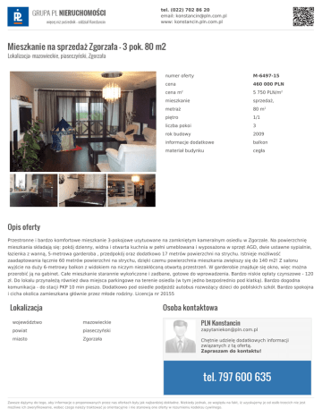tel. (022) 702 86 20 email: [email protected] www: konstancin.pln.com.pl Mieszkanie na sprzedaż Zgorzała - 3 pok. 80 m2 Lokalizacja: mazowieckie, piaseczyński, Zgorzała numer oferty M-6497-15 cena 460 000 PLN cena m 5 750 PLN/m2 mieszkanie sprzedaż, metraż 80 m2 piętro 1/1 liczba pokoi 3 rok budowy 2009 informacje dodatkowe balkon materiał budynku cegła 2 Opis oferty Przestronne i bardzo komfortowe mieszkanie 3-pokojowe usytuowane na zamkniętym kameralnym osiedlu w Zgorzale. Na powierzchnię mieszkania składają się: pokój dzienny, widna i otwarta kuchnia w pełni umeblowana i wyposażona w sprzęt AGD, dwie ustawne sypialnie, łazienka z wanną, 5-metrowa garderoba , przedpokój oraz dodatkowo 17 metrów powierzchni na strychu. Istnieje możliwość zaadaptowania łącznie 60 metrów powierzchni na strychu, dzięki czemu powierzchnia mieszkania zwiększy się do 140 m2! Z salonu wyjście na duży 6-metrowy balkon z widokiem na niczym niezakłóconą otwartą przestrzeń. W garderobie znajduje się okno, więc można przerobić ją na gabinet. Całe mieszkanie starannie wykończone i zadbane, gotowe do wprowadzenia. Bardzo niskie opłaty czynszowe - 120 zł. Do lokalu przynależą również dwa miejsca parkingowe na terenie osiedla (w tym jedno bezpośrednio pod klatką). Bardzo dogodna komunikacja - do stacji PKP 10 min pieszo. Dodatkowo pod osiedle podjeżdż autobus rozwożący dzieci do pobliskich szkół. Bardzo spokojna i cicha okolica zamieszkana głównie przez młode rodziny. Licencja nr 20155 Lokalizacja Osoba kontaktowa PLN Konstancin województwo mazowieckie powiat piaseczyński [email protected] miasto Zgorzała Chętnie udzielę dodatkowych informacji związanych z tą ofertą. Zapraszam do kontaktu! tel. 797 600 635 Zawsze dążymy do tego, aby informacje o proponowanych przez nas ofertach były jak najbardziej dokładne. Niekiedy jednak, ze względu na fakt, iż uzyskujemy je od osób trzecich nie jest możliwe ich zweryfikowanie, wobec czego należy traktować je orientacyjnie i nie stanowią one oferty w rozumieniu kodeksu cywilnego.