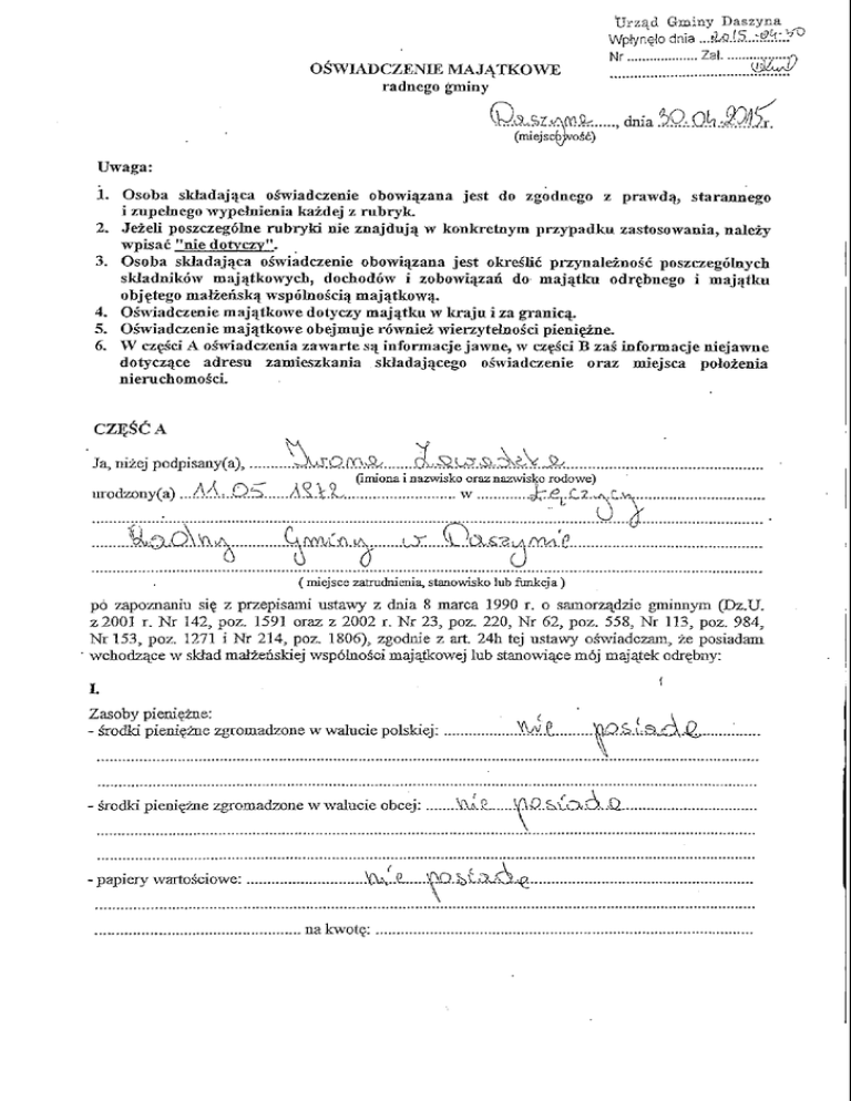 Urz^d Gminy Daszyna OSWIADCZENIE MAJ^TKOWE Nr , Zat -,,..- radnego gminy ....,faa.^.Ukl.>.£dl2r. (miejscbivosc) Uwaga: 1. Osoba skladaj^ca oswiadczenie obowi^zana jest do zgodnego z prawd% starannego i znpemego wypehrienia kazdej z rubryk. 2. Jezeli poszczegolne rubryki nie znajduj^ w konkretnym przypadku zastosowania, nalezy wpisac "nie dotyczy". 3. Osoba skladaj^ca oswiadczenie obowiajzana jest okreslic przynaleznosc poszczegolnych skladnikow majqtkowych, dochodow i zobowiajzan do maj^tku odr^bnego i majqtku objetego matzensk^ wspolnosci^ maj^tkowq. 4. Oswiadczenie maj%tkowe dotyczy maj^tku w kraju i za granic% 5. Oswiadczenie maj^tkowe obejmnje rowniez wierzytelnosci pieniezne. 6. W czesci A oswiadczenia zawarte s^ informacje jawne, w czesci B zas informacje niejawne dotycz^ce adresn zamieszkania skladaj^cego oswiadczenie oraz miejsca polozenia nieruchomosci. CZ^SCA Ja, nizej podpisany(a), . _^ urodzony(a) ...AA:..C?±j , _ (imiona i nazwisko oraz nazwisko rodowe) A.Vi'.L-. w ^ 6 ( miejsce zatrudnienia, stanowisko lub funkcja ) po zapoznaniu si^ z przepisami ustawy z dnia 8 marca 1990 r. o samorza_dzie gminnym (Dz.U. 22001 r. Nr 142, poz. 1591 oraz z 2002 r. Nr 23, poz. 220, Nr 62, poz. 558, Nr 113, poz. 984, Nr 153, poz. 1271 i Nr 214, poz. 1806)5 zgodnie z art. 24h tej ustawy oswiadczam, ze posiadam wchodza_ce w slciad maizenskiej wspolnosci majajkowej lub stanowiace moj majatek odrqbny: Zasoby pieni^zue: - srodki pieni^zue zgromadzone w walucie polskiej: - srodki pieniezne zgromadzone w walucie obcej: - papiery wartosciowe: X\: .VX^JL 1. Dom o powierzchni : ..'s,LAQ>^&/^.. m , o wartosci: tytul prawny:................................................................. 2. Mieszkanie o powierzchni: .. Ju.w.j...k«L.. m2, o wartosci: tytul prawny: .............. .U 3. Gospodarstwo rolne: rodzaj gospodarstwa: ...A£wX.~ ~'ftQ.V^.^2:A££^ .................. , powierzchnia: o wartosci:.................................... ................................................................... rodzaj zabudowy: tytul prawny: Z tego tytuiu osiajmalem(e}ain) w roku ubie^ym przychod i dochod w wysokosci: 4. Inne nieruchomosci: powierzchnia: .u&L .UQ.cEy.S o wartosci: tytui prawny: m. 1. Posiadam udziaiy w spolkach handlowych z udziatem gminnych os6b prawnych lub przedsi^biorcow, w ktorych uczestnicza^ takte osoby — nalezy podac liczb^ i emitenta udziaiow: \y te stanowia^pakiet wiekszy niz 1 Z tego tytuiu osiajmalem(elam) w roku ubieglym dochod w wysokosci:,..'. 2. Posiadam udziaiy w innych spolkach handlowych — nalezy podac liczbe. i emitenta udziaiow: Z tego tytuiu osi^gnaleni(?lam) w roku ubieglym> dochod w wysokosci: IV. 1. Posiadam akcje w spolkach handlowych z udzialein gminnych osob prawnych lub przedsiebiorcow, w ktorych uczestnicza^takie osoby - nalezy podac liczb§ i emitenta akcji: \e te stanowia_pakiet wie_kszy niz 1 Z tego tytutu osiaj^aj:em(elarn) wroku ubiegrym dochod w wysokosci; 2. Posiadam akcje w innych spolkach handlowych - nalezy podac liczbe/ i emitenta akcji; Z tego tytuhi osiaj*nafem(ej:ain) w roku ubieglym dochod w wysokosci: V. Nabylem(am) /nabyl moj malzonek, z wylaczeniem mienia przynaleznego do jego maja_tku odr^bnego/ od Skarbu Panstwa, innej panstwowej osoby prawnej, jednostki samorzajdu terytoriahiego, ich zwiazkow lub od komunalnej osoby prawnej nast^pujajse mienie, ktore podlegalo zbyciu w drodze przetargu - nalezy podac opis mienia i dat^nabycia, odkogo : . VI. 1. Prowadz§ dzialalnosc gospodarcza^ (nalezy podac form$ prawna_ i przedmiot dzialalnosci): X3.^.vS....^Q...&b*£cx£!^U.x... W - osobiscie -A .V^£A Jl.<k-..,/.:./.)..-..-.pL.v:./A.Vv..., AA u o o / l ^ IX 0 - wspolnie 2 innymi osobami Z tego tytuhi osia£nalem(elam) w roku ubieglym przychod i dochod w wysokosci: o\iiM,W-asL.V\ ** 2. Zarzajizam dzialalnoscia_gospodarcza_lub jestem przedstawicielem, p&hiomocnikiem takiej dzialahio^ci (nalezy podac form? prawna_i przedmiot dzialalnosci): - osobiscie - wspohue z innymi osobami i - -^ " 4 2 tego tytuiu 6si^gnaiem(e^am) w roku ubiegiym dochod w wysokosci: VII. W spoikach handlowych (nazwa, siedziba spoiki): jestem czionkiem zarzajlu (odkiedy): jestem czionkiem rady uadzorczej (od kiedy): .... jestem czionkiem komisji rewizyjnej (od kiedy): Z tego tytuiu osi£|.gnaiem(e;lam) w roku ubiegiym doch6d w wysokosci: VIII. Inne dochody osi^gane z tytuiu zatrudnienia lub innej dzialalnosci zarobkowej lub zajec, z podaniem kwot uzyskiwanych z kazdego tytuiu: ............................................................................... ........ ...... Alfe ^ \i mienia ruchomego o wartosci powyzej 10.000 ztotych (w przy mechamczaych nalezy podac mark^, model i rok produkcji): ............................................................... X. Zobowiazania pieni^zne o wartosci powyzej 10.000 ztotych, w tym zaciajmiete kredyty i pozyczki .'/,.^<??.^.^.j?....65.UA>..)if5..vi.. * o^.O.^<?^.^.....to.£S5..00.w...VEft^.ci^ .^...i.c?a.&.A.....mv ........ 2>A.,..U • • - -*^ CZ^SC B Powyzsze oswiadczenie skiadam swiadomy(a), iz na podstawie art. 233 § 1 Kodeksu karnego za podanie nieprawdy lub zatajenie prawdy grozi kara pozbawienia wolnosci. -: C\ T- S\JjS.iiTiV^(v?.^...u6'.Q.b.-£3 <cM6 ( miejscpwosc, data) ( podpis )