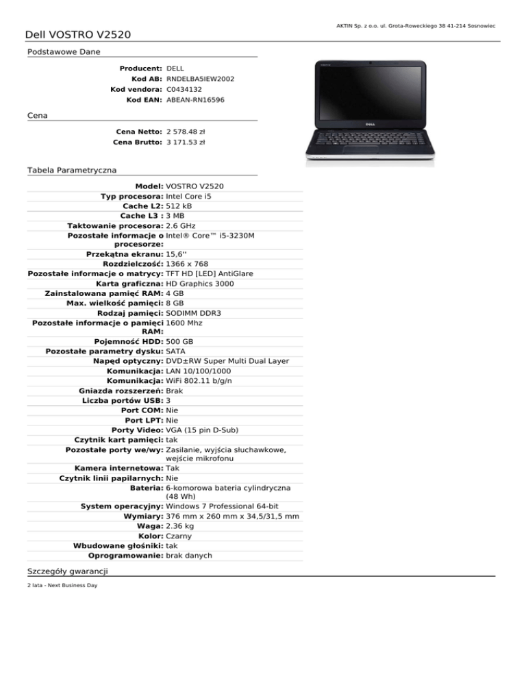 AKTIN Sp. z o.o. ul. Grota-Roweckiego 38 41-214 Sosnowiec Dell VOSTRO V2520 Podstawowe Dane Producent: DELL Kod AB: RNDELBA5IEW2002 Kod vendora: C0434132 Kod EAN: ABEAN-RN16596 Cena Cena Netto: 2 578.48 zł Cena Brutto: 3 171.53 zł Tabela Parametryczna Model: VOSTRO V2520 Typ procesora: Intel Core i5 Cache L2: 512 kB Cache L3 : 3 MB Taktowanie procesora: 2.6 GHz Pozostałe informacje o Intel® Core™ i5-3230M procesorze: Przekątna ekranu: 15,6'' Rozdzielczość: 1366 x 768 Pozostałe informacje o matrycy: TFT HD [LED] AntiGlare Karta graficzna: HD Graphics 3000 Zainstalowana pamięć RAM: 4 GB Max. wielkość pamięci: 8 GB Rodzaj pamięci: SODIMM DDR3 Pozostałe informacje o pamięci 1600 Mhz RAM: Pojemność HDD: 500 GB Pozostałe parametry dysku: SATA Napęd optyczny: DVD±RW Super Multi Dual Layer Komunikacja: LAN 10/100/1000 Komunikacja: WiFi 802.11 b/g/n Gniazda rozszerzeń: Brak Liczba portów USB: 3 Port COM: Nie Port LPT: Nie Porty Video: VGA (15 pin D-Sub) Czytnik kart pamięci: tak Pozostałe porty we/wy: Zasilanie, wyjścia słuchawkowe, wejście mikrofonu Kamera internetowa: Tak Czytnik linii papilarnych: Nie Bateria: 6-komorowa bateria cylindryczna (48 Wh) System operacyjny: Windows 7 Professional 64-bit Wymiary: 376 mm x 260 mm x 34,5/31,5 mm Waga: 2.36 kg Kolor: Czarny Wbudowane głośniki: tak Oprogramowanie: brak danych Szczegóły gwarancji 2 lata - Next Business Day Powered by TCPDF (www.tcpdf.org)