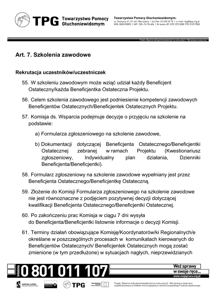 Art. 7. Szkolenia zawodowe Rekrutacja uczestników/uczestniczek 55. W szkoleniu zawodowym może wziąć udział każdy Beneficjent Ostateczny/każda Beneficjentka Ostateczna Projektu. 56. Celem szkolenia zawodowego jest podniesienie kompetencji zawodowych Beneficjentów Ostatecznych/Beneficjentek Ostatecznych Projektu. 57. Komisja ds. Wsparcia podejmuje decyzje o przyjęciu na szkolenie na podstawie: a) Formularza zgłoszeniowego na szkolenie zawodowe, b) Dokumentacji dotyczącej Beneficjenta Ostatecznego/Beneficjentki Ostatecznej zebranej w ramach Projektu (Kwestionariusz zgłoszeniowy, Indywidualny plan działania, Dzienniki Beneficjenta/Beneficjentki). 58. Formularz zgłoszeniowy na szkolenie zawodowe wypełniany jest przez Beneficjenta Ostatecznego/Beneficjentkę Ostateczną. 59. Złożenie do Komisji Formularza zgłoszeniowego na szkolenie zawodowe nie jest równoznaczne z podjęciem pozytywnej decyzji dotyczącej kwalifikacji Beneficjenta Ostatecznego/Beneficjentki Ostatecznej. 60. Po zakończeniu prac Komisja w ciągu 7 dni wysyła do Beneficjenta/Beneficjentki listownie informacje o decyzji Komisji. 61. Terminy działań obowiązujące Komisję/Koordynatorów/ki Regionalnych/e określane w poszczególnych procesach w komunikatach kierowanych do Beneficjentów Ostatecznych/ Beneficjentek Ostatecznych mogą zostać zmienione (w tym przedłużone) w sytuacjach nagłych, nieprzewidzianych Strona | 2 lub wymagających zgromadzenia większej ilości danych dotyczących osób zainteresowanych uczestnictwem w tej formie wsparcia. 62. Beneficjent Ostateczny/Beneficjentka Ostateczna może zrezygnować z uczestnictwa w szkoleniu i powiadomić o swojej decyzji Komisję ds. Wsparcia najpóźniej na 7 dni przed jego rozpoczęciem. 63. W przypadku nie powiadomienia o niemożności uczestnictwa w szkoleniu zawodowym na 7 dni przed jego rozpoczęciem, bądź nie stawienia się na nim w ciągu 2 dni od jego rozpoczęcia, Koordynator Merytoryczny Projektu ma możliwość nie przyznania dalszego Wsparcia w Projekcie. Uczestnictwo w szkoleniu zawodowym 64. Uczestnicy i uczestniczki szkoleń ponoszą koszty dojazdu na i ze szkolenia. 65. Beneficjent Ostateczny/Beneficjentka Ostateczna zobowiązany/zobowiązana jest do: a) aktywnego uczestnictwa w szkoleniu zawodowym, b) zapoznania się i zastosowania do Regulaminu, c) przestrzegania obowiązujących w czasie szkoleń zawodowych norm i reguł, określonych wspólnie z osobą odpowiadająca za przeprowadzenie danego szkolenia na jego początku, 66. Niezastosowanie się do powyższych obowiązków może spowodować wykluczenie z tej formy wsparcia