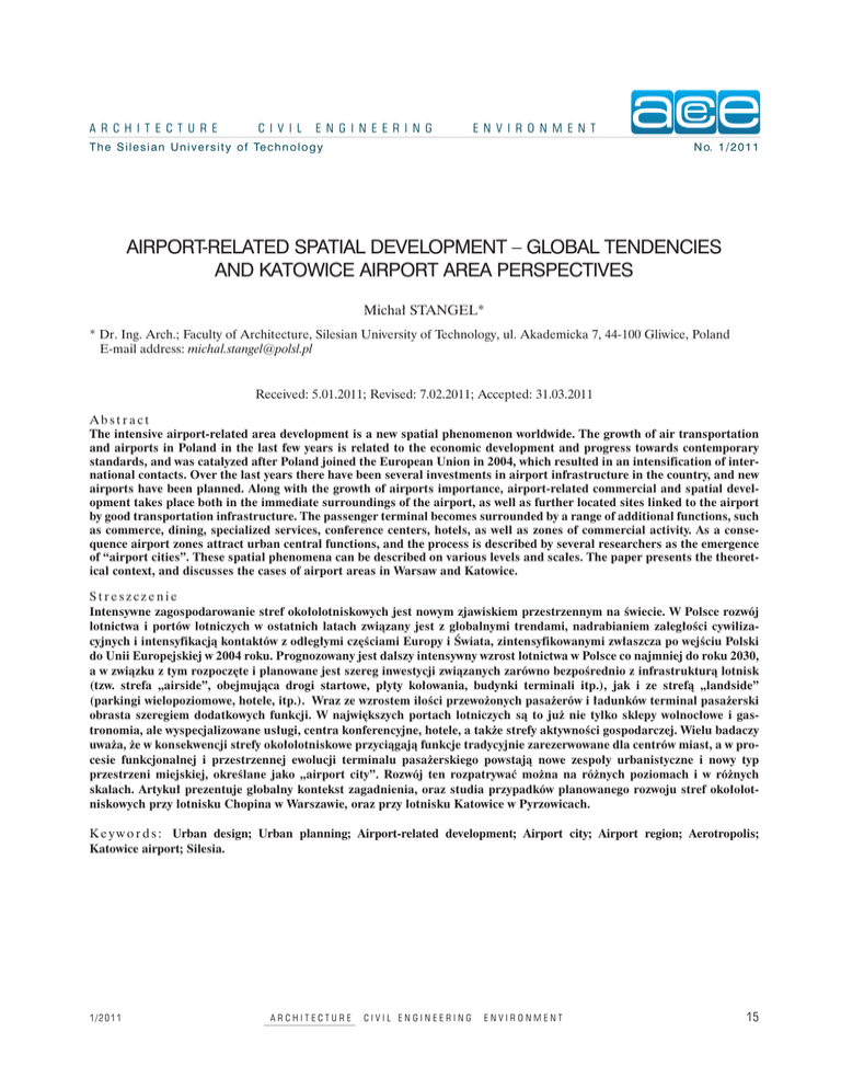 A R C H I T E C T U R E C I V I L E N G I N E E R I N G E N V I R O N M E N T T h e S i l e s i a n U n i v e r s i t y o f Te c h n o l o g y N o. 1 / 2 0 1 1 AIRPORT-RELATED SPATIAL DEVELOPMENT – GLOBAL TENDENCIES AND KATOWICE AIRPORT AREA PERSPECTIVES Michał STANGEL* * Dr. Ing. Arch.; Faculty of Architecture, Silesian University of Technology, ul. Akademicka 7, 44-100 Gliwice, Poland E-mail address: [email protected] Received: 5.01.2011; Revised: 7.02.2011; Accepted: 31.03.2011 Abstract The intensive airport-related area development is a new spatial phenomenon worldwide. The growth of air transportation and airports in Poland in the last few years is related to the economic development and progress towards contemporary standards, and was catalyzed after Poland joined the European Union in 2004, which resulted in an intensification of international contacts. Over the last years there have been several investments in airport infrastructure in the country, and new airports have been planned. Along with the growth of airports importance, airport-related commercial and spatial development takes place both in the immediate surroundings of the airport, as well as further located sites linked to the airport by good transportation infrastructure. The passenger terminal becomes surrounded by a range of additional functions, such as commerce, dining, specialized services, conference centers, hotels, as well as zones of commercial activity. As a consequence airport zones attract urban central functions, and the process is described by several researchers as the emergence of “airport cities”. These spatial phenomena can be described on various levels and scales. The paper presents the theoretical context, and discusses the cases of airport areas in Warsaw and Katowice. Streszczenie Intensywne zagospodarowanie stref okołolotniskowych jest nowym zjawiskiem przestrzennym na świecie. W Polsce rozwój lotnictwa i portów lotniczych w ostatnich latach związany jest z globalnymi trendami, nadrabianiem zaległości cywilizacyjnych i intensyfikacją kontaktów z odległymi częściami Europy i Świata, zintensyfikowanymi zwłaszcza po wejściu Polski do Unii Europejskiej w 2004 roku. Prognozowany jest dalszy intensywny wzrost lotnictwa w Polsce co najmniej do roku 2030, a w związku z tym rozpoczęte i planowane jest szereg inwestycji związanych zarówno bezpośrednio z infrastrukturą lotnisk (tzw. strefa „airside”, obejmująca drogi startowe, płyty kołowania, budynki terminali itp.), jak i ze strefą „landside” (parkingi wielopoziomowe, hotele, itp.). Wraz ze wzrostem ilości przewożonych pasażerów i ładunków terminal pasażerski obrasta szeregiem dodatkowych funkcji. W największych portach lotniczych są to już nie tylko sklepy wolnocłowe i gastronomia, ale wyspecjalizowane usługi, centra konferencyjne, hotele, a także strefy aktywności gospodarczej. Wielu badaczy uważa, że w konsekwencji strefy okołolotniskowe przyciągają funkcje tradycyjnie zarezerwowane dla centrów miast, a w procesie funkcjonalnej i przestrzennej ewolucji terminalu pasażerskiego powstają nowe zespoły urbanistyczne i nowy typ przestrzeni miejskiej, określane jako „airport city”. Rozwój ten rozpatrywać można na różnych poziomach i w różnych skalach. Artykuł prezentuje globalny kontekst zagadnienia, oraz studia przypadków planowanego rozwoju stref okołolotniskowych przy lotnisku Chopina w Warszawie, oraz przy lotnisku Katowice w Pyrzowicach. K e y w o r d s : Urban design; Urban planning; Airport-related development; Airport city; Airport region; Aerotropolis; Katowice airport; Silesia. 1/2011 ARCHITECTURE CIVIL ENGINEERING ENVIRONMENT 15