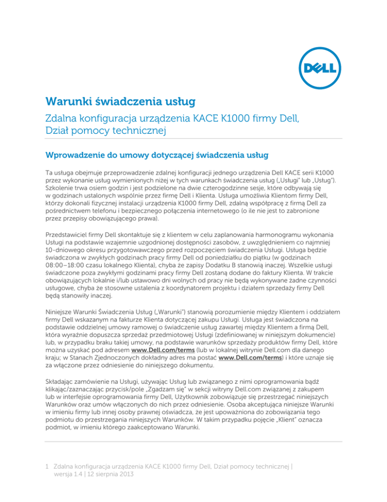 Warunki świadczenia usług Zdalna konfiguracja urządzenia KACE K1000 firmy Dell, Dział pomocy technicznej Wprowadzenie do umowy dotyczącej świadczenia usług Ta usługa obejmuje przeprowadzenie zdalnej konfiguracji jednego urządzenia Dell KACE serii K1000 przez wykonanie usług wymienionych niżej w tych warunkach świadczenia usług („Usługi” lub „Usług”). Szkolenie trwa osiem godzin i jest podzielone na dwie czterogodzinne sesje, które odbywają się w godzinach ustalonych wspólnie przez firmę Dell i Klienta. Usługa umożliwia Klientom firmy Dell, którzy dokonali fizycznej instalacji urządzenia K1000 firmy Dell, zdalną współpracę z firmą Dell za pośrednictwem telefonu i bezpiecznego połączenia internetowego (o ile nie jest to zabronione przez przepisy obowiązującego prawa). Przedstawiciel firmy Dell skontaktuje się z klientem w celu zaplanowania harmonogramu wykonania Usługi na podstawie wzajemnie uzgodnionej dostępności zasobów, z uwzględnieniem co najmniej 10-dniowego okresu przygotowawczego przed rozpoczęciem świadczenia Usługi. Usługa będzie świadczona w zwykłych godzinach pracy firmy Dell od poniedziałku do piątku (w godzinach 08:00–18:00 czasu lokalnego Klienta), chyba że zapisy Dodatku B stanowią inaczej. Wszelkie usługi świadczone poza zwykłymi godzinami pracy firmy Dell zostaną dodane do faktury Klienta. W trakcie obowiązujących lokalnie i/lub ustawowo dni wolnych od pracy nie będą wykonywane żadne czynności usługowe, chyba że stosowne ustalenia z koordynatorem projektu i działem sprzedaży firmy Dell będą stanowiły inaczej. Niniejsze Warunki Świadczenia Usług („Warunki”) stanowią porozumienie między Klientem i oddziałem firmy Dell wskazanym na fakturze Klienta dotyczącej zakupu Usługi. Usługa jest świadczona na podstawie oddzielnej umowy ramowej o świadczenie usług zawartej między Klientem a firmą Dell, która wyraźnie dopuszcza sprzedaż przedmiotowej Usługi (zdefiniowanej w niniejszym dokumencie) lub, w przypadku braku takiej umowy, na podstawie warunków sprzedaży produktów firmy Dell, które można uzyskać pod adresem www.Dell.com/terms (lub w lokalnej witrynie Dell.com dla danego kraju; w Stanach Zjednoczonych dokładny adres ma postać www.Dell.com/terms) i które uznaje się za włączone przez odniesienie do niniejszego dokumentu. Składając zamówienie na Usługi, używając Usług lub związanego z nimi oprogramowania bądź klikając/zaznaczając przycisk/pole „Zgadzam się” w sekcji witryny Dell.com związanej z zakupem lub w interfejsie oprogramowania firmy Dell, Użytkownik zobowiązuje się przestrzegać niniejszych Warunków oraz umów włączonych do nich przez odniesienie. Osoba akceptująca niniejsze Warunki w imieniu firmy lub innej osoby prawnej oświadcza, że jest upoważniona do zobowiązania tego podmiotu do przestrzegania niniejszych Warunków. W takim przypadku pojęcie „Klient” oznacza podmiot, w imieniu którego zaakceptowano Warunki. 1 Zdalna konfiguracja urządzenia KACE K1000 firmy Dell, Dział pomocy technicznej | wersja 1.4 | 12 sierpnia 2013 Zakres umowy o Usługi Kod SKU usługi Zobacz Dodatek A Usługa obejmuje następujące główne etapy: • Dział pomocy technicznej: 1. Utworzenie do trzech kategorii i podkategorii. 2. Zdefiniowanie nie więcej niż trzech przepływów pracy przypisywania zgłoszeń. 3. Zdefiniowanie nie więcej niż trzech przepływów pracy eskalacji zgłoszeń. 4. Utworzenie nie więcej niż pięciu pól niestandardowych. 5. Utworzenie nie więcej niż dwóch niestandardowych raportów zgłoszeń. • Zamknięcie projektu: 1. Przeprowadzenie z Klientem sesji krótkiego zapoznania z produktem i przejrzenie związanej z nim dokumentacji. Takie omówienie nie zastępuje dostępnych kursów dla Klientów w zakresie tych produktów. 2. Uzyskanie od Klienta potwierdzenia realizacji Usług. Wyłączone usługi • Instalacja oprogramowania lub systemu operacyjnego na jakimkolwiek hoście. • Fizyczna instalacja jakiegokolwiek sprzętu lub oprogramowania. • Instalacja, określenie ustawień lub konfiguracja usługi Active Directory®, serwerów pocztowych, urządzeń sieciowych i aplikacji innych firm. • Korzystanie z produktów KACE w połączeniu z nieobsługiwanymi wersjami systemów operacyjnych, dodatkami Service Pack, przeglądarkami internetowymi i produktami innych firm. • Konfigurowanie i administrowanie serwerami infrastruktury wirtualnej z zainstalowanym oprogramowaniem V-KBOX. • Importowanie istniejących danych działu pomocy technicznej. • Wszelkie czynności niewymienione wyraźnie w niniejszych Warunkach świadczenia usługi. Obowiązki Klienta związane z Usługą • Dopilnowanie, by pożądana konfiguracja spełniała minimalne wymagania systemowe dostawcy w zakresie konfiguracji urządzeń i oprogramowania (takie jak wymagania dotyczące dodatków Service Pack, jąder czy systemu BIOS). • Zapewnienie dostępności w miejscu instalacji połączeń telefonicznych i szybkich, bezpiecznych połączeń internetowych do komunikacji z firmą Dell. • W razie potrzeby zapewnienie odpowiedniej łączności sieciowej na potrzeby zdalnego zarządzania. • Zapewnienie dostępności w trakcie wykonywania Usługi co najmniej jednej osoby o uprawnieniach administratora systemu do kontaktów z firmą Dell w sprawach technicznych. • Wyrównanie dysków. • Pozyskanie odpowiedniego wyposażenia do konfiguracji sprzętu i oprogramowania. • Przed zaplanowaniem wykonania Usługi zadbanie o to, aby wszystkie systemy nią objęte były rozmieszczone w szafach typu rack, okablowane i wolne od błędów. 2 Zdalna konfiguracja urządzenia KACE K1000 firmy Dell, Dział pomocy technicznej | wersja 1.4 | 12 sierpnia 2013 Dodatkowe warunki dotyczące Usługi 1 Obsługiwane produkty Niniejsza Usługa jest dostępna dla wybranych Produktów firmy Dell objętych pomocą techniczną, takich jak OptiPlex™, Latitude™, P