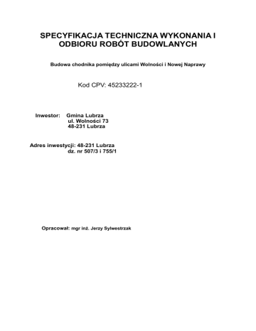 SPECYFIKACJA TECHNICZNA WYKONANIA I ODBIORU ROBÓT BUDOWLANYCH Budowa chodnika pomiędzy ulicami Wolności i Nowej Naprawy Kod CPV: 45233222-1 Inwestor: Gmina Lubrza ul. Wolności 73 48-231 Lubrza Adres inwestycji: 48-231 Lubrza dz. nr 507/3 i 755/1 Opracował: mgr inż. Jerzy Sylwestrzak SZCZEGÓŁOWA SPECYFIKACJA TECHNICZNA PODJAZD Z KOSTKI BRUKOWEJ CPV 45233000-9 1. WSTĘP 1.1 Przedmiot SST Przedmiotem niniejszej szczegółowej specyfikacji technicznej są wymagania dotyczące wykonania i odbioru robót związanych z wykonaniem chodnika z kostki betonowej na podbudowie z kruszywa i podsypce piaskowo-cementowej pomiędzy ulicami Wolności i Nowej Naprawy w Lubrzy. 1.2 Zakres stosowania SST Szczegółowa specyfikacja techniczna jest stosowana jako dokument przetargowy i kontaktowy przy zlecaniu i realizacji robót wymienionych w pkt. 1.1. 1.3 Zakres robót objętych SST. Roboty których dotyczy specyfikacja, obemują wszystkie czynności umożliwiające i mające na celu wykonanie następujących robót: a) wykonanie robót ziemnych b) wykonanie podbudowy z kruszywa łamanego c) wykonanie warstwy odsączającej z piasku d) wykonanie krawężników i obrzeży chodnika e) wykonanie nawierzchni chodnika z betonowej kostki brukowej 1.4 Określenia podstawowe Określenia podane w niniejszej specyfikacji są zgodne z odpowiednimi normami 1.4.1. Betonowa kostka brukowa - prefabrykowany element budowlany, przeznaczony do budowy warstwy ścieralnej nawierzchni, wykonany metoda wibroprasowania z betonu niezbrojonego niebarwionego lub barwionego, jedno- lub dwuwarstwowego, charakteryzujący się kształtem, który umożliwia wzajemne przystawanie elementów. 1.4.2. Krawężnik - prosty lub łukowy element budowlany oddzielający jezdnie od chodnika, charakteryzujący się stałym lub zmiennym przekrojem poprzecznym i długością nie większa niż 1,0 m. 1.4.3. Obrzeże - element budowlany, oddzielający nawierzchnie chodników i ciągów pieszych od terenów nie przeznaczonych do komunikacji. 1.4.4. Spoina - odstęp pomiędzy przylegającymi elementami (kostkami) wypełniony określonymi materiałami wypełniającymi. 1.5 Ogólne wymagania dotyczące robót Wykonawca jest odpowiedzialny za jakość wykonania robót oraz za zgodność z dokumentacją projektową, SST i poleceniami Inspektora nadzoru. 2. MATERIAŁY 2.1. Ogólne wymagania dotyczące materiałów Wszystkie materiały zastosowane do wykonania robót powinny posiadać świadectwa zgodności i dopuszczenia do stosowania 2.2. Betonowa kostka brukowa 2.2.1. Klasyfikacja betonowych kostek brukowych-wymagania 1. odmianę: a) kostka dwuwarstwowa (z betonu warstwy spodniej konstrukcyjnej i warstwy ścieralnej (górnej) zwykle barwionej grubości min. 4 mm, 2. barwę: a) kostka szara 3. wzór (kształt) kostki: zgodny z kształtami określonymi przez producenta 4. wymiary, zgodne z wymiarami określonymi przez producenta, grubość: 60mm Pożądane jest, aby wymiary kostek były dostosowane do sposobu układania i siatki spoin oraz umożliwiały wykonanie warstwy o szerokości 1,0 m lub 1,5 m bez konieczności przecinania elementów w trakcie ich wbudowywania w nawierzchnie. Kostki mogą być z wypustkami dystansowymi na powierzchniach bocznych oraz z ukosowanymi krawędziami górnymi. 2.2.2. Wymagania techniczne stawiane betonowym kostkom brukowym Wymagania techniczne stawiane betonowym kostkom brukowym stosowanym na nawierzchniach dróg, ulic, chodników itp. określa PN-EN 1338 [2] w sposób przedstawiony w tablicy 1. Tablica 1. Wymagania wobec betonowej kostki brukowej, ustalone w PN-EN 1338 [2] do stosowania na zewnętrznych nawierzchniach, mających kontakt z solą odladzającą w warunkach mrozu Lp. Cecha 1 Kształt i wymiary 1.1 1.2 Wymaganie Załącznik normy Dopuszczalne odchyłki w mm od zadeklarowanych wymiarów kostki, grubości < 100 mm > 100 mm C Odchyłki płaskości i pofalowania (jeśli maksymalne wymiary kostki > 300 mm), przy długości pomiarowej 300 mm 400 mm 2 Właściwości fizyczne i mechaniczne C Długość Szerokość Grubość +2 +2 +3 +3 +3 +4 Maksymalna (w mm) wypukłość wklęsłość 1,5 1,0 2,0 1,5 2.1 Odporność na zamrażanie/rozmrażanie z udziałem soli odladzających (wg klasy 3, zał. D) D Ubytek masy po badaniu: wartość średnia < 1,0 kg/m2, przy czym każdy pojedynczy wynik < 1.5 kg/m2 2.2 Wytrzymałość na rozciąganie przy rozłupywaniu F 2.3 Trwałość (ze względu na wytrzymałość) F Wytrzymałość charakterystyczna T > 3,6 MPa, Każdy pojedynczy wynik > 2,9 MPa i nie powinien wykazywać obciążenia niszczącego mniejszego niż 250 N/mm długości rozłupania Kostki mają zadawalającą trwałość (wytrzymałość) jeśli spełnione są wymagania pktu 2.2 oraz istnieje normalna konserwacja 2.4 GiH Pomiar wykonany na tarczy Odporność na ścieranie (wg klasy oznaczenia H normy) szerokiej ściernej, wg zał. G normy -badanie podstawowe < 23 mm 2.5 Odporność 3 na poślizg/poślizgnięcie I a) jeśli górna powierzchnia kostki nie była szlifowana lub polerowana-zadawalająca odporność, b) jeśli wyjątkowo wymaga się podania wartości odporności na poślizg/poślizgnięcie - należy zadeklarować minimalną jej wartość pomierzoną wg zał. I normy (wahadłowym przyrządem do badania tarcia) Aspekty wizualne 3.1 Wygląd 3.2 3.3 Tekstura Zabarwienie (barwiona może być warstwa ścieralna lub cały element) J a) górna powierzchnia kostki nie powinna mieć rys i odprysków, b) nie dopuszcza się rozwarstwień w kostkach dwu war s two wy c h, c) ewentualne wykwity nie są uważane za istotne J a) kostki z powierzchnią o specjalnej teksturze producent powinien opisać rodzaj tekstury, b) tekstura lub zabarwienie kostki powinny być porównane z próbką producenta, zatwierdzoną przez odbiorcę, c) ewentualne różnice w jednolitości tekstury lub zabarwienia, spowodowane nieuniknionymi zmianami we właściwościach surowców i zmianach warunków twardnienia nie są uważane za istotne