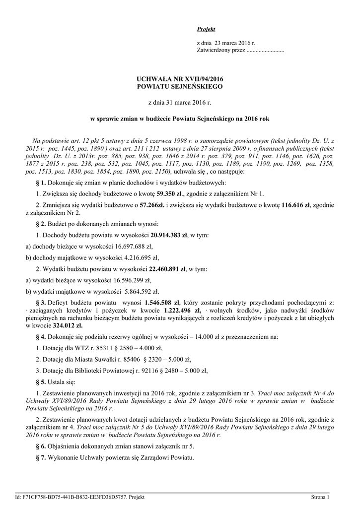 Projekt z dnia 23 marca 2016 r. Zatwierdzony przez ......................... UCHWAŁA NR XVII/94/2016 POWIATU SEJNEŃSKIEGO z dnia 31 marca 2016 r. w sprawie zmian w budżecie Powiatu Sejneńskiego na 2016 rok Na podstawie art. 12 pkt 5 ustawy z dnia 5 czerwca 1998 r. o samorządzie powiatowym (tekst jednolity Dz. U. z 2015 r. poz. 1445, poz. 1890 ) oraz art. 211 i 212 ustawy z dnia 27 sierpnia 2009 r. o finansach publicznych (tekst jednolity Dz. U. z 2013r. poz. 885, poz. 938, poz. 1646 z 2014 r. poz. 379, poz. 911, poz. 1146, poz. 1626, poz. 1877 z 2015 r. poz. 238, poz. 532, poz. 1045, poz. 1117, poz. 1130, poz. 1189, poz. 1190, poz. 1269, poz. 1358, poz. 1513, poz. 1830, poz. 1854, poz. 1890, poz. 2150), uchwala się , co następuje: § 1. Dokonuje się zmian w planie dochodów i wydatków budżetowych: 1. Zwiększa się dochody budżetowe o kwotę 59.350 zł., zgodnie z załącznikiem Nr 1. 2. Zmniejsza się wydatki budżetowe o 57.266zł. i zwiększa się wydatki budżetowe o kwotę 116.616 zł, zgodnie z załącznikiem Nr 2. § 2. Budżet po dokonanych zmianach wynosi: 1. Dochody budżetu powiatu w wysokości 20.914.383 zł, w tym: a) dochody bieżące w wysokości 16.697.688 zł, b) dochody majątkowe w wysokości 4.216.695 zł, 2. Wydatki budżetu powiatu w wysokości 22.460.891 zł, w tym: a) wydatki bieżące w wysokości 16.596.299 zł, b) wydatki majątkowe w wysokości 5.864.592 zł. § 3. Deficyt budżetu powiatu wynosi 1.546.508 zł, który zostanie pokryty przychodami pochodzącymi z: · zaciąganych kredytów i pożyczek w kwocie 1.222.496 zł, · wolnych środków, jako nadwyżki środków pieniężnych na rachunku bieżącym budżetu powiatu wynikających z rozliczeń kredytów i pożyczek z lat ubiegłych w kwocie 324.012 zł. § 4. Dokonuje się podziału rezerwy ogólnej w wysokości – 14.000 zł z przeznaczeniem na: 1. Dotację dla WTZ r. 85311 § 2580 – 4.000 zł, 2. Dotację dla Miasta Suwałki r. 85406 § 2320 – 5.000 zł, 3. Dotację dla Biblioteki Powiatowej r. 92116 § 2480 – 5.000 zł, § 5. Ustala się: 1. Zestawienie planowanych inwestycji na 2016 rok, zgodnie z załącznikiem nr 3. Traci moc załącznik Nr 4 do Uchwały XVI/89/2016 Rady Powiatu Sejneńskiego z dnia 29 lutego 2016 roku w sprawie zmian w budżecie Powiatu Sejneńskiego na 2016 r. 2. Zestawienie planowanych kwot dotacji udzielanych z budżetu Powiatu Sejneńskiego na 2016 rok, zgodnie z załącznikiem nr 4. Traci moc załącznik Nr 5 do Uchwały XVI/89/2016 Rady Powiatu Sejneńskiego z dnia 29 lutego 2016 roku w sprawie zmian w budżecie Powiatu Sejneńskiego na 2016 r. § 6. Objaśnienia dokonanych zmian stanowi załącznik nr 5. § 7. Wykonanie Uchwały powierza się Zarządowi Powiatu. Id: F71CF758-BD75-441B-B832-EE3FD36D5757. Projekt Strona 1 § 8. Uchwała podlega ogłoszeniu w Dzienniku Urzędowym Województwa Podlaskiego. § 9. Uchwała wchodzi w życie z dniem podjęcia. Przewodniczący Rady Ryszard Grzybowski Id: F71CF758-BD75-441B-B832-EE3FD36D5757. Projekt Strona 2 Załącznik Nr 1 do Uchwały Nr XVII/94/2016 Powiatu Sejneńskiego z dnia 31 marca 2016 r. Zmiany w tabeli dochodów budżetu Powiatu Sejneńskiego na 2016 rok. Dział Rodzaj: Porozumienia z AR Rodzaj: Porozumienia z jst Rodzaj: Własne Rozdział Paragraf 600 60014 0970 750 75020 0970 853 85333 0970 Rodzaj: Razem: 1 206 695,00 0,00 1 206 695,00 Razem: 1 405 000,00 0,00 1 405 000,00 Treść Przed zmianą Zmiana Po zmianie Transport i łączność 112 000,00 39 350,00 151 350,00 Drogi publiczne powiatowe 112 000,00 39 350,00 151 350,00 0,00 39 350,00 39 350,00 Administracja publiczna 6 000,00 10 000,00 16 000,00 Starostwa powiatowe 6 000,00 10 000,00 16 000,00 Wpływy z różnych dochodów Pozostałe zadania w zakresie polityki społecznej Powiatowe urzędy pracy 5 000,00 10 000,00 15 000,00 262 400,00 10 000,00 272 400,00 247 400,00 10 000,00 257 400,00 Wpływy z różnych dochodów Wpływy z różnych dochodów 0,00 10 000,00 10 000,00 Razem: 13 708 238,00 59 350,00 13 767 588,00 Razem: 4 535 100,00 0,00 4 535 100,00 Ogółem: 20 855 033,00 59 350,00 20 914 383,00 Zlecone Po zmianach: Dochody bieżące wynoszą 16.697.688,- zł., w tym środki z UE 61.227 zł Dochody majątkowe wynoszą 4.216.695,00 zł w tym: * dotacje i środki na inwestycje - 2.566.695,00 zł * dochody ze sprzedaży majątku - 1.650.000,00 zł Id: F71CF758-BD75-441B-B832-EE3FD36D5757. Projekt Strona 1 Załącznik Nr 2 do Uchwały Nr XVII/94/2016 Powiatu Sejneńskiego z dnia 31 marca 2016 r. Zmiany w tabeli wydatków budżetu Powiatu Sejneńskiego na 2016 rok. Rodzaj: Dział Rozdział Poroz. z JST Paragraf 854 85406 2320 Rodzaj: Dział Rozdział Treść Edukacyjna opieka wychowawcza Poradnie psychologiczno-pedagogiczne, w tym poradnie specjalistyczne Dotacje celowe przekazane dla powiatu na zadania bieżące realizowane na podstawie porozumień (umów) między jednostkami samorządu terytorialnego Razem: Przed zmianą 0,00 Zmiana Po zmianie 5 000,00 5 000,00 0,00 5 000,00 5 000,00 0,00 5 000,00 5 000,00 12 000,00 5 000,00 17 000,00 Własne Transport i łączność Przed zmianą 7 120 192,00 39 350,00 7 159 542,00 Drogi publiczne powiatowe 7 120 192,00 39 350,00 7 159 542,00 Paragraf 600 60014 Treść Zmiana Po zmianie 4010 Wynagrodzenia osobowe pracowników 600 000,00 33 550,00 633 550,00 4110 Składki na ubezpieczenia społeczne 105 000,00 5 800,00 110 800,00 4210 Zakup materiałów i wyposażenia 329 200,00 - 1 000,00 328 200,00 4610 Koszty postępowania sądowego i prokuratorskiego 0,00 1 000,00 1 000,00 Administracja publiczna 2 630 000,00 10 000,00 2 640 000,00 750 75020 Starostwa powiatowe 2 460 000,00 7 000,00 2 467 000,00 4010 Wynagrodzenia osobowe pracowników 1 420 000,00 10 000,00 1 430 000,00 4210 Zakup materiałów i wyposażenia 294 000,00 - 7 200,00 286 800,00 6060 Wydatki na zakupy inwestycyjne jednostek budżetowych 0,00 4 200,00 4 200,00 Pozostała działalność 20 000,00 3 000,00 23 000,00 Różne opłaty i składki 13 000