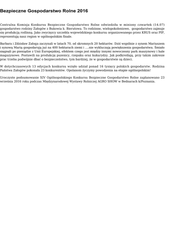 Bezpieczne Gospodarstwo Rolne 2016 Centralna Komisja Konkursu Bezpieczne Gospodarstwo Rolne odwiedziła w miniony czwartek (14.07) gospodarstwo rodziny Załogów z Bukowia k. Bierutowa. To rodzinne, wielopokoleniowe, gospodarstwo zajmuje się produkcją roślinną. Jako zwycięzcy szczebla wojewódzkiego konkursu organizowanego przez KRUS oraz PIP, reprezentują nasz region w ogólnopolskim finale. Barbara i Zdzisław Załoga zaczynali w latach 70, od skromnych 20 hektarów. Dziś wspólnie z synem Mariuszem i synową Marią gospodarują już na 400 hektarach ziemi i ….nie wykluczają powiększenia gospodarstwa. Śmiało sięgnęli po pieniądze z Unii Europejskiej, efektem czego jest między innymi nowoczesny park maszynowy i hale magazynowe. Postawili na produkcję pszenicy, rzepaku oraz kukurydzy. Jak podkreślają, przy takim zakresie prac trzeba podwójnie dbać o bezpieczeństwo, tym bardziej, że w gospodarstwie są dzieci. W dotychczasowych 13 edycjach konkursu wzięło udział ponad 16 tysięcy polskich gospodarstw. Rodzina Państwa Załogów pokonała 23 konkurentów. Opolanom życzymy powodzenia na etapie ogólnopolskim! Uroczyste podsumowanie XIV Ogólnopolskiego Konkursu Bezpieczne Gospodarstwo Rolne zaplanowano 23 września 2016 roku podczas Międzynarodowej Wystawy Rolniczej AGRO SHOW w Bednarach k/Poznania.
