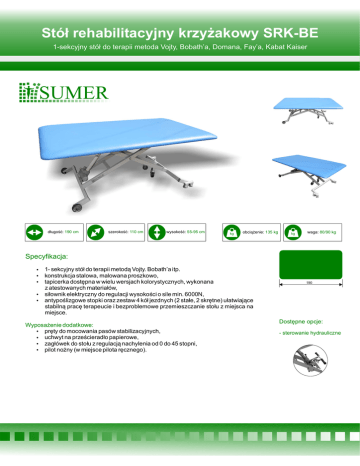 Stół rehabilitacyjny krzyżakowy SRK-BE 1-sekcyjny stół do terapii metoda Vojty, Bobath’a, Domana, Fay’a, Kabat Kaiser SUMER długość: 190 cm szerokość: 110 cm wysokość: 55-95 cm kg obciążenie: 135 kg kg waga: 80/90 kg Specyfikacja: 1- sekcyjny stół do terapii metodą Vojty. Bobath’a itp. konstrukcja stalowa, malowana proszkowo, tapicerka dostępna w wielu wersjach kolorystycznych, wykonana z atestowanych materiałów, siłownik elektryczny do regulacji wysokości o sile min. 6000N, antypoślizgowe stopki oraz zestaw 4 kół jezdnych (2 stałe, 2 skrętne) ułatwiające stabilną pracę terapeucie i bezproblemowe przemieszczanie stołu z miejsca na miejsce. Wyposażenie dodatkowe: pręty do mocowania pasów stabilizacyjnych, uchwyt na prześcieradło papierowe, zagłówek do stołu z regulacją nachylenia od 0 do 45 stopni, pilot nożny (w miejsce pilota ręcznego). 190 Dostępne opcje: - sterowanie hydrauliczne