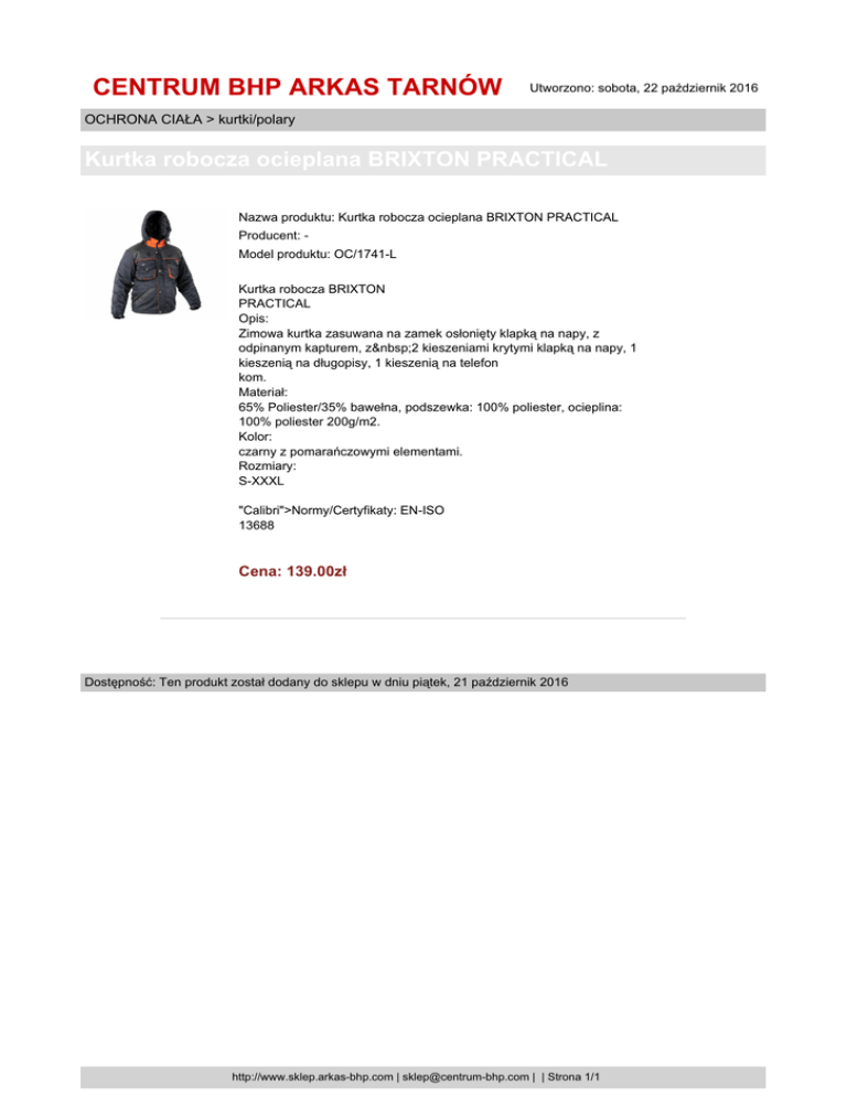CENTRUM BHP ARKAS TARNÓW Utworzono: sobota, 22 październik 2016 OCHRONA CIAŁA > kurtki/polary Kurtka robocza ocieplana BRIXTON PRACTICAL Nazwa produktu: Kurtka robocza ocieplana BRIXTON PRACTICAL Producent: Model produktu: OC/1741-L Kurtka robocza BRIXTON PRACTICAL Opis: Zimowa kurtka zasuwana na zamek osłonięty klapką na napy, z odpinanym kapturem, z 2 kieszeniami krytymi klapką na napy, 1 kieszenią na długopisy, 1 kieszenią na telefon kom. Materiał: 65% Poliester/35% bawełna, podszewka: 100% poliester, ocieplina: 100% poliester 200g/m2. Kolor: czarny z pomarańczowymi elementami. Rozmiary: S-XXXL "Calibri">Normy/Certyfikaty: EN-ISO 13688 Cena: 139.00zł Dostępność: Ten produkt został dodany do sklepu w dniu piątek, 21 październik 2016 http://www.sklep.arkas-bhp.com | [email protected] | | Strona 1/1