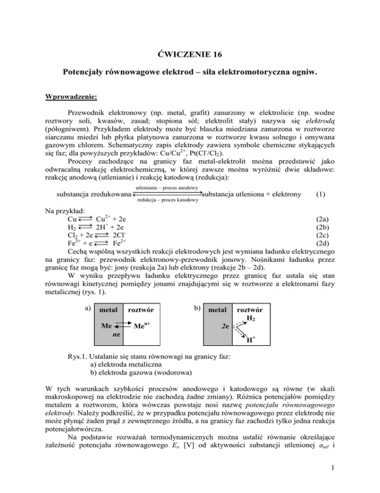 ĆWICZENIE 16 Potencjały równowagowe elektrod – siła