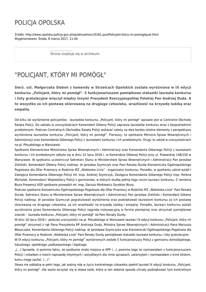 POLICJA OPOLSKA Źródło: http://www.opolska.policja.gov.pl/op/aktualnosci/5181,quotPolicjant-ktory-mi-pomoglquot.html Wygenerowano: Środa, 8 marca 2017, 11:44 Strona znajduje się w archiwum. "POLICJANT, KTÓRY MI POMÓGŁ" Sierż. szt. Małgorzata Słaboń z komendy w Strzelcach Opolskich została wyróżniona w IX edycji konkursu „Policjant, który mi pomógł”. 5 funkcjonariuszom pamiątkowe statuetki laureata konkursu i listy gratulacyjne wręczył między innymi Prezydent Rzeczypospolitej Polskiej Pan Andrzej Duda. A to wszystko za ich postawę skierowaną na drugiego człowieka, wrażliwość na krzywdę ludzką oraz empatię. Od kilku lat wyróżnienie policjantów - laureatów konkursu „Policjant, który mi pomógł” wpisane jest w Centralne Obchody Święta Policji. Do udziału w uroczystościach Komendant Główny Policji zaprasza laureatów konkursu wraz z bezpośrednimi przełożonymi. Podczas Centralnych Obchodów Święta Policji wskazać należy na dwa bardzo istotne elementy z perspektywy wyróżnienia laureatów konkursu „Policjant, który mi pomógł”. Pierwszy, to spotkanie Ministra Spraw Wewnętrznych i Administracji oraz Komendanta Głównego Policji z laureatami konkursu i ich przełożonymi. Drugi, to udział w uroczystościach na pl. Piłsudskiego w Warszawie. Spotkanie Kierownictwa Ministrstwa Spraw Wewnętrznych i Administracji oraz Komendanta Głównego Policji z laureatami konkursu i ich przełożonymi odbyło się w dniu 15 lipca 2016 r. w Komendzie Głównej Policji przy ul. Puławskiej 148/150 w Warszawie. W spotkaniu uczestniczył Sekretarz Stanu w Ministerstwie Spraw Wewnętrznych i Administracji Pan Jarosław Zieliński, Komendant Główny Policji nsdinsp. dr Jarosław Szymczyk oraz Pani Renata Durda Kierowniczka Ogólnopolskiego Pogotowia dla Ofiar Przemocy w Rodzinie IPZ „Niebieska Linia” - organizator konkursu. Ponadto, w spotkaniu udział wzięli I Zastępca Komendanta Głównego Policji mł. insp. Andrzej Szymczyk, Zastępca Komendanta Głównego Policji insp. Helena Michalak, Komendanci Wojewódzcy Policji z garnizonów, w których służbę pełnią tego roczni laureaci konkursu. Z ramienia Biura Prewencji KGP spotkanie prowadził mł. insp. Dariusz Minkiewicz Dyrektor Biura. Podczas spotkania Kierowniczka Ogólnopolskiego Pogotowia dla Ofiar Przemocy w Rodzinie IPZ „Niebieska Linia” Pani Renata Durda, Sekretarz Stanu w Ministerstwie Spraw Wewnętrznych i Administracji Pan Jarosław Zieliński i Komendant Główny Policji nadinsp. dr Jarosław Szymczyk pogratulowali wyróżnienia oraz podziękowali laureatom konkursu za ich postawę skierowaną na drugiego człowieka, za ich wrażliwość na krzywdę ludzką i empatię. Ponadto, laureaci konkursu zostali wyróżnienia przez Komendanta Głównego Policji nagrodą motywacyjną w formie pieniężnej oraz otrzymali pamiątkowe znaczki – laureata konkursu „Policjant, który mi pomógł” od Pani Renaty Durdy. W dniu 16 lipca 2016 r. podczas uroczystości na pl. Piłsudskiego w Warszawie laureaci IX edycji konkursu „Policjant, który mi pomógł” otrzymali z rąk Pana Prezydenta RP Andrzeja Dudy, Ministra Spraw Wewnętrznych i Administracji Pana Mariusza Błaszczaka, Komendanta Głównego Policji nadinsp. dr Jarosława Szymczyka oraz Kierowniczki Ogólnopolskiego Pogotowia dla Ofiar Przemocy w Rodzinie „Niebieska Linia” Pani Renaty Durdy pamiątkowe statuetki laureata konkursu i listy gratulacyjne. W IX edycji konkursu „Policjant, który mi pomógł” wyróżnionych zostało 5 funkcjonariuszy Policji z garnizonu dolnośląskiego, lubuskiego, opolskiego, podkarpackiego i śląskiego. „(...) Sprawiła, iż pomimo faktu, że spotkanie miało miejsce w KPP (...), pomimo tego że rozmawiałam z funkcjonariuszem Policji i mówiłam o moich naprawdę intymnych i wstydliwych dla mnie sprawach, uwierzyłam i rozmawiałam z kimś bliskim, komu mogę zaufać. (...)”. Słowa nie oddadzą w pełni tego, jak ważną rolę w życiu konkretnego człowieka spełnił laureat IX edycji konkursu „Policjant, który mi pomógł”. Ale warto wczytać się w słowa osób, które w ten właśnie sposób chciały podziękować tym konkretnym policjantom. st. asp. Marcin BŁAŻEJOWSKI - dzielnicowy KPP w Mielcu, KWP w Rzeszowie „(…) zakończył trwający kilkanaście lat czas przemocy w naszej rodzinie. To policjant, który nie bał się układów mojego ojca. W momencie zagrożenia życia reagował błyskawicznie, bez wahania udzielając fachowej pomocy i pomagał w trwającym procesie. (...) jest człowiekiem o wielkim, wrażliwym sercu, do każdej prowadzonej sprawy podchodzi indywidualnie, ze zrozumieniem, podejmując właściwe działania, które później przynoszą oczekiwane rezultaty (…)”. /mieszkanka gminy Borowa/ W Policji od 12 lat. Po ukończeniu szkolenia podstawowego zawodowego swoje doświadczenie zawodowe zdobywał w służbie prewencyjnej jako policjant komórki patrolowo-interwencyjnej, a od prawie 10 lat jako dzielnicowy. Dzięki pracy w terenie, zaangażowaniu oraz dużej empatii wiedział, które rodziny potrzebują pomocy oraz wiedział jak im pomóc. St. aspirant Marcin Błażejowski to człowiek godny zaufania. Zaufali mu ludzie, którzy potrzebowali i w dalszym ciągu potrzebują pomocy. Z zaangażowaniem, rzetelnością, sumiennością realizuje nałożone na niego zadania służbowe. Jest żonaty i ma dwoje dzieci. Interesuje się motoryzacją i muzyką, a wolny czas spędza jeżdżąc na rowerze. sierż. sztab. Patrycja DĄBROWNA - dzielnicowa KP w Nowej Rudzie, KPP w Kłodzku, KWP we Wrocławiu „(...) sprawia, że zwykli ludzie, często przerażeni i zrezygnowani, zaczynają ponownie wierzyć, że nie są sami i że ktoś jest gotowy im bezinteresownie pomóc i że ktoś o nich dba. (…) Postawa Pani Dzielnicowej powoduje zmiany w sposobie, w jaki społeczeństwo postrzega organy prawa w Polsce. Postrzega je, jako organy, którym można ufać i