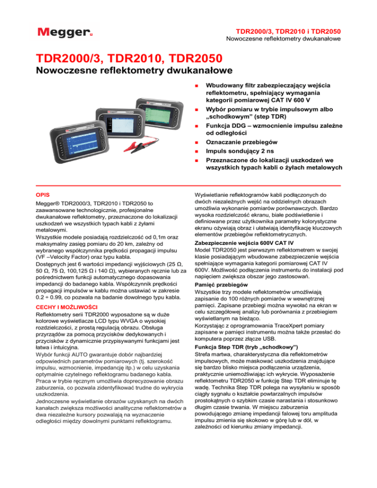 TDR2000/3, TDR2010 i TDR2050 Nowoczesne reflektometry dwukanałowe TDR2000/3, TDR2010, TDR2050 Nowoczesne reflektometry dwukanałowe OPIS Megger® TDR2000/3, TDR2010 i TDR2050 to zaawansowane technologicznie, profesjonalne dwukanałowe reflektometry, przeznaczone do lokalizacji uszkodzeń we wszystkich typach kabli z żyłami metalowymi. Wszystkie modele posiadają rozdzielczość od 0,1m oraz maksymalny zasięg pomiaru do 20 km, zależny od wybranego współczynnika prędkości propagacji impulsu (VF –Velocity Factor) oraz typu kabla. Dostępnych jest 6 wartości impedancji wyjściowych (25 Ω, 50 Ω, 75 Ω, 100,125 Ω i 140 Ω), wybieranych ręcznie lub za pośrednictwem funkcji automatycznego dopasowania impedancji do badanego kabla. Współczynnik prędkości propagacji impulsów w kablu można ustawiać w zakresie 0.2 ÷ 0.99, co pozwala na badanie dowolnego typu kabla. CECHY I MOŻLIWOŚCI Reflektometry serii TDR2000 wyposażone są w duże kolorowe wyświetlacze LCD typu WVGA o wysokiej rozdzielczości, z prostą regulacją obrazu. Obsługa przyrządów za pomocą przycisków dedykowanych i przycisków z dynamicznie przypisywanymi funkcjami jest łatwa i intuicyjna. Wybór funkcji AUTO gwarantuje dobór najbardziej odpowiednich parametrów pomiarowych (tj. szerokość impulsu, wzmocnienie, impedancję itp.) w celu uzyskania optymalnie czytelnego reflektogramu badanego kabla. Praca w trybie ręcznym umożliwia doprecyzowanie obrazu zaburzenia, co pozwala zidentyfikować trudne do wykrycia uszkodzenia. Jednoczesne wyświetlanie obrazów uzyskanych na dwóch kanałach zwiększa możliwości analityczne reflektometrów a dwa niezależne kursory pozwalają na wyznaczenie odległości między dowolnymi punktami reflektogramu. ■ Wbudowany filtr zabezpieczający wejścia reflektometru, spełniający wymagania kategorii pomiarowej CAT IV 600 V ■ Wybór pomiaru w trybie impulsowym albo „schodkowym” (step TDR) ■ Funkcja DDG – wzmocnienie impulsu zależne od odległości ■ Oznaczanie przebiegów ■ Impuls sondujący 2 ns ■ Przeznaczone do lokalizacji uszkodzeń we wszystkich typach kabli o żyłach metalowych Wyświetlanie reflektogramów kabli podłączonych do dwóch niezależnych wejść na oddzielnych obrazach umożliwia wykonanie pomiarów porównawczych. Bardzo wysoka rozdzielczość ekranu, białe podświetlenie i definiowane przez użytkownika parametry kolorystyczne ekranu ożywiają obraz i ułatwiają identyfikację kluczowych elementów przebiegów reflektometrycznych. Zabezpieczenie wejścia 600V CAT IV Model TDR2050 jest pierwszym reflektometrem w swojej klasie posiadającym wbudowane zabezpieczenie wejścia spełniające wymagania kategorii pomiarowej CAT IV 600V. Możliwość podłączenia instrumentu do instalacji pod napięciem zwiększa obszar jego zastosowań. Pamięć przebiegów Wszystkie trzy modele reflektometrów umożliwiają zapisanie do 100 różnych pomiarów w wewnętrznej pamięci. Zapisane przebiegi można wywołać na ekran w celu szczegółowej analizy lub porównania z przebiegiem wyświetlanym na bieżąco. Korzystając z oprogramowania TraceXpert pomiary zapisane w pamięci instrumentu można także przesłać do komputera poprzez złącze USB. Funkcja Step TDR (tryb „schodkowy”) Strefa martwa, charakterystyczna dla reflektometrów impulsowych, może maskować uszkodzenia znajdujące się bardzo blisko miejsca podłączenia urządzenia, praktycznie uniemożliwiając ich wykrycie. Wyposażenie reflektometru TDR2050 w funkcję Step TDR eliminuje tę wadę. Technika Step TDR polega na wysyłaniu w sposób ciągły sygnału o kształcie powtarzalnych impulsów prostokątnych o szybkim czasie narastania i stosunkowo długim czasie trwania. W miejscu zaburzenia powodującego zmianę impedancji falowej toru amplituda impulsu zmienia się skokowo w górę lub w dół, w zależności od kierunku zmiany impedancji. TDR2000/3, TDR2010 i TDR2050 Obraz reflektometryczny nie zawiera wielokrotnych odbić i pozwala na identyfikację uszkodzeń w bardzo bliskiej odległości od reflektometru, najczęściej niemożliwych do wykrycia standardowym reflektometrem impulsowym. Funkcja DDG Model TDR2050 posiada funkcję automatycznie regulowanego wzmocnienia zależnie od odległości (DDG – Distance Dependent Gain). Zastosowane tej funkcji kompensuje tłumienność badanego toru kablowego poprzez stopniowe zwiększanie wzmocnienia odbitego sygnału w zależności od odległości rejestrowanego zaburzenia od reflektometru. W ten sposób prezentowane na reflektogramie obrazy zaburzeń tej samej wartości mają podobną amplitudę niezależnie od umiejscowienia na przebiegu. Automatyczna lokalizacja uszkodzeń Autorska funkcja AutoFind firmy Megger umożliwia szybką lokalizację wyraźnych uszkodzeń kabla. Pierwsze naciśnięcie przycisku AutoFind rozpoczyna samoczynną lokalizację miejsca uszkodzenie kabla, automatycznie dobierając parametry pomiaru (zakres i wzmocnienie) i ustawiając kursor w miejscu pierwszego najpoważniejszego zaburzenia widocznego na reflektogramie. Kolejne naciśnięcia przycisku AutoFind lokalizują następne wykryte zaburzenia. Funkcja FindEnd Model TDR2050 posiada również funkcję automatycznej identyfikacji końca badanego kabla, co przydaje się na przykład wtedy, gdy konieczne jest szybkie zmierzenie odległości do końca kabla albo długości kabla. Użytkownicy preferujący ręczną kontrolę pomiaru nie muszą korzystać z funkcji FindEnd i zawsze mogą manualnie doprecyzować pozycję kursora na wybranym elemencie przebiegu reflektometrycznego. Definiowanie kolorów ekranu Reflektometry używane są w różnych warunkach oświetlenia a użytkownicy mogą mieć szczególne wymagania w odniesieniu do barw (wynikające na przykład z wady wzroku), stąd ważna jest możliwość samodzielnego zdefiniowania parametrów kolorystycznych ekranu. W reflektometrach TDR2010 i TDR2050 oprócz dwóch standardowych ustawień – 