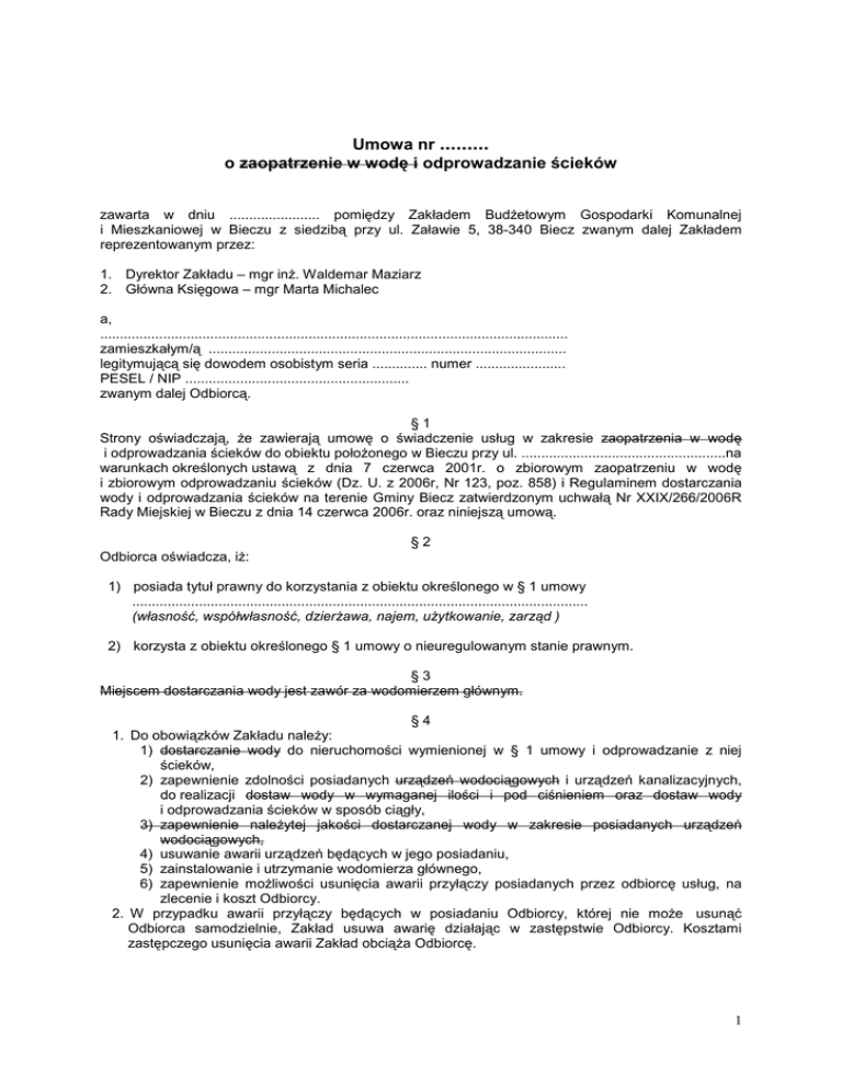 Umowa nr ......... o zaopatrzenie w wodę i odprowadzanie ścieków zawarta w dniu ....................... pomiędzy Zakładem BudŜetowym Gospodarki Komunalnej i Mieszkaniowej w Bieczu z siedzibą przy ul. Załawie 5, 38-340 Biecz zwanym dalej Zakładem reprezentowanym przez: 1. Dyrektor Zakładu – mgr inŜ. Waldemar Maziarz 2. Główna Księgowa – mgr Marta Michalec a, ....................................................................................................................... zamieszkałym/ą ........................................................................................... legitymującą się dowodem osobistym seria .............. numer ....................... PESEL / NIP ......................................................... zwanym dalej Odbiorcą. §1 Strony oświadczają, Ŝe zawierają umowę o świadczenie usług w zakresie zaopatrzenia w wodę i odprowadzania ścieków do obiektu połoŜonego w Bieczu przy ul. ....................................................na warunkach określonych ustawą z dnia 7 czerwca 2001r. o zbiorowym zaopatrzeniu w wodę i zbiorowym odprowadzaniu ścieków (Dz. U. z 2006r, Nr 123, poz. 858) i Regulaminem dostarczania wody i odprowadzania ścieków na terenie Gminy Biecz zatwierdzonym uchwałą Nr XXIX/266/2006R Rady Miejskiej w Bieczu z dnia 14 czerwca 2006r. oraz niniejszą umową. §2 Odbiorca oświadcza, iŜ: 1) posiada tytuł prawny do korzystania z obiektu określonego w § 1 umowy .................................................................................................................... (własność, współwłasność, dzierŜawa, najem, uŜytkowanie, zarząd ) 2) korzysta z obiektu określonego § 1 umowy o nieuregulowanym stanie prawnym. §3 Miejscem dostarczania wody jest zawór za wodomierzem głównym. §4 1. Do obowiązków Zakładu naleŜy: 1) dostarczanie wody do nieruchomości wymienionej w § 1 umowy i odprowadzanie z niej ścieków, 2) zapewnienie zdolności posiadanych urządzeń wodociągowych i urządzeń kanalizacyjnych, do realizacji dostaw wody w wymaganej ilości i pod ciśnieniem oraz dostaw wody i odprowadzania ścieków w sposób ciągły, 3) zapewnienie naleŜytej jakości dostarczanej wody w zakresie posiadanych urządzeń wodociągowych, 4) usuwanie awarii urządzeń będących w jego posiadaniu, 5) zainstalowanie i utrzymanie wodomierza głównego, 6) zapewnienie moŜliwości usunięcia awarii przyłączy posiadanych przez odbiorcę usług, na zlecenie i koszt Odbiorcy. 2. W przypadku awarii przyłączy będących w posiadaniu Odbiorcy, której nie moŜe usunąć Odbiorca samodzielnie, Zakład usuwa awarię działając w zastępstwie Odbiorcy. Kosztami zastępczego usunięcia awarii Zakład obciąŜa Odbiorcę. 1 §5 Dostarczenie wody do nieruchomości Odbiorcy nastąpi zgodnie z obowiązującymi przepisami 3 z przeznaczeniem na cele ................... w szacunkowej ilości ............... m miesięcznie o jakości odpowiadającej wymogom określonym w odrębnych przepisach. §6 Zakład zobowiązuje się do ciągłego odbioru i składzie określonym w obowiązujących przepisach. z nieruchomości ścieków o stanie §7 1. Wodomierz główny jest własnością Zakładu. 2. Koszty zainstalowania i utrzymania wodomierza głównego pokrywa Zakład. 3. Koszty zakupu, naprawa, konserwacja, legalizacja urządzenia pomiarowego wskazującego ilość odprowadzanych ścieków naleŜą do Odbiorcy. 4. Koszty zakupu, konserwacja, legalizacja wodomierza dodatkowego naleŜą do Odbiorcy. §8 Odbiorca zobowiązany jest w szczególności do: 1) utrzymania właściwego stanu technicznego, eksploatacji i remontów naleŜących do niego instalacji i urządzeń wodociągowych i kanalizacyjnych w tym przyłączy wodociągowokanalizacyjnych, 2) powierzenia usuwania awarii posiadanych przyłączy, powierzenia budowy lub dokonania zmian w instalacji oraz urządzeniach wodociągowych i kanalizacyjnych naleŜących do Odbiorcy osobom posiadającym odpowiednie uprawnienia i kwalifikacje, 3) natychmiastowego powiadomienia Zakładu o awarii posiadanych przyłączy, 4) wydzielenia łatwo dostępnego miejsca za pierwszą ścianą po wejściu przyłącza przeznaczonego do zainstalowania zestawu wodomierza zgodnie z projektem i obowiązującymi przepisami, utrzymania tego miejsca w naleŜytym stanie i zabezpieczenia wodomierza głównego przed zalaniem zamarznięciem, uszkodzeniem mechanicznym oraz dostępem osób niepowołanych. W budynkach mieszkalnych wielorodzinnych, zamieszkania zbiorowego i uŜyteczności publicznej miejscem tym powinno być osobne pomieszczenie. 5) wprowadzania do kanalizacji ścieków o stanie i składzie nie zagraŜającym prawidłowej eksploatacji instalacji, sieci i innych urządzeń kanalizacyjnych, 6) umoŜliwienia osobom upowaŜnionym przez Zakład dostępu wraz z niezbędnym sprzętem do nieruchomości w celu wykonania czynności związanych z eksploatacją, konserwacją i usuwaniem awarii urządzeń wodociągowych i kanalizacyjnych będących własnością Zakładu oraz dokonania kontroli, wymiany i odczytu wodomierza głównego. 7) utrzymania uŜytkowanej nieruchomości w sposób nie powodujący utrudnień w prawidłowym funkcjonowaniu sieci i przyłączy wodociągowych oraz kanalizacyjnych, a w szczególności w przypadku jakichkolwiek robót budowlanych prowadzenie ich zgodnie z projektem budowlanym, warunkami technicznymi wykonania i odbioru robót budowlano – montaŜowych, Polskimi Norami i innymi przepisami mającymi zastosowanie, 8) zainstalowania i utrzymania zaworów antyskaŜeniowych zgodnie z obowiązującymi Polskimi Normami, 9) natychmiastowego powiadomienia Zakładu o kaŜdorazowej zmianie przeznaczenia zuŜywanej wody. 1. §9 Zakład nie ponosi odpowiedzialności za ograniczenie albo wstrzymanie dostaw wody bądź ograniczenie lub wstrzymanie odbioru ścieków wywołane: 1) działaniem siły wyŜszej albo z wyłącznej winy Odbiorcy lub osoby trzeciej, za którą Za