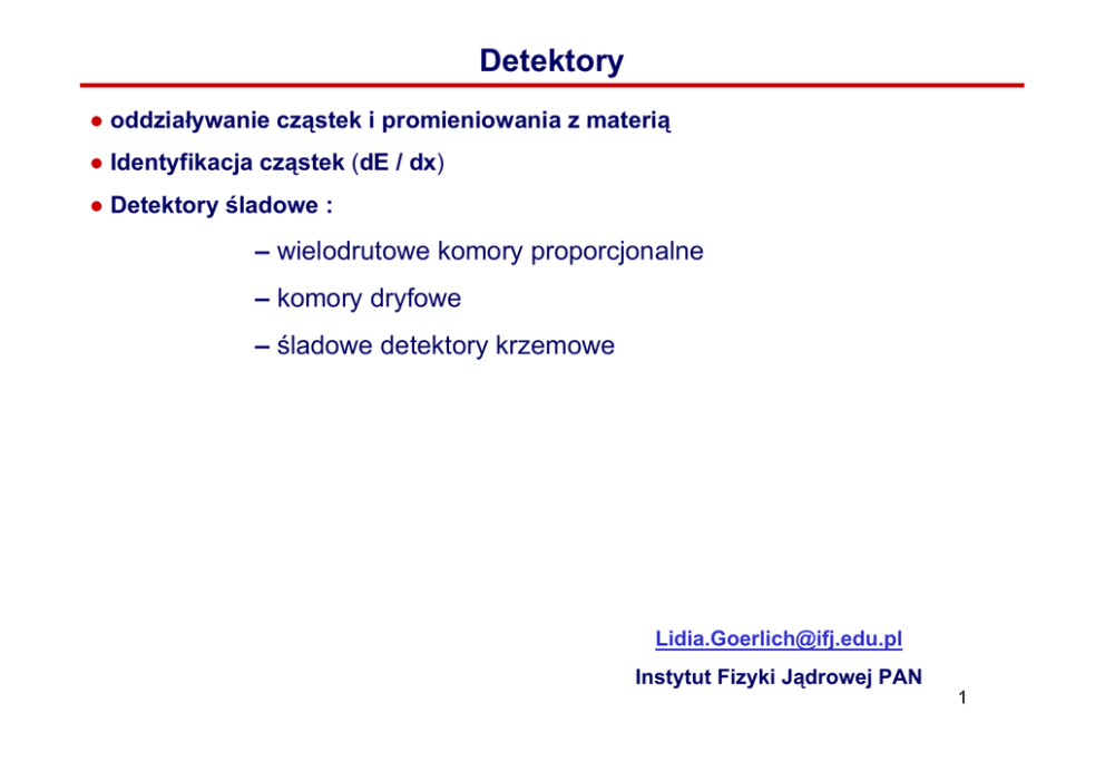 Detektory ● oddziaływanie cząstek i promieniowania z materią ● Identyfikacja cząstek (dE / dx) ● Detektory śladowe : – wielodrutowe komory proporcjonalne – komory dryfowe – śladowe detektory krzemowe [email protected] Instytut Fizyki Jądrowej PAN 1 Detektory fizyki cząstek służą do rejestracji: ● położenia cząstki ( detektory śladowe cząstek naładowanych ) → tor / trajektoria cząstki → ładunek i pęd, jeżeli detektor jest umieszczony w polu magnetycznym ● czasu pojawienia się cząstki ● energii cząstki ● pozwalają na identyfikację cząstek np. poprzez jednoczesny pomiar prędkości i pędu ( definiujący masę spoczynkową cząstki); na podstawie ich oddziaływań silnych, elektromagnetycznych lub słabych z materią Metody detekcji cząstek opierają się na fizyce oddziaływania cząstek z materią Postęp w badaniach fizyki cząstek elementarnych jest ściśle powiązany z rozwojem technik przyspieszania oraz detekcji cząstek, jak również stowarzyszonej z nimi elektroniki. 2 Detekcja cząstek jest możliwa dzięki ich oddziaływaniu z materią, efekt takiego oddziaływania musi być w jakiś sposób obserwowany / zmierzony. Bardzo ważną rolę w procesach oddziąływania cząstek z materią odgrywają oddziaływania elektromagnetyczne : ● jonizacja ośrodka przez cząstki naładowane ( tory cząstek w detektorach śladowych) ciężkie cząstki o masie m > melektron elektrony i pozytony ● promieniowanie hamowania ( bremsstrahlung ) elektrony i pozytony ● oddziaływanie fotonów z materią ( kalorymetry elektromagnetyczne ) : – efekt fotoelektryczny – rozpraszanie Comptona – kreacja par e+e¯ ● inne ważne procesy elektromagnetyczne : – zjawisko luminescencji ( scyntylacji ) – rozpraszanie wielokrotne (rozpraszanie kulombowskie ) – promieniowanie Czerenkowa 3 Cząstka naładowana przechodząc przez ośrodek przekazuje mu energię w procesach : ● jonizacji - wybijanie elektronów od atomów ośrodka ● wzbudzenia atomów/cząsteczek ośrodka → rejestracja światła scyntylacji, promieniowania Czerenkowa , sygnałów od par elektron-dziura w licznikach półprzewodnikowych. Jonizacyjne straty energii cząstek naładownych Wzór Bethego-Blocha – średnia strata energii cząstki na jednostkę przebytej drogi Z, A – liczba atomowa i masowa atomów ośrodka; I δ liczba masowa A – liczba nukleonów w jądrze danego pierwiastka liczba atomowa Z – liczba protonów w jądrze potencjął jonizacji (dla większości materiałów ~ (10eV) · Z; – – poprawka związana z polaryzacją ośrodka, opisująca jak pole elektryczne cząstki jest ekranowane przez rozkład gęstości ładunku elektronu w ośrodku; z – ładunek cząstki w jednostkach e, β = v / c – jej prędkość 4 Jonizacyjne straty energii w różnych ośrodkach Dla ciężkich cząstek ( m >> me) straty jonizacyjne zależą prędkości β − Relatywistyczny wzrost ~ ln( γ ) ~1/β2 [ dE 1 ∝ 2 ln(βγ ) − β 2 + K 1 dx β Człon 1/β – dominuje dla małych p straty energii maleją szybko z rosnącą prędkością 2 minimum ] stała Człon ln( βγ ) – dominuje przy dużych pędach ” relatywistyczny wzrost ” pole elektryczne poprzeczne pole elektryczne cząstki ~ γ ze wzrostem energii ważne odległe zderzenia Minimum jonizacji dla βγ = p/m ~3.5 dla wszystkich cząstek β = p / E, γ = E / m, βγ = p / m Położenie minimum jonizacji mało zależy od rodzaju ośrodka. ( dE/dx )min ~ 1- 2 MeV g¯1 cm2 (oprócz5H2 ) Identyfikacja cząstek poprzez dE/dx ● Jonizacyjne straty energii dE/dx zależą tylko od β, są niezależne od masy cząstki ● cząstki o danym pędzie i różnych masach mają różne dE/dx ● pomiar pędu cząstki ( z zakrzywienia jej toru w polu magnetycznym ) + pomiar dE/dx ( prędkość cząstki ) definiuje masę cząstki → metoda identyfikacji cząstek efektywna dla niezbyt dużych pędów Rozkłady dE/dx dla mionów (µ), pionów (π), kaonów (K), protonów (p) i deuteru (D) uzyskane w komorze projekcji czasowej ( Time Projection Chamber, TPC ) β=p/E 6 Detektory pojedynczych cząstek naładowanych wielodrutowe komory proporcjonalne Detektor składa się z dwóch płaszczyzn katodowych m-dzy którymi rozmieszczonych jest wiele drutów anodowych. Elektrody znajdują się w ośrodku gazowym. ● naładowana cząstka przechodząc przez licznik gazowy powoduje jonizację ośrodka → jony dodatnie i e¯ poruszają się w polu elektrycznym w kierunku odpowiednich elektrod Typowe parametry ● druty anodowe: średnica = 20 µm rozmieszczone co 2 mm ● odległości płaszczyzn katodowych ~12 mm ● różnica potencjałów ~ 5 kV, ● gaz : mieszanina argonu i izobutanu ● przestrzenna zdolność rozdzielcza : ~ 1mm paskowe katody ~ 0.050 mm ( pomiar środka ciężkości impulsu katodowego) ● jony dodatnie dryfują w kierunku katody ● uwolnione elektrony podążają do anody ● przy odpowiednio dużej różnicy potencjałów energia uzyskana w polu elektrycznym przez pierwotne elektrony prowadzi do wtórnych jonizacji i kaskadowego powielania ładunku rejestrowanego przez anodę wzmocnienie gazowe ~103 – 106 Położenie cząstki wyznacza się z pozycju drutów, do których dotarła 7 kaskada wtórnej jonizacji wielodrutowe komory proporcjonalne Georges Charpak 1968 – konstrukcja wielodrutowej komory proporcjonalnej 1992 – Nagroda Nobla ” for his invention and development of particle detectors, in particular the multiwire proprtional chamber (MWPC) ” Pole elektryczne komory MWPC Obecnie MWPC są rzadko stosowane Wysoka rozdzielczość przestrzenna wymagałaby dużej liczby drutów (ze wzmacniaczami) umieszczonych blisko siebie → problemy techniczne i finansowe 8 Komora dryfowa – komora proporcjonalna, w której elektrony z pierwotnej jonizacji dryfują na dłuższym odcinku w obszarze słabego pola elektrycznego zanim osiągną obszar wzmocnienia z silnym polem w pobliżu anody. Rejestracja czas