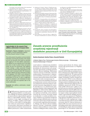 Higiena żywności i pasz Proceedings of the fourth meeting of the international electrophoresis society. 1984, 471–473. 45.Rehbein H., Kress G., Schmidt T.: Application of PCR SSCP to species identification of fishery products. J. Sci. Food Agric. 1997, 74, 35–41. 46. Skarpeid H., Elin Moe R., Indahl U.: Detection of mechanically recovered meat and head meat from cattle in ground beef mixtures by multivariate analysis of isoelectric focusing protein profiles. Meat Sci. 2001, 57, 227–234. 47.Skarpeid H.J., Kvaal K., Hildrum K.I.: Identification of animal species in ground meat mixtures by multivariate analysis of isoelectric focusing protein profiles. Electrophoresis. 1998, 19, 3103–3109. 48. Slattery W.J., Sinclair A.J.: Differentiation of meat according to species by the electrophoretic separation of muscle lactate dehydrogenase and esterase isoenzymes and isoelectric focusing of soluble muscle proteins. Aust. Vet. J. 1983, 60, 47–51. 49.Westermeier R.: Electophoresis in Practice, VCH Verlagsgesellschaft mbH, D-69451 Weinheim, 2.ed., 1997. 50. Martinez I., Jakobsen Friis T., Seppola M.: Requirements for the application of protein sodium dodecyl sulfate-polyacrylamide gel electrophoresis and randomly amplified polymorphic DNA analyses to product speciation. Electrophoresis 2001, 22, 1526–1533. Legal principles for the renewal of feed additives authorisation in European Union Kowalczyk E., Patyra E., Kwiatek K., Department of Hygiene of Animal Feedingstuffs, National Veterinary Research Institute in Pulawy This article presents the guidance and also detailed information concerning the procedure of the renewal and also the documents that should be submitted while applying for the feed additive authorisation. Feed additives are very important part of the whole feed sector. In order to protect human and animal health and also the environment, feed additives should undergo a safety assessment through a Community procedure before being placed on the market, used or processed within the Community. Only those additives that were authorized according to the Regulation 1831/2003, can be released to the market in European Union. In order to renew the authorisation for the next 10 years, an application should be submitted to the Commission not later than one year before the expiration date of the current authorisation. Keywords: feed additives, authorisation, renewal procedure, EU. D odatki paszowe stanowią coraz większą grupę produktów na rynku paszowym, dlatego też istotnym zadaniem stało się wprowadzenie odpowiednich regulacji, które to zapewniłyby kontrolę i bezpieczeństwo w tym ciągle rozwijającym się sektorze. W 2003 r. wydano rozporządzanie (WE) nr 1831/2003 (1), którego głównym celem jest ustanowienie wspólnotowej procedury dotyczącej zezwalania na wprowadzanie do obrotu i stosowanie dodatków paszowych, a także ustanowienie 586 51. Minkiewicz P., Dziuba J., Nałęcz D.: Współczesne metody rozdziału oraz badania struktury peptydów i białek żywności. Modern methods of separation and research of peptides structure and proteins of food. Przem. Spoż. 2000, 12, 34–37. 52. Elektroforeza przykłady zastosowań. Opracowanie zbiorowe pod redakcją Bogdana Walkowiaka i Violetty Kochmańskiej, Amersham Biosciences, Łódź, Warszawa, październik 2002 rok, http://www.biofizyka.p.lodz.pl/elektroforeza.pdf 53. Hofmann K.: Principal problems in the identification of meat species of slaughter animals using electrophoretic methods. In: Biochemical identification of meat species. Ed. R.L.S. Patterson. Elsevier, London, 1985, 9–31. 54.Winterø A., Thomsen P., Davies W.: A comparison of DNA-hybridization, immunodiffusion, countercurrent immunoelectrophoresis and isoelectric focusing for detecting the admixture of pork to beef. Meat Sci. 1990, 27, 75–85. 55. Escuredo P.R., Ayala A., Parrado J.: Use of electrophoretic titration curves in the purification of a β-1,3-glucanase from Oerskovia xanthineolytica. Biotechnol Tech. 1997, 11, 63–66. 56.Esteve-Romero J.S., Yman I.M., Bossi A., Righetti P.G.: Fish species identification by isoelectric focusing of parvalbumins in immobilized pH gradients. Electrophoresis. 1996, 17, 1380–1385. 57. Dooley J., Paine K., Stephen D., Garrett S.D., Brown H.M.: Detection of meat species using TaqMan real-time PCR assays. Meat Sci. 2004, 68, 431–438. 58.Kwiatek K., Różycki M., Rzeżutka A., Mizak B.: Zastosowanie reakcji PCR do detekcji materiału genetycznego Listeria monocytogenes z wykorzystaniem różnego typu polimeraz DNA. Med. Weter. 2003, 59, 277–368. 59. Bottero M.T., Civera T., Nucera D., Turi R.M.: Design of Universal Primers for the Detection of Animal Tissues in Feedstuff. Vet Res Commun. 2003, 27, 667–669. 60. Parkanyi V., Ondruska L., Vasicek D., Slamecka J.: Multilevel D-loop PCR identification of hunting game. Appl Transl Genomics. 2014, 3, 1–7. Dr Mirosław Różycki, Zakład Parazytologii i Chorób Inwazyjnych, Państwowy Instytut Weterynaryjny – Państwowy Instytut Badawczy, Aleja Partyzantów 57, 24-100 Puławy, e-mail: [email protected] Zasady prawne przedłużenia urzędowej rejestracji dodatków paszowych w Unii Europejskiej Ewelina Kowalczyk, Ewelina Patyra, Krzysztof Kwiatek z Zakładu Higieny Pasz, Państwowego Instytutu Weterynaryjnego – Państwowego Instytutu Badawczego w Puławach zasad nadzoru i etykietowania dodatków paszowych oraz premiksów. Podstawową przesłanką do ustanowienia tych przepisów było zapewnienie wysokiego poziomu ochrony zdrowia ludzkiego, dobrostanu i zdrowia zwierząt, środowiska, interesów użytkowników i konsumentów w odniesieniu do dodatków paszowych, przy jednoczesnym zapewnieniu skuteczności funkcjonowania rynku wewnętrznego (1). Celem stosowania dodatków paszowych jest podniesienie wartości odżywczych paszy; polepszenie strawności poprzez zastosowanie enzymów degradujących czynniki antyodżywcze czy zahamowanie patogennego działania mikroor