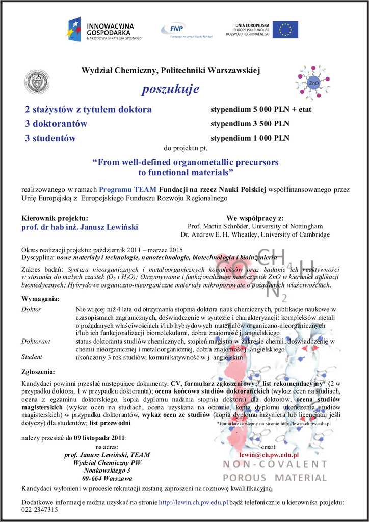 Wydzia³ Chemiczny, Politechniki Warszawskiej poszukuje 2 sta¿ystów z tytu³em doktora 3 doktorantów 3 studentów stypendium 5 000 PLN + etat stypendium 3 500 PLN stypendium 1 000 PLN do projektu pt. “From well-defined organometallic precursors to functional materials” realizowanego w ramach Programu TEAM Fundacji na rzecz Nauki Polskiej wspó³finansowanego przez Uniê Europejsk¹ z Europejskiego Funduszu Rozwoju Regionalnego Kierownik projektu: We wspó³pracy z: prof. dr hab in¿. Janusz Lewiñski Prof. Martin Schröder, University of Nottingham Dr. Andrew E. H. Wheatley, University of Cambridge Okres realizacji projektu: paŸdziernik 2011 – marzec 2015 Dyscyplina: nowe materia³y i technologie, nanotechnologie, biotechnologia i bioin¿ynieria Zakres badañ: Synteza nieorganicznych i metaloorganicznych kompleksów oraz badanie ich reaktywnoœci w stosunku do ma³ych cz¹stek (O2 i H2O); Otrzymywanie i funkcjonalizacja nanocz¹stek ZnO w kierunku aplikacji biomedycznych; Hybrydowe organiczno-nieorganiczne materia³y mikroporowate o po¿¹danych w³aœciwoœciach. Wymagania: Doktor Doktorant Student Nie wiêcej ni¿ 4 lata od otrzymania stopnia doktora nauk chemicznych, publikacje naukowe w czasopismach zagranicznych, doœwiadczenie w syntezie i charakteryzacji: kompleksów metali o po¿¹danych w³aœciwoœciach i/lub hybrydowych materia³ów organiczno-nieorganicznych i/lub ich funkcjonalizacji biomoleku³ami, dobra znajomoœæ j. angielskiego status doktoranta studiów chemicznych, stopieñ magistra w zakresie chemii, doœwiadczenie w chemii nieorganicznej i metaloorganicznej, dobra znajomoœæ j. angielskiego ukoñczony 3 rok studiów, komunikatywnoœæ w j. angielskim Zg³oszenia: Kandydaci powinni przes³aæ nastêpuj¹ce dokumenty: CV, formularz zg³oszeniowy;* list rekomendacyjny* (2 w przypadku doktora, 1 w przypadku doktoranta); ocena koñcowa studiów doktoranckich (wykaz ocen na studiach, ocena z egzaminu doktorskiego, kopia dyplomu nadania stopnia doktora) dla doktorów, ocena studiów magisterskich (wykaz ocen na studiach, ocena uzyskana na obronie, kopia dyplomu ukoñczenia studiów magisterskich) w przypadku doktorantów, wykaz ocen ze studiów (kopia dyplomu in¿yniera lub licencjata, jeœli dotyczy) dla studentów; list przewodni *formu larz d ostêpny na stronie http://lewin.ch.pw.edu.pl nale¿y przes³aæ do 09 listopada 2011: na adres: email: prof. Janusz Lewiñski, TEAM [email protected] Wydzia³ Chemiczny PW Noakowskiego 3 00-664 Warszawa Kandydaci wy³onieni w procesie rekrutacji zostan¹ zaproszeni na rozmowê kwalifikacyjn¹. Dodatkowe informacje mo¿na uzyskaæ na stronie http://lewin.ch.pw.edu.pl b¹dŸ telefonicznie u kierownika projektu: 022 2347315